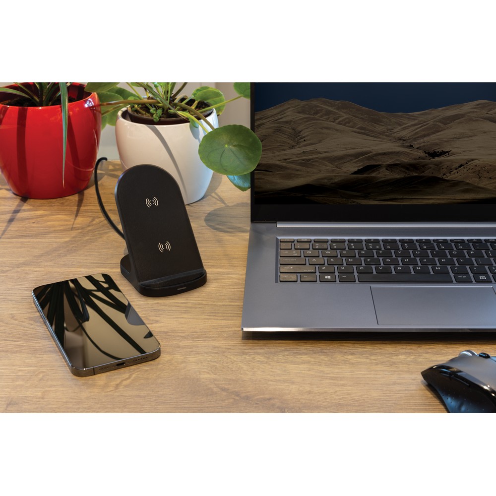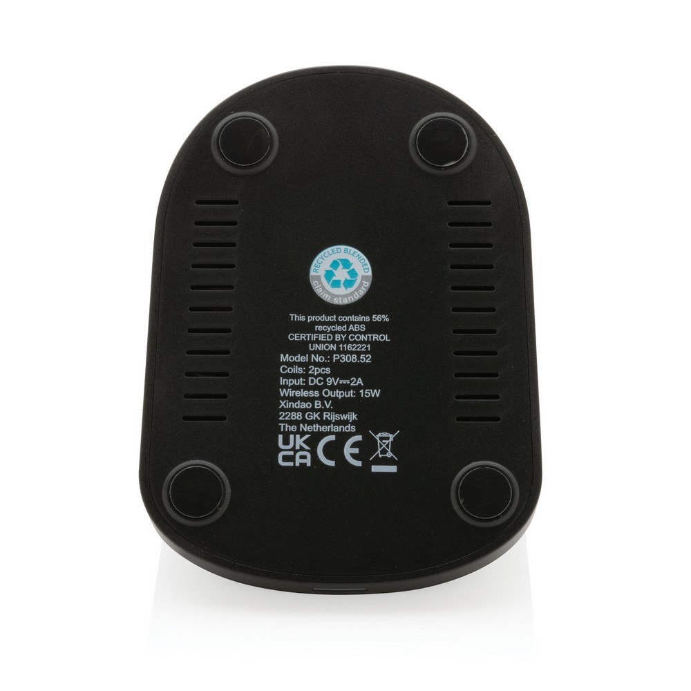Ładowarka bezprzewodowa 15W, posiada wbudowane 2 cewki ładujące, ładować można zarówno w pozycji pionowej jak i horyzontalnej, obudowa wykonana z materiałów pochodzących z recyklingu, posiadają certyfikat RCS (Recycled Claim Standard), który jest stosowany gdy produkt jest wykonany częściowo lub w całości z materiałów pochodzących z recyklingu, całkowita zawartość materiałów z recyklingu to 56%, obliczona na podstawie wagi całkowitej przedmiotu, bezprzewodowe ładowanie jest kompatybilne ze wszystkimi urządzeniami posiadającymi możliwość ładowania indukcyjnego, wejście 12V/1.67A, wyjście bezprzewodowe 9V/1.5A, 15W, w komplecie kabel 150 cm wykonany z TPE z recyklingu, w opakowaniu z certyfikatem FSC mix, nie zawiera PVC, ślad węglowy produktu: 1,35 kg CO2