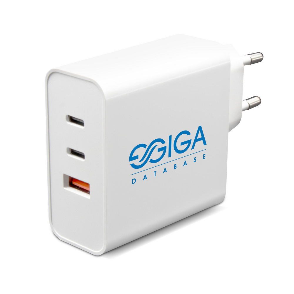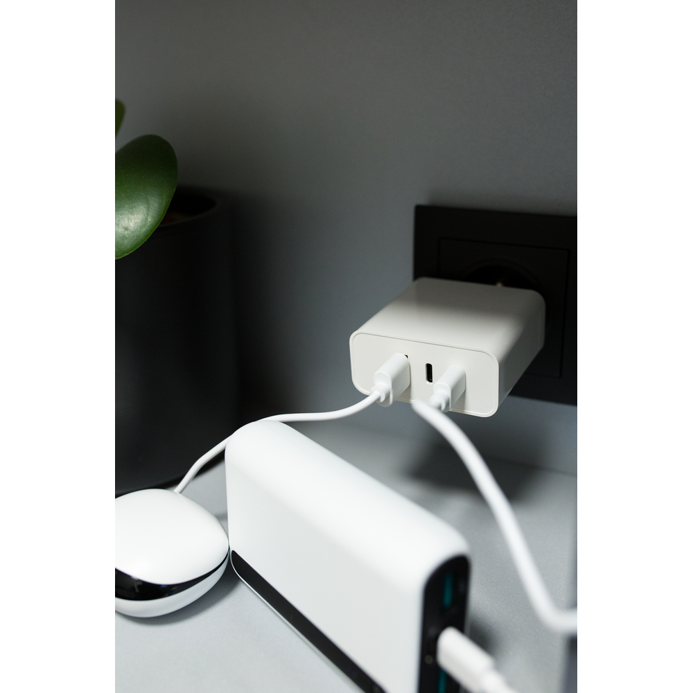 Ładowarka ścienna z wyjściem USB oraz 2 wyjściami USB-C, moc całkowita do 65W (USB-C1: max. 45W, USB-C2: max. 20W, USB-A: max 18W), wejście 100-240V, wyjście USB-C 5-15V/3A, wyjście USB 5-12V/1.5-3A, do użytku wewnątrz pomieszczeń