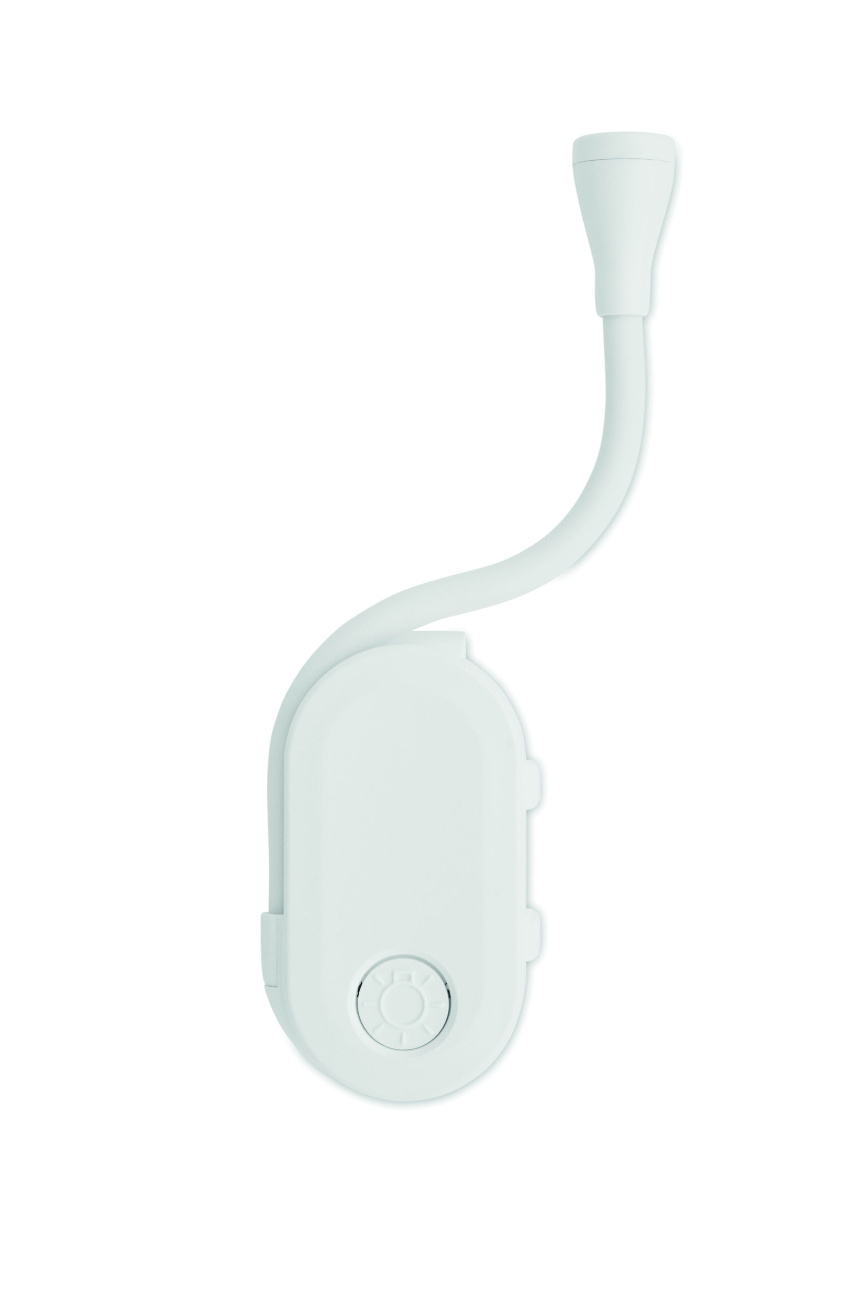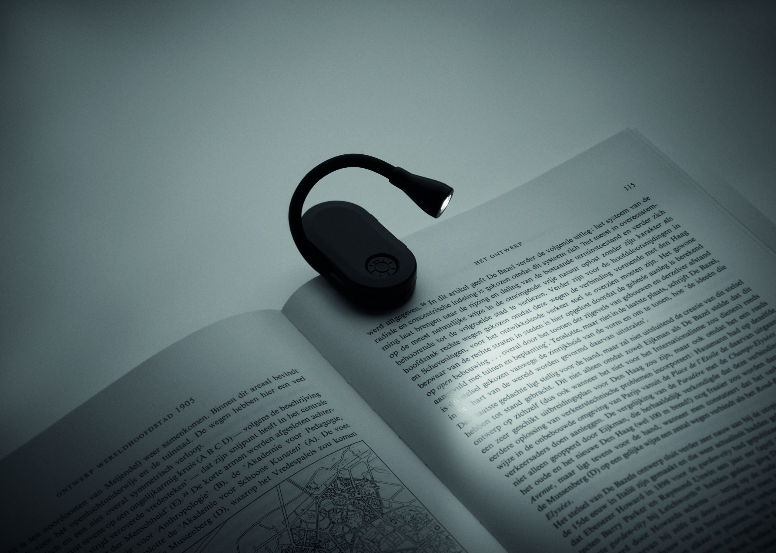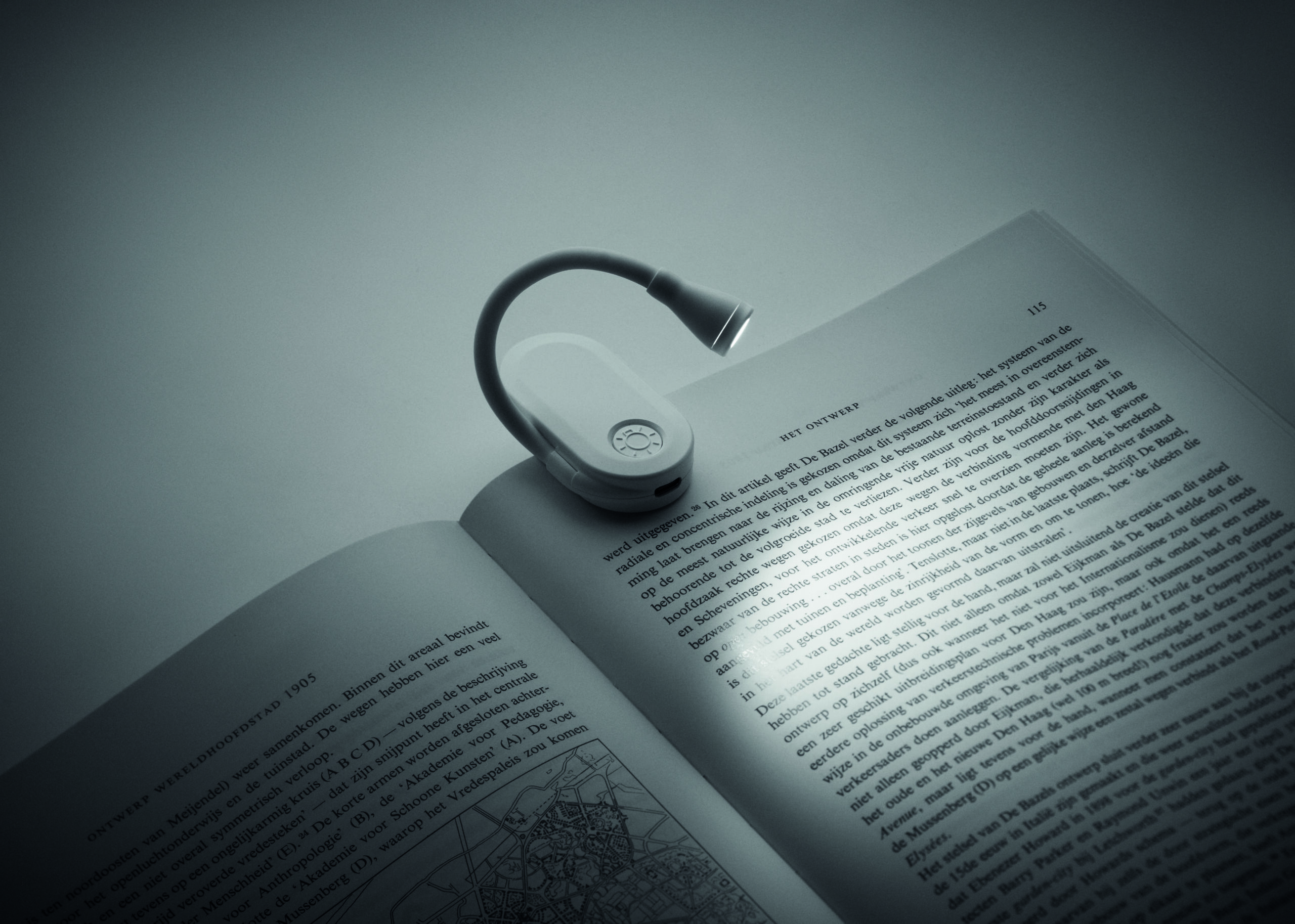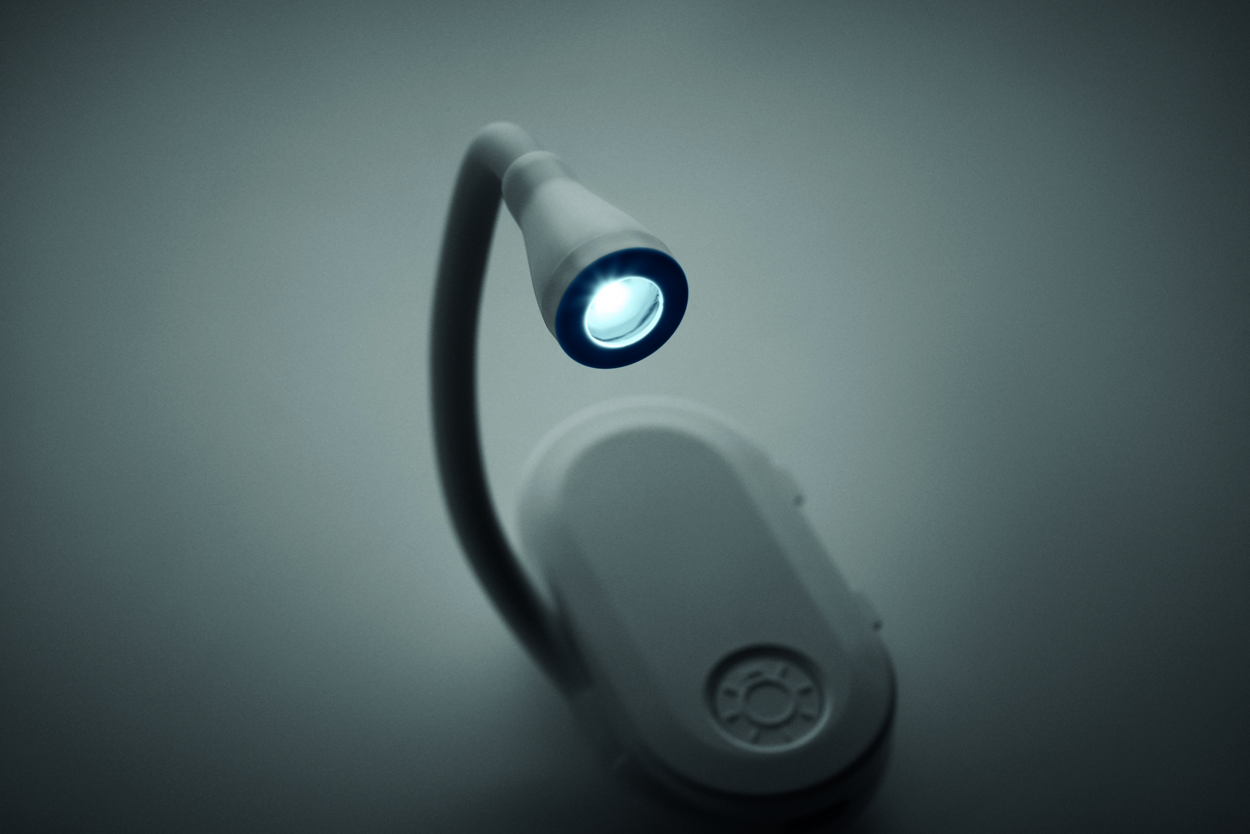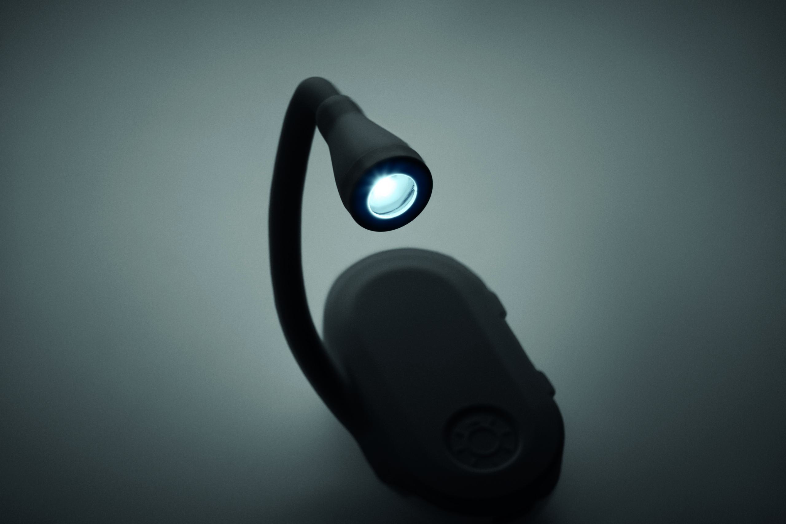 Akumulatorowa lampka LED do książek z ABS z elastycznym korpusem i klipsem. Posiada 3 ustawienia światła, baterię 300 mAh.