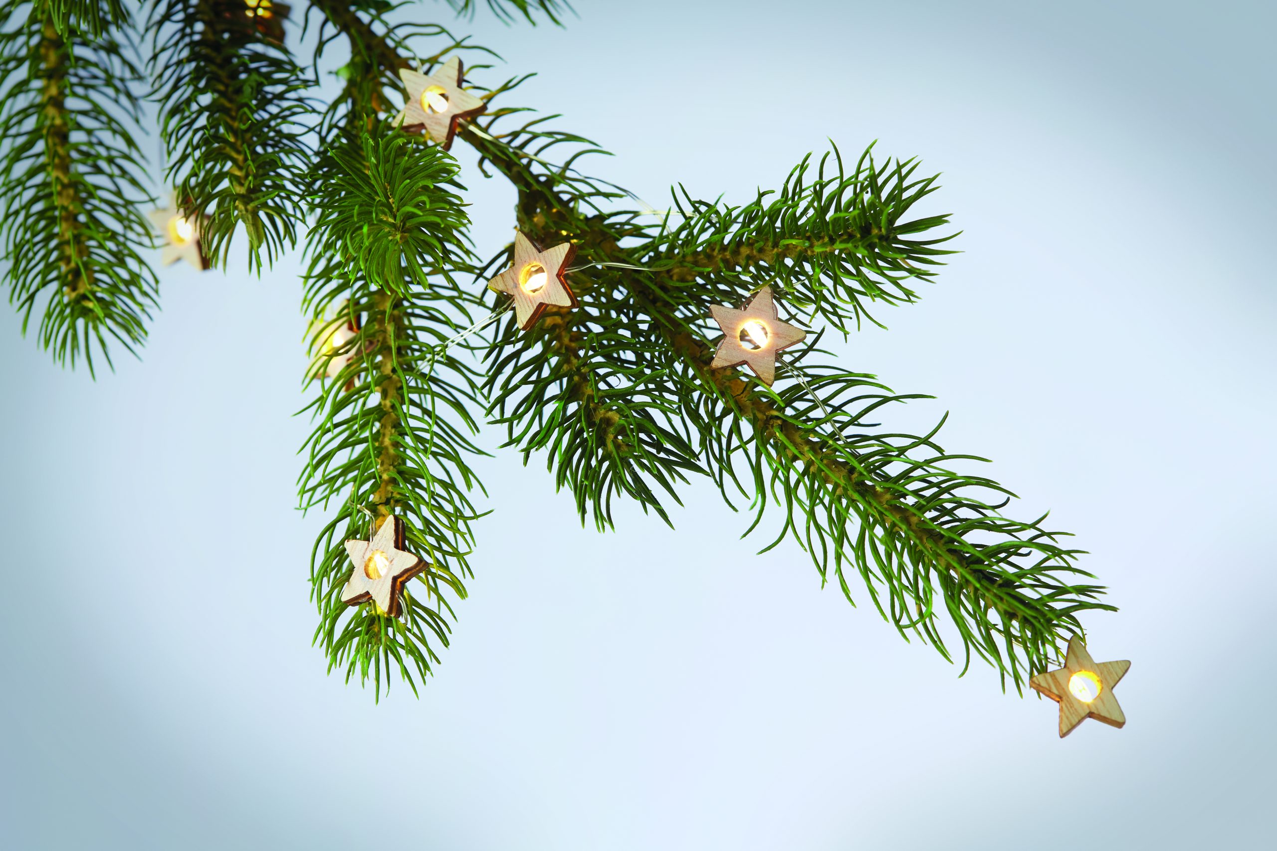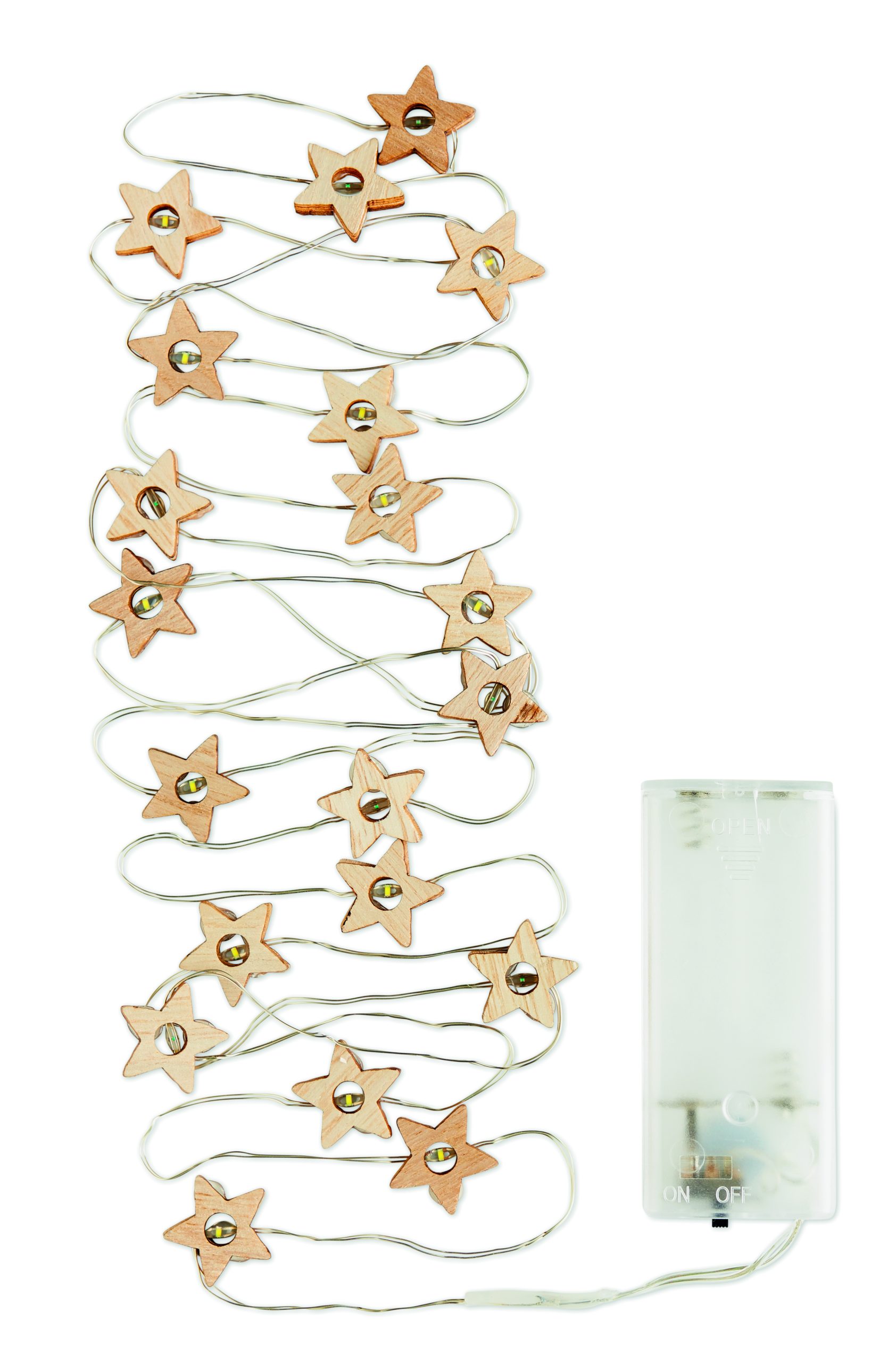 Łańcuch świetlny 20 LED, lampki w kształcie drewnianych gwiazdek. Zapakowany w kartonowe pudełko. 2 baterie AA nie dołączone. Przycisk włączania / wyłączania w obudowie baterii.