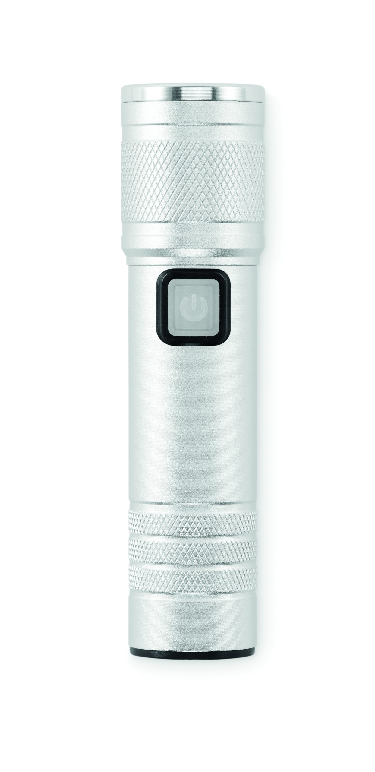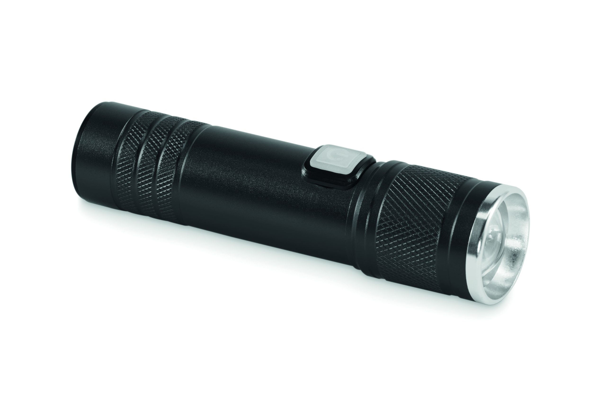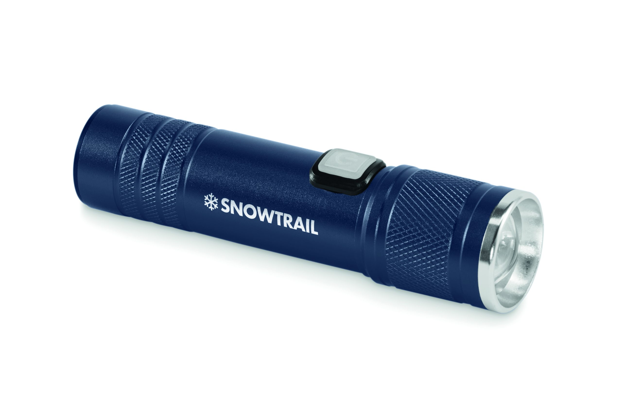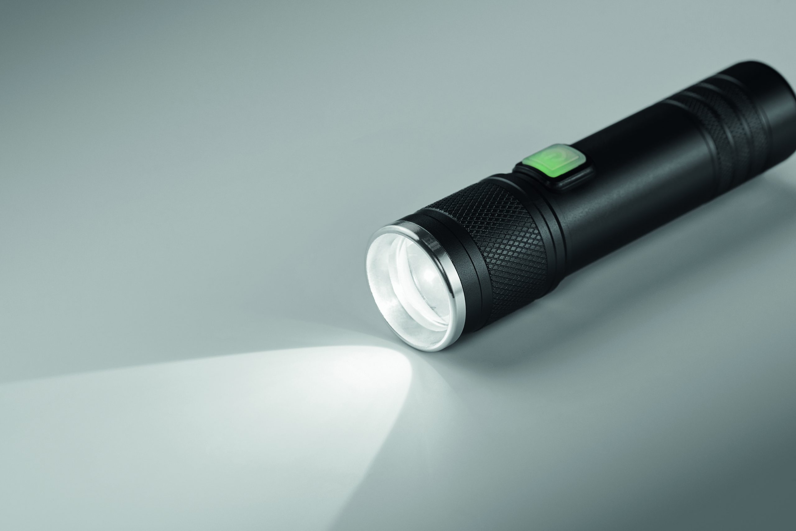 Latarka COB z możliwością ładowania, wykonana z aluminium pochodzącego z recyklingu. 100 lumenów z 3 ustawieniami światła i funkcją zoom. Wbudowany akumulator o pojemności 800 mAh. Kabel do ładowania w zestawie.