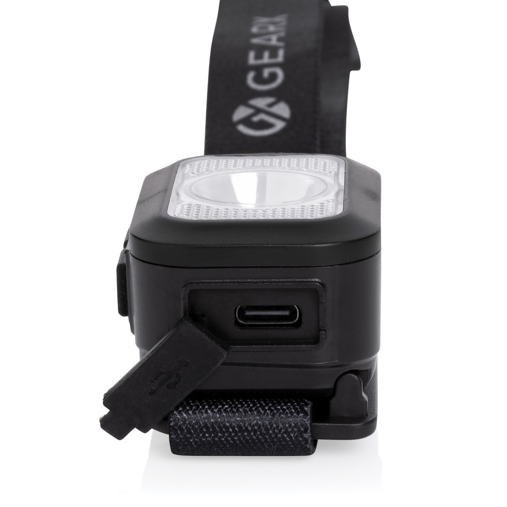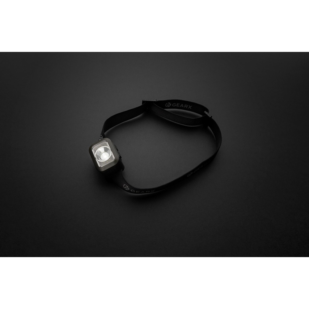 Latarka na głowę COB LED, jasność do 250 lumenów, długość wiązki światła do 70 metrów, wykonana z materiałów z recyklingu, całkowita zawartość materiałów z recyklingu obliczona na podstawie wagi całkowitej przedmiotu: 23%, regulowana wielkość, wbudowana bateria 800 mAh, 6 trybów świecenia, wejście USB typu C