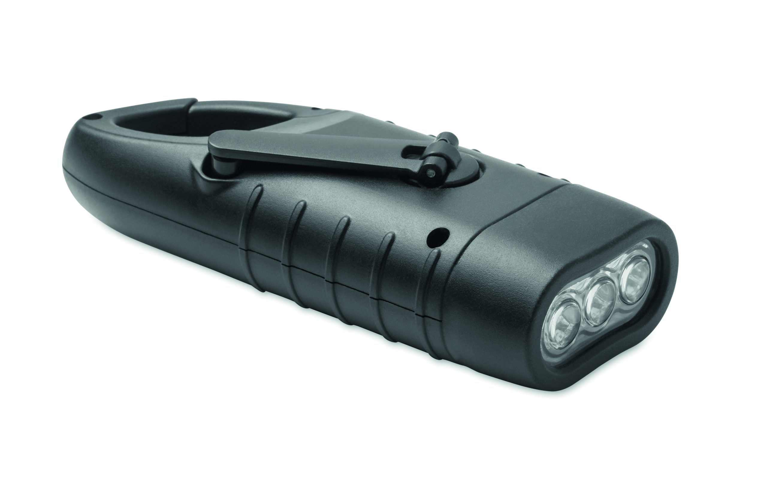 latarka z 3 białymi diodami LED zasilana zarówno panelem słonecznym, jak i korbą dynamo z akumulatorem 40 mAh z ABS pochodzącego z recyklingu.