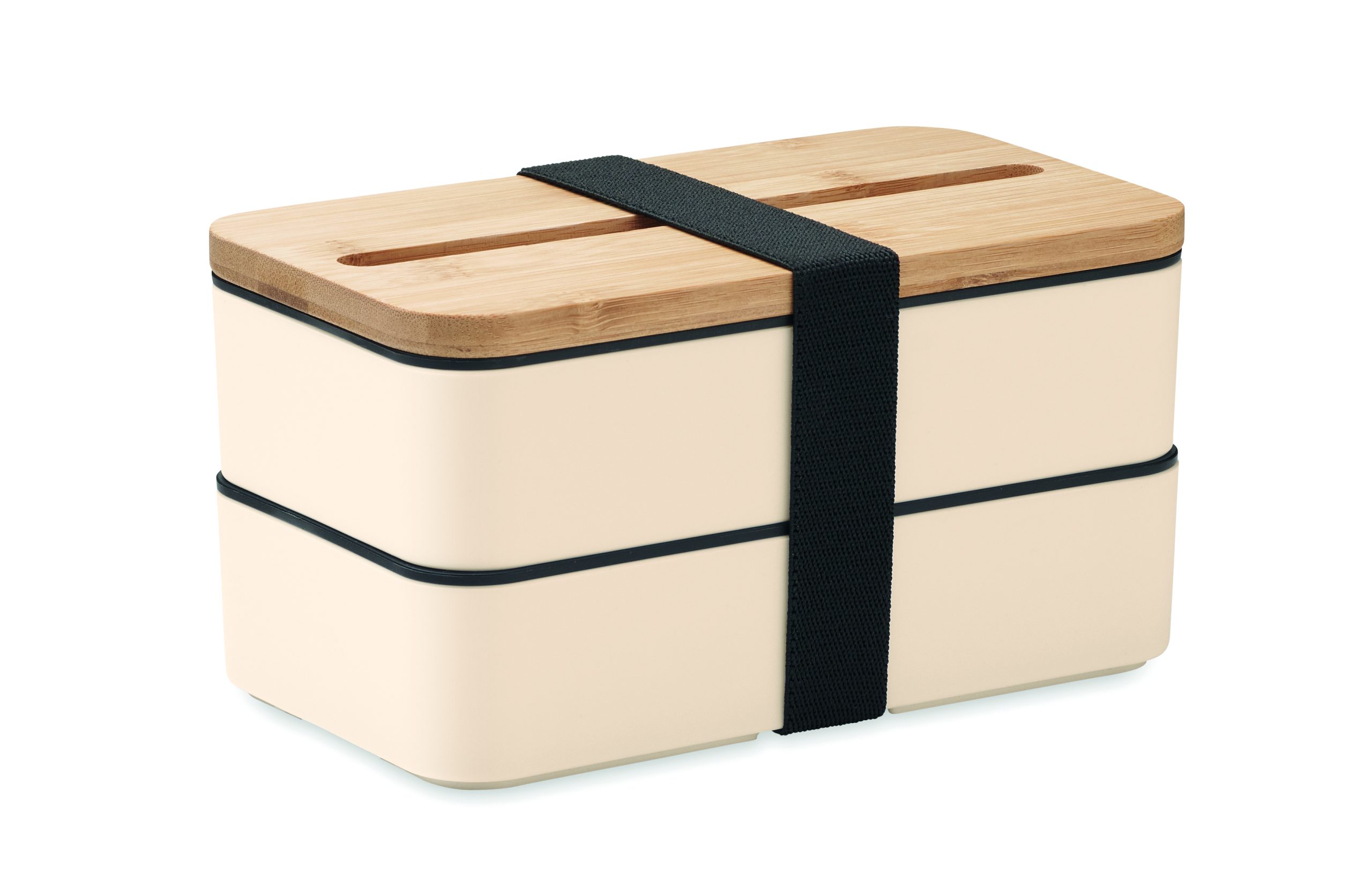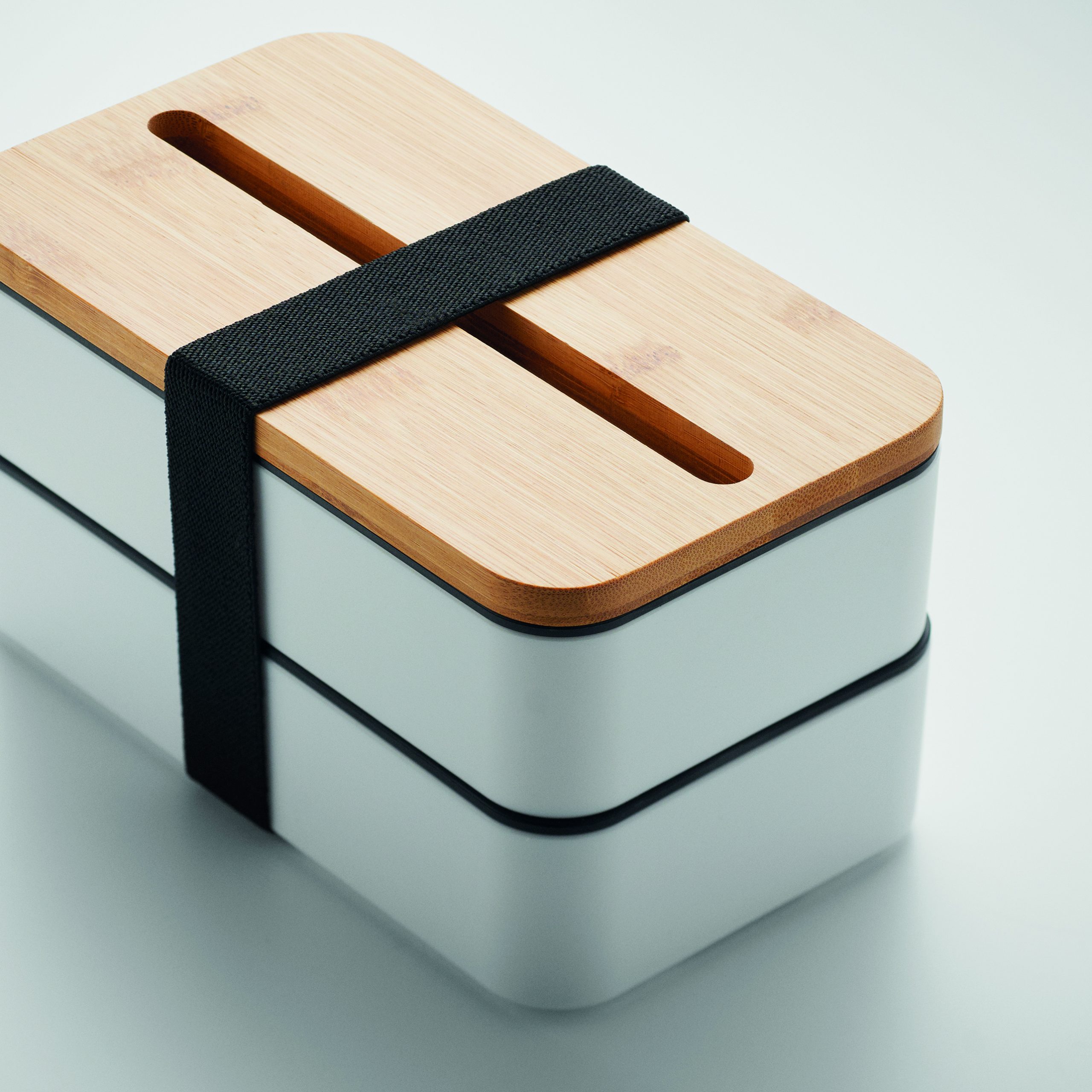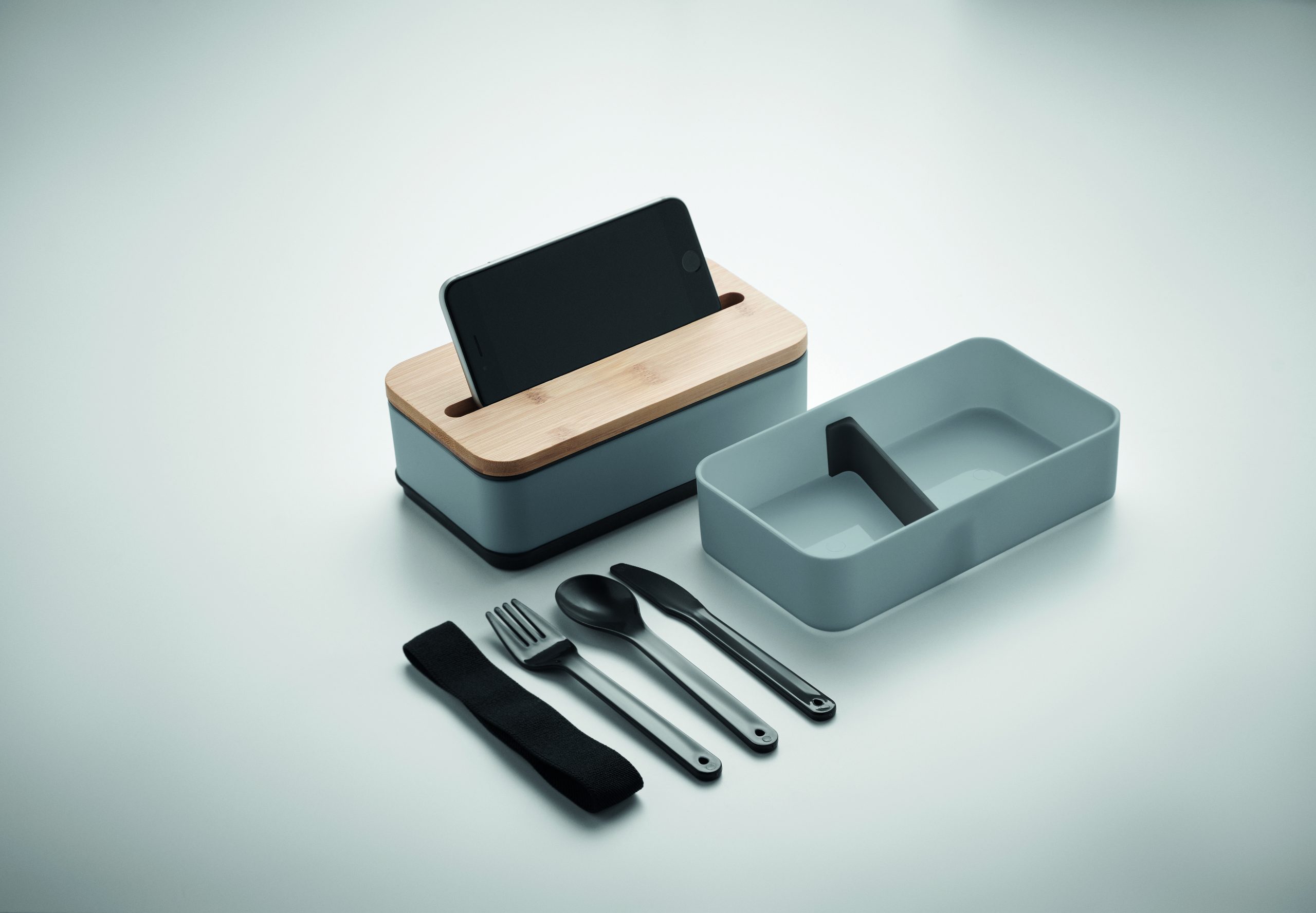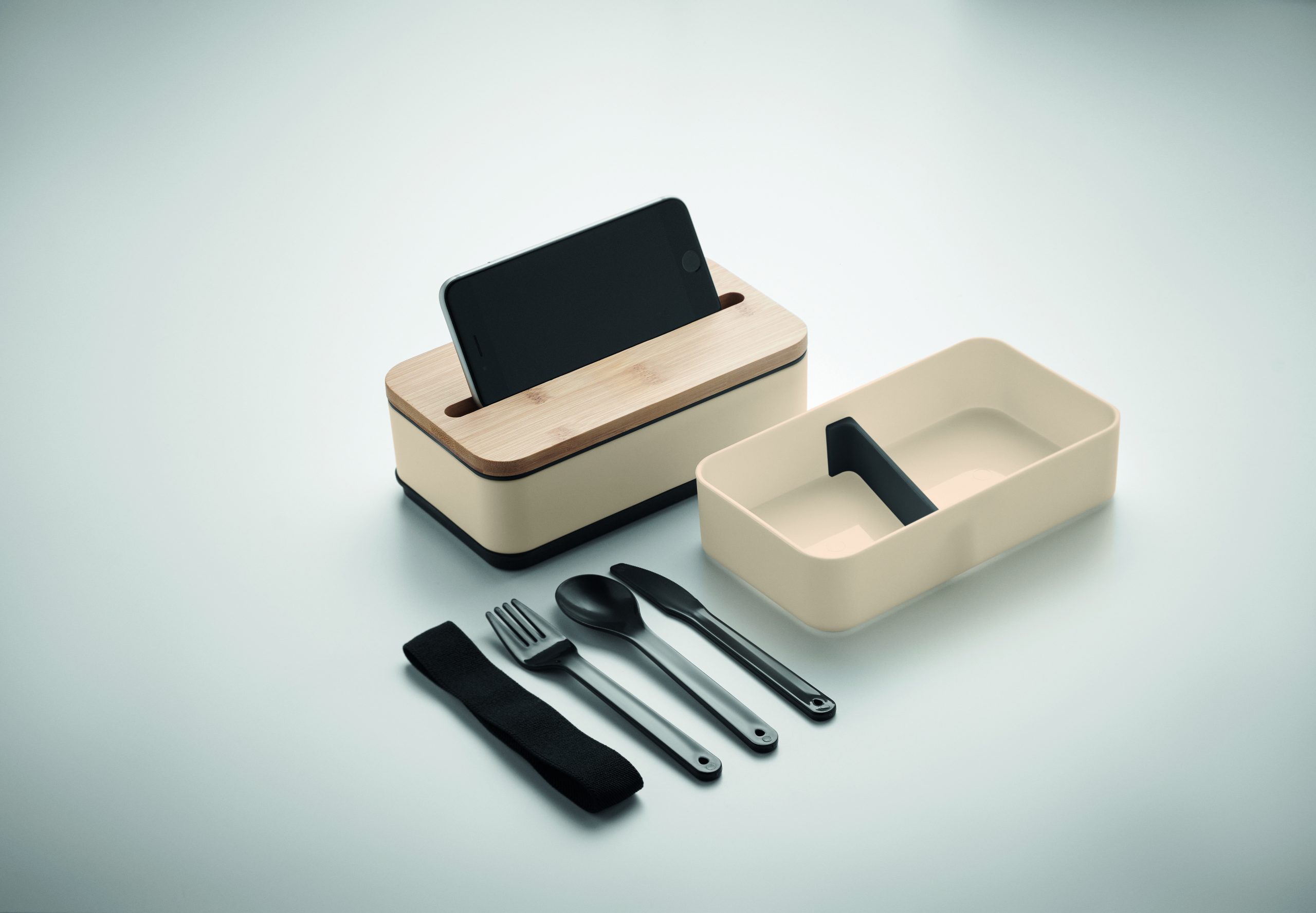 Dwupoziomowy pojemnik na lunch z PP z z wyjmowaną przegrodą i 3 sztućcami, z dołączoną opaską poliestrową, z bambusową pokrywą. Pokrywa ma funkcję podstawki pod telefon. Pojemność: 400 ml (2x). Bambus jest produktem naturalnym, dlatego mogą wystąpić nieznaczne różnice w kolorze, wzorze i rozmiarze.