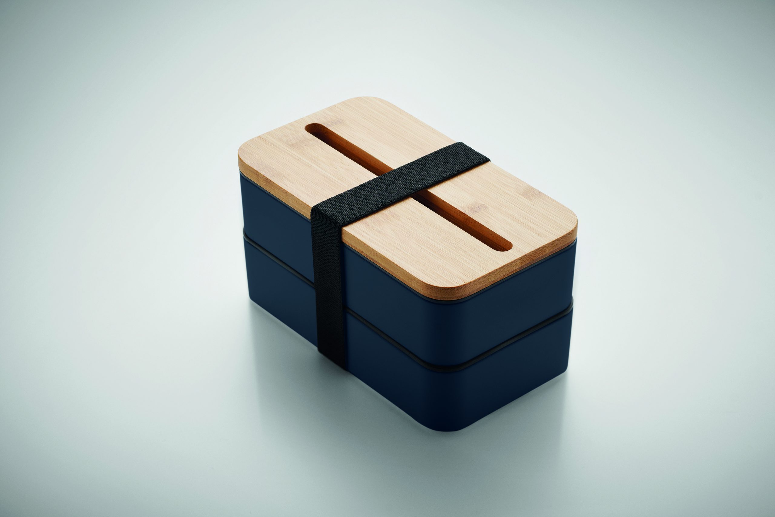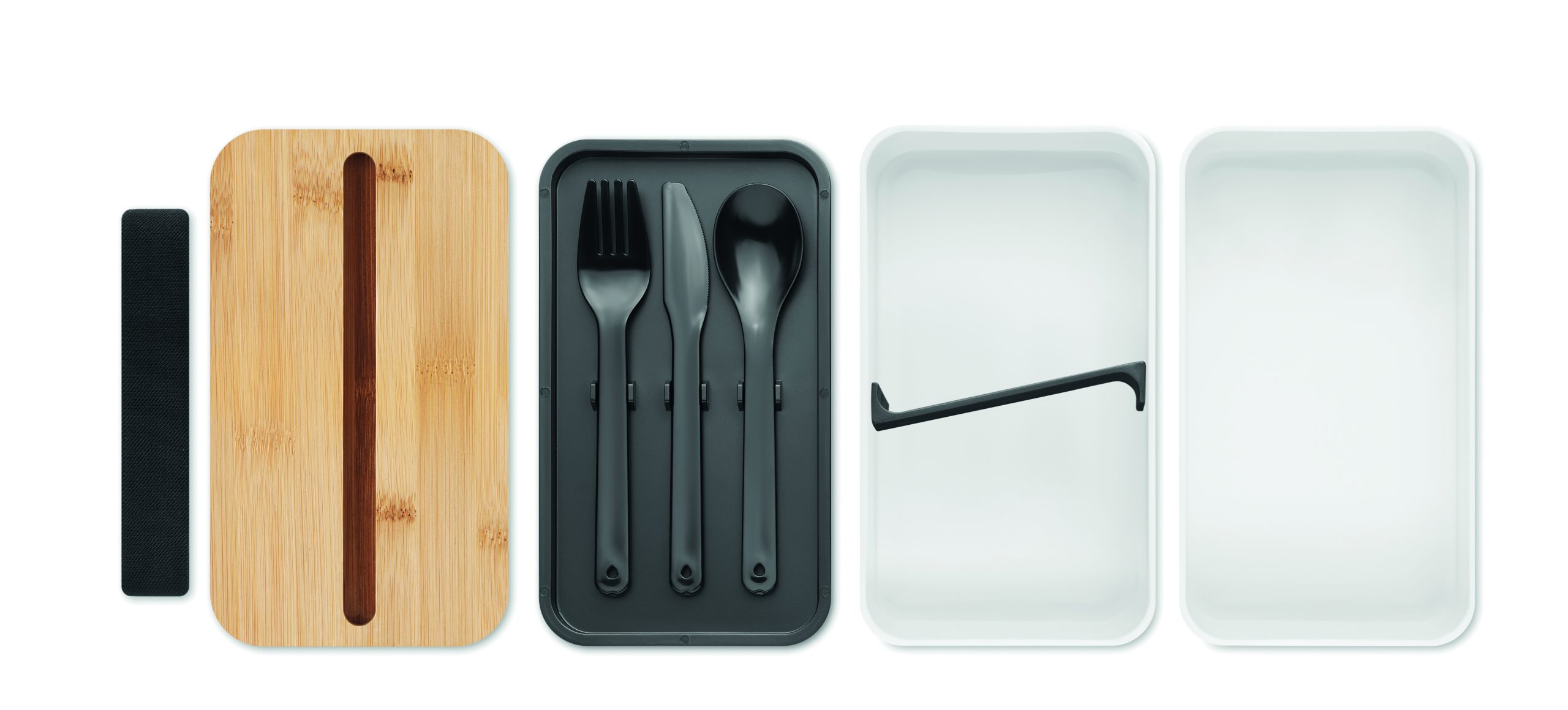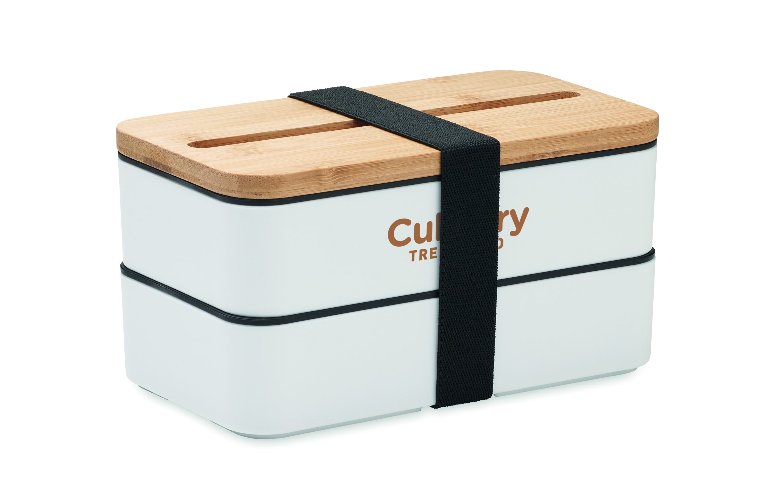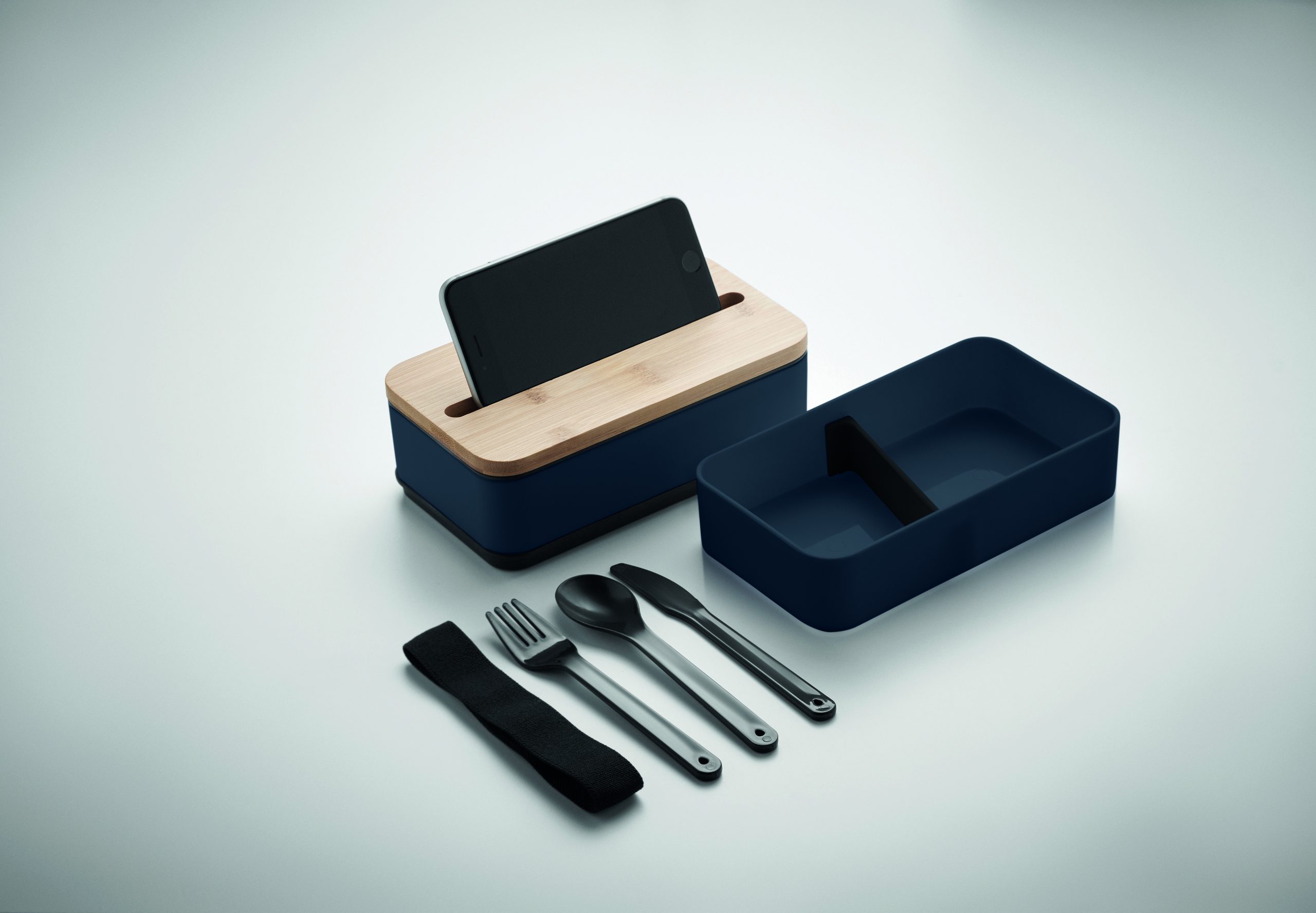 Dwupoziomowy pojemnik na lunch z PP z z wyjmowaną przegrodą i 3 sztućcami, z dołączoną opaską poliestrową, z bambusową pokrywą. Pokrywa ma funkcję podstawki pod telefon. Pojemność: 400 ml (2x). Bambus jest produktem naturalnym, dlatego mogą wystąpić nieznaczne różnice w kolorze, wzorze i rozmiarze.