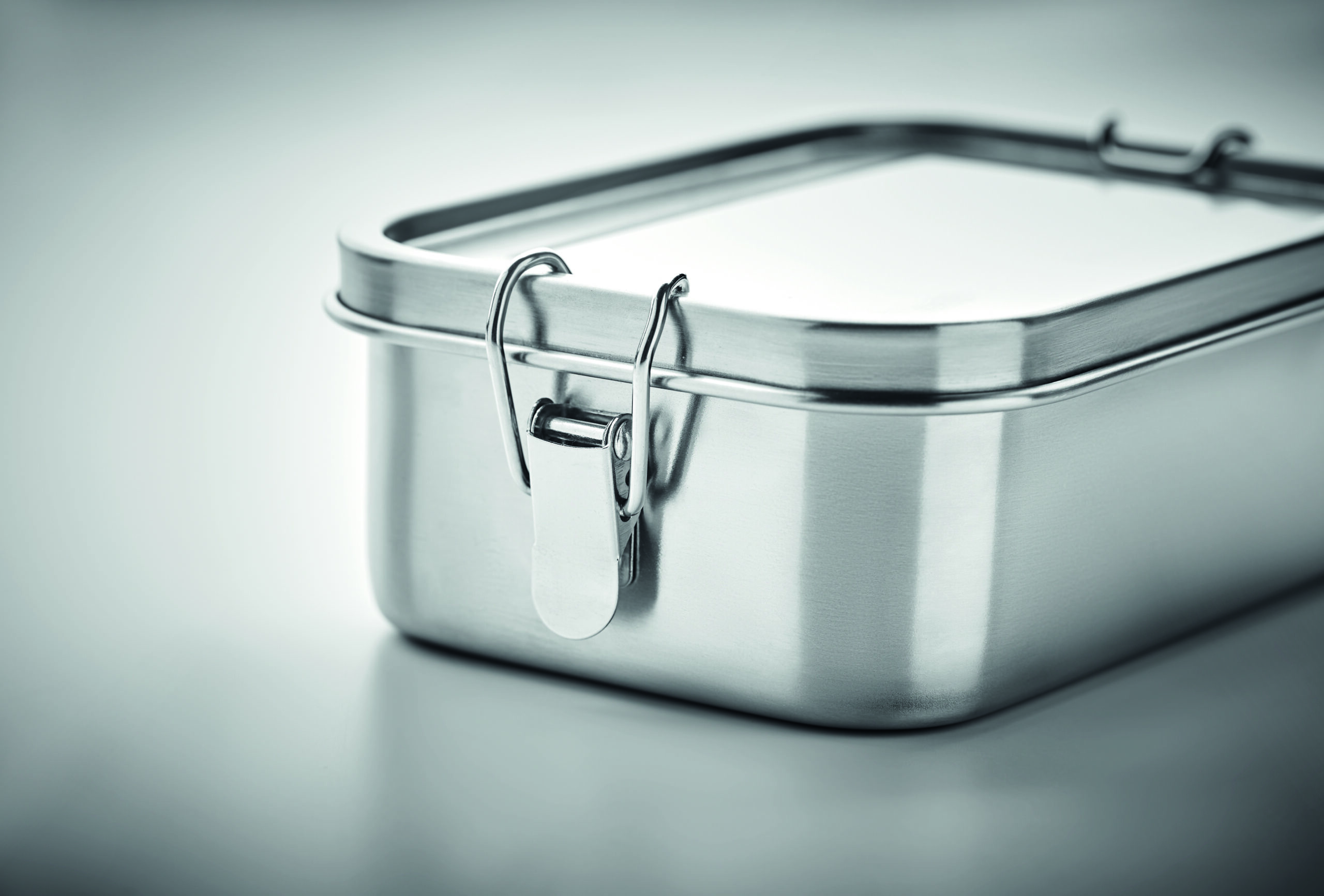 Lunchbox z recyklingowanej stali nierdzewnej (90% stali nierdzewnej z recyklingu i 10% stali nierdzewnej) z bezpiecznymi bocznymi klamrami i zaokrąglonymi rogami. Pojemność: 750 ml.