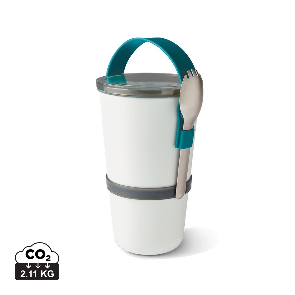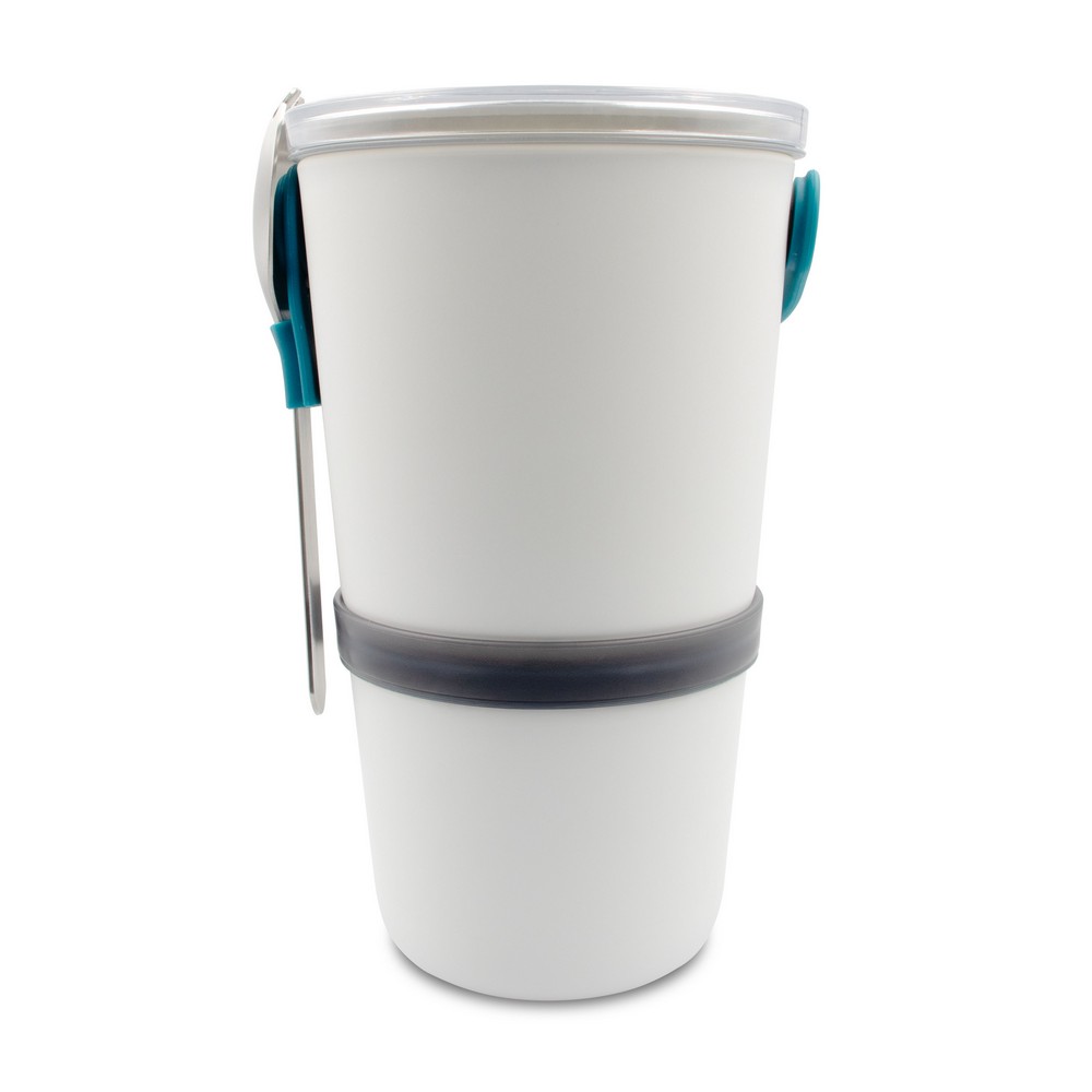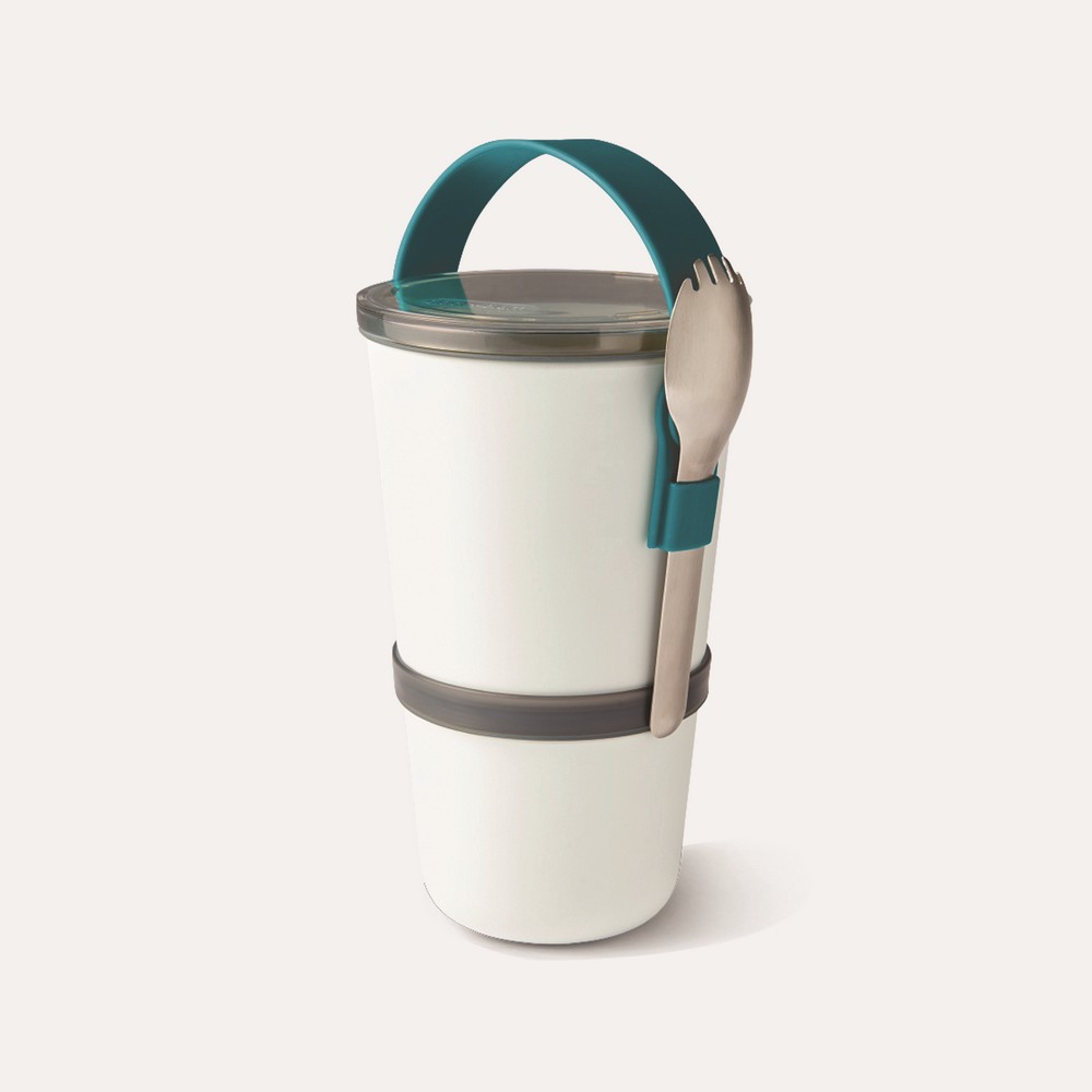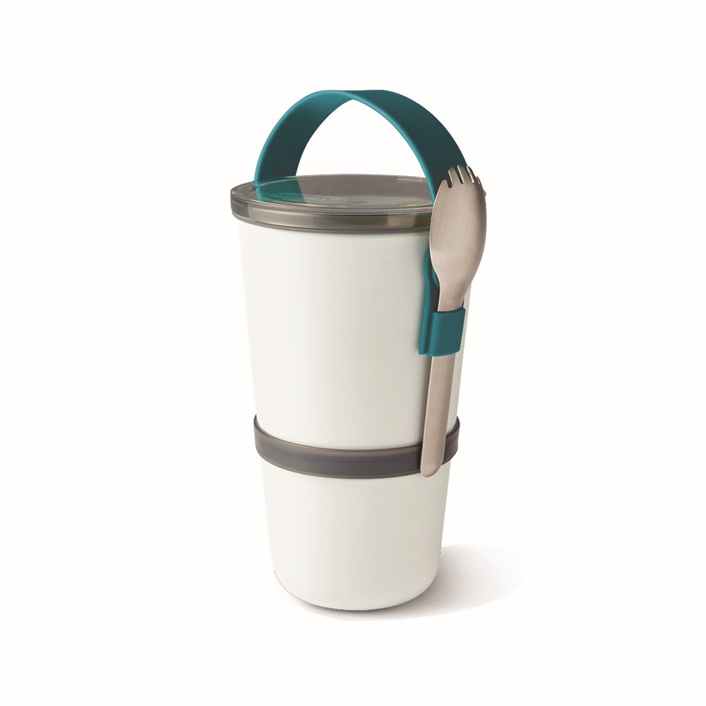 Miska śniadaniowa składa się z dwóch wodoszczelnych pojemników, które można połączyć ze sobą w celu przenoszenia, posiada silikonowy pasek do przenoszenia, który utrzymuje również łyżkę z funkcją widelca ze stali nierdzewnej, dostosowane do użytku w kuchence mikrofalowej, można myć w zmywarce z wyjątkiem tritanowej pokrywki