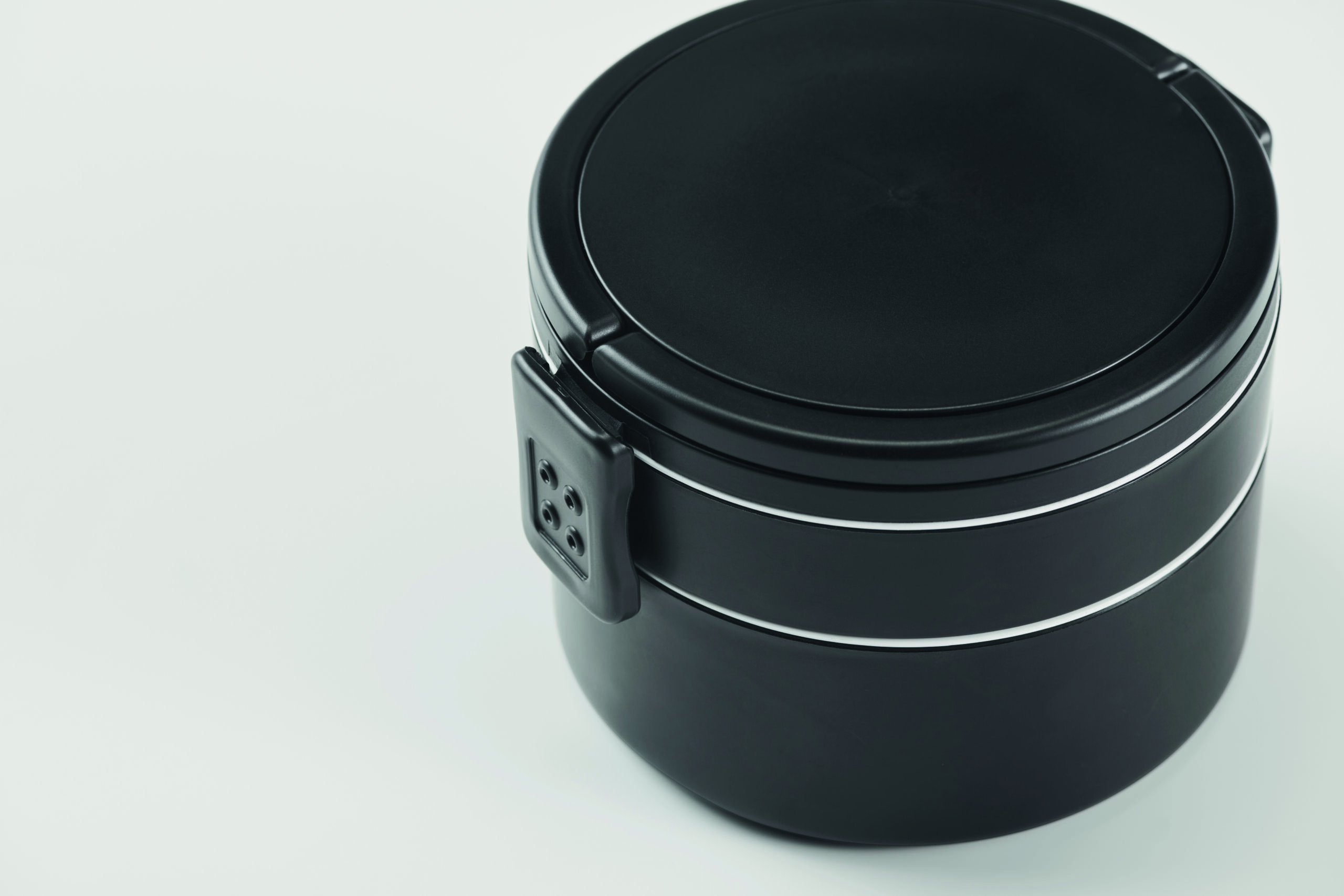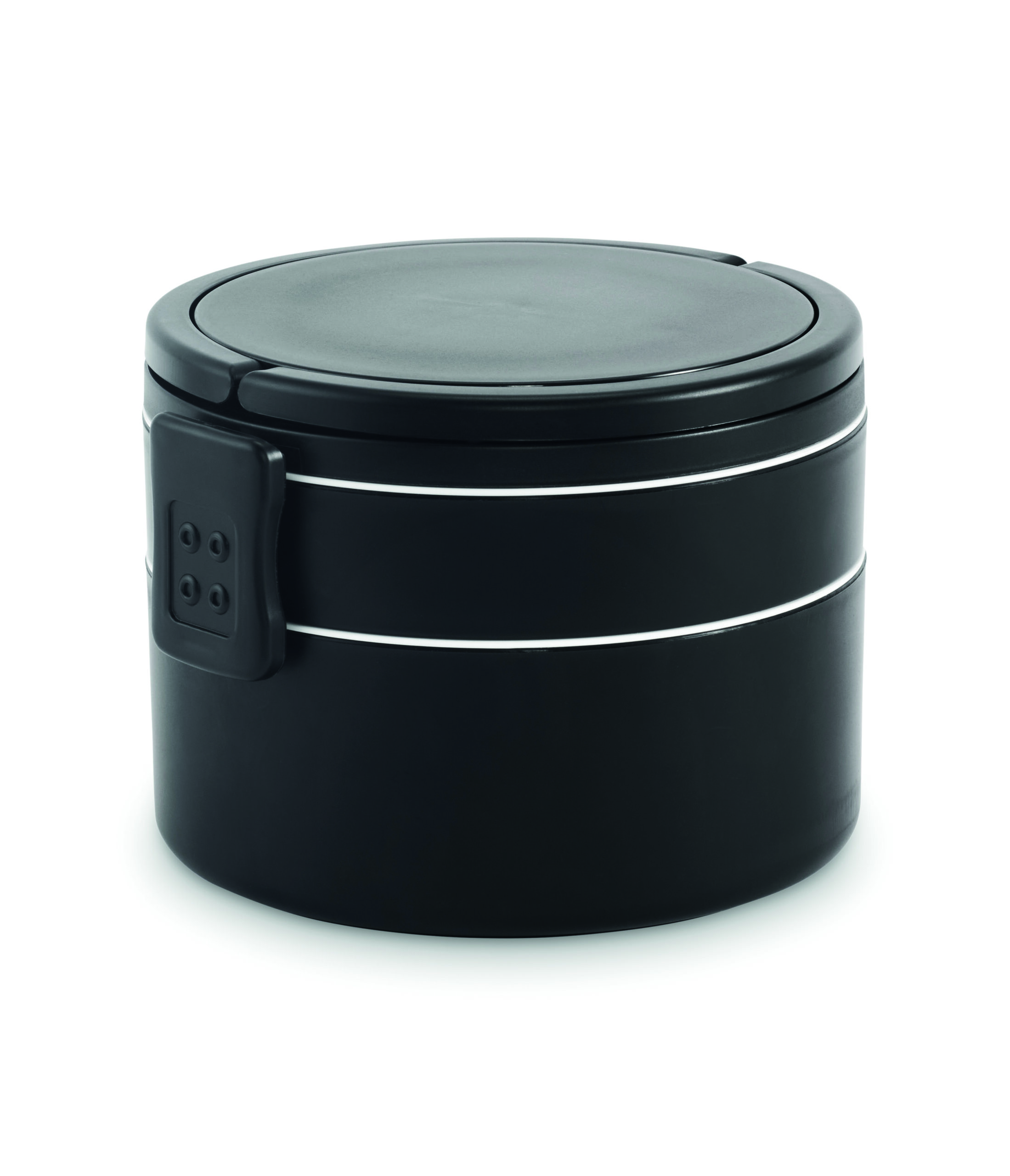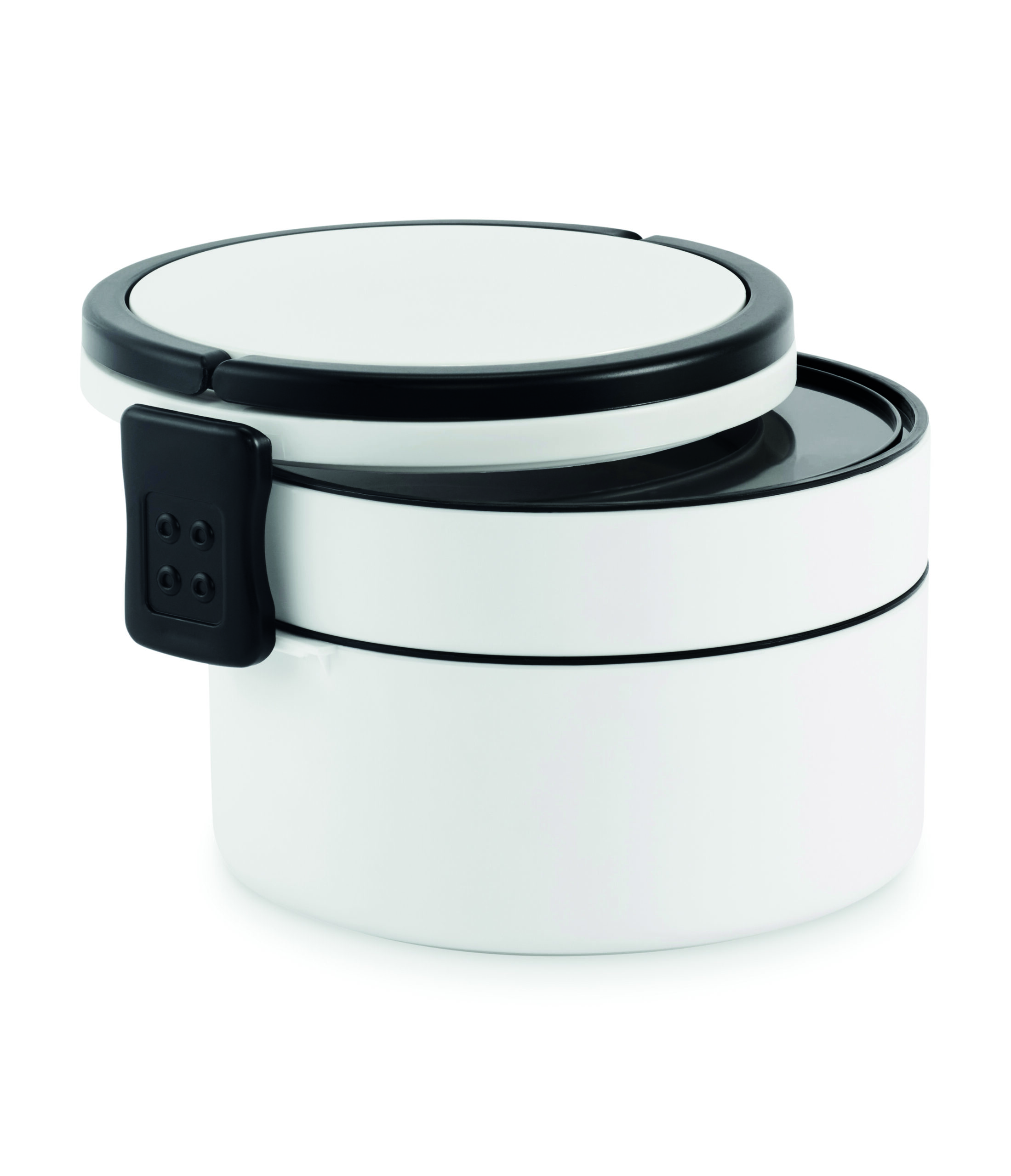 Dwupoziomowe okrągły lunchbox wykonane z PP z bocznym zamknięciem na zatrzask i uchwytami. Zawiera wewnętrzne pokrywki. Pojemność 250 ml na górze, 700 ml na dole.