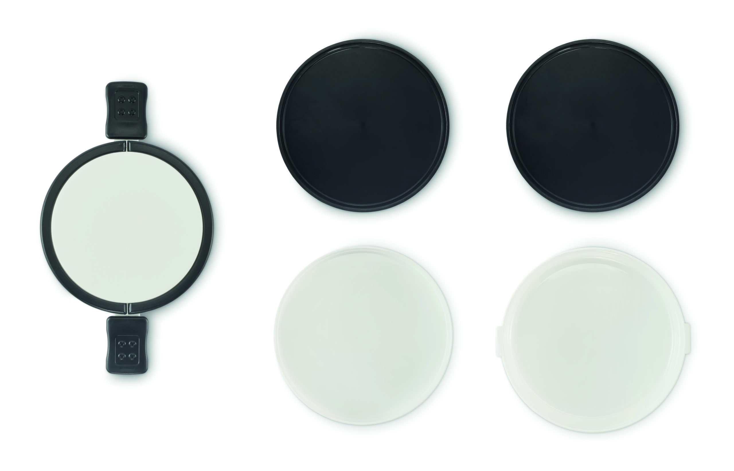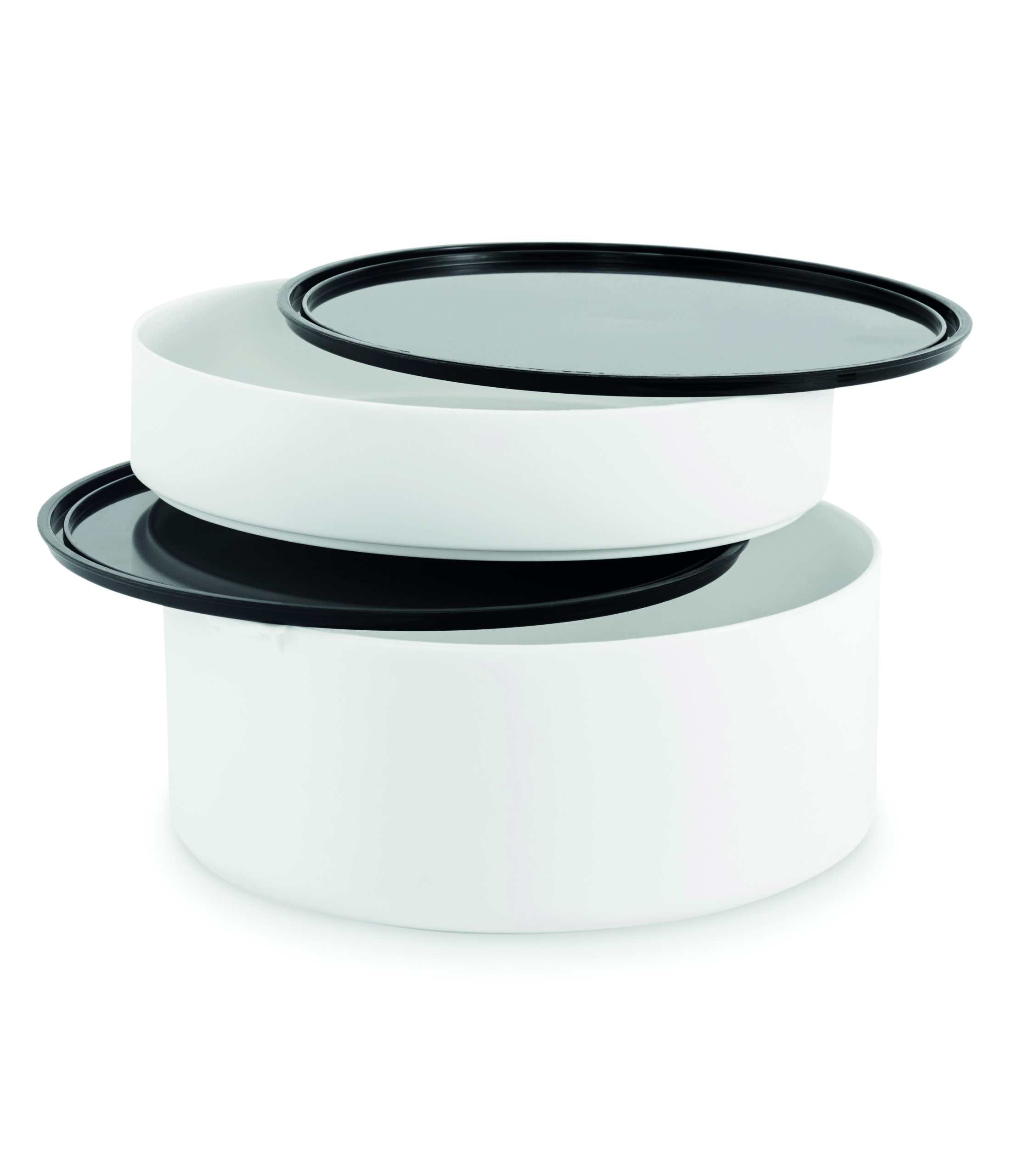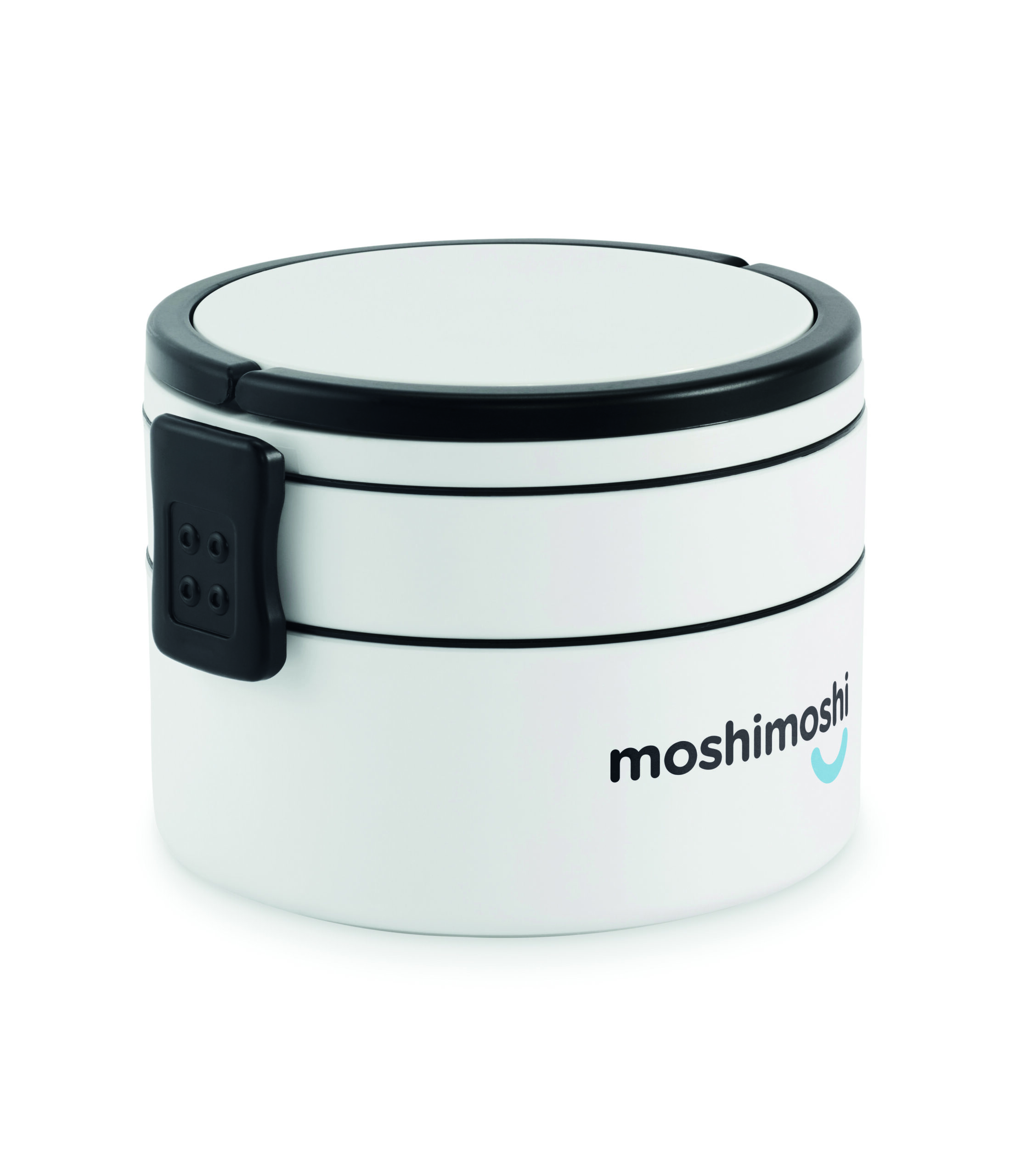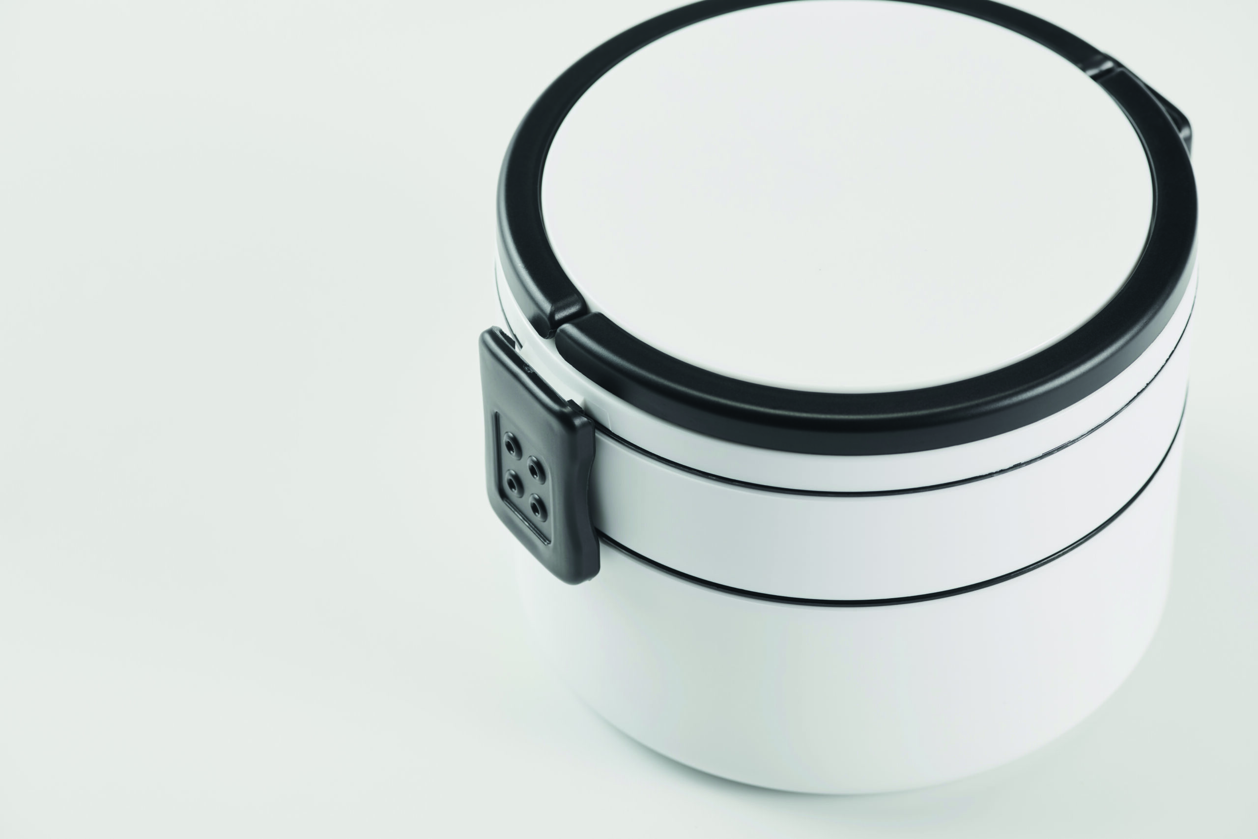 Dwupoziomowe okrągły lunchbox wykonane z PP z bocznym zamknięciem na zatrzask i uchwytami. Zawiera wewnętrzne pokrywki. Pojemność 250 ml na górze, 700 ml na dole.