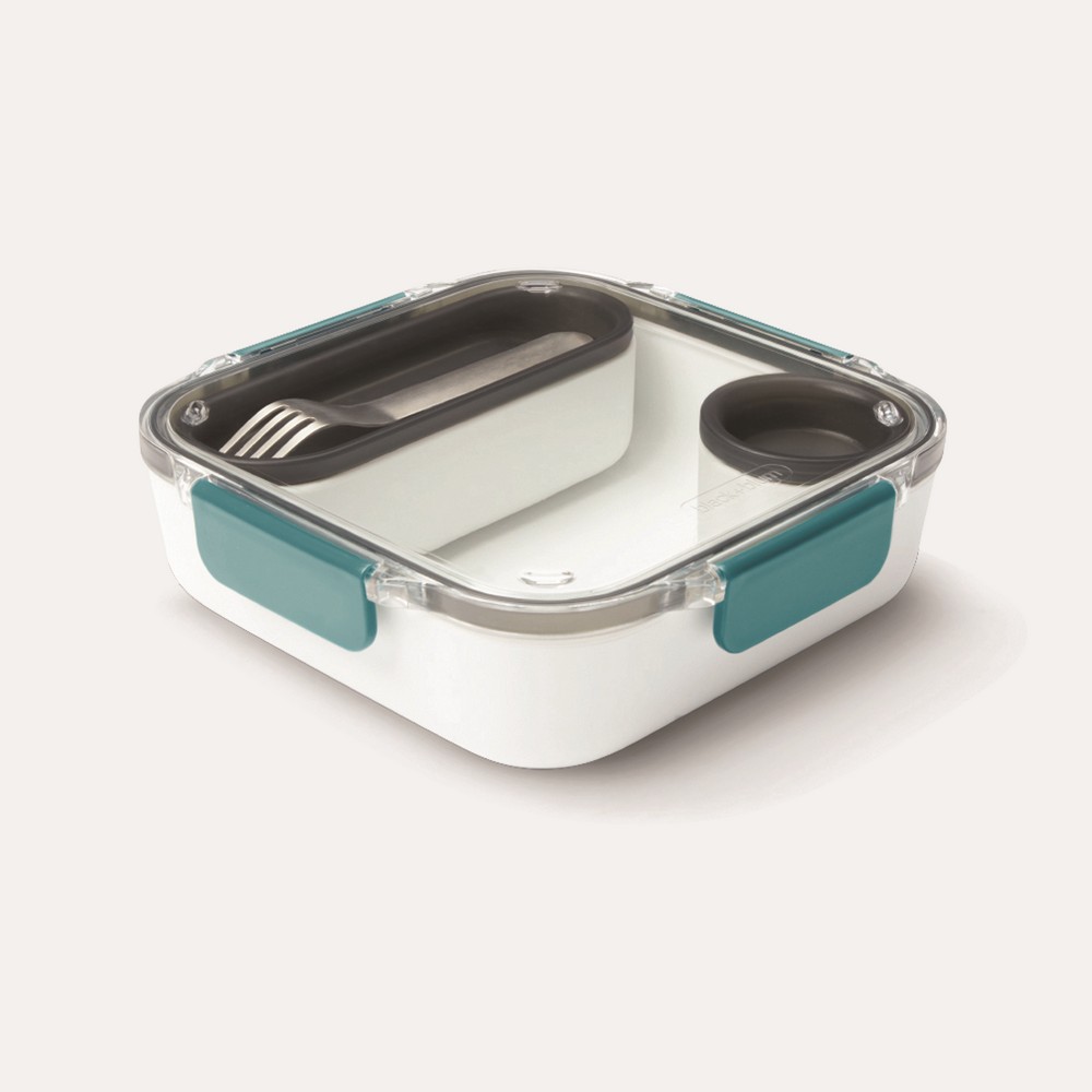 Pudełko śniadaniowe, zawiera wewnętrzny pojemnik, pojemnik na sos z miejscem do dekoracji w pokrywie widelec ze stali nierdzewnej, można myć w zmywarce i używać w kuchence mikrofalowej