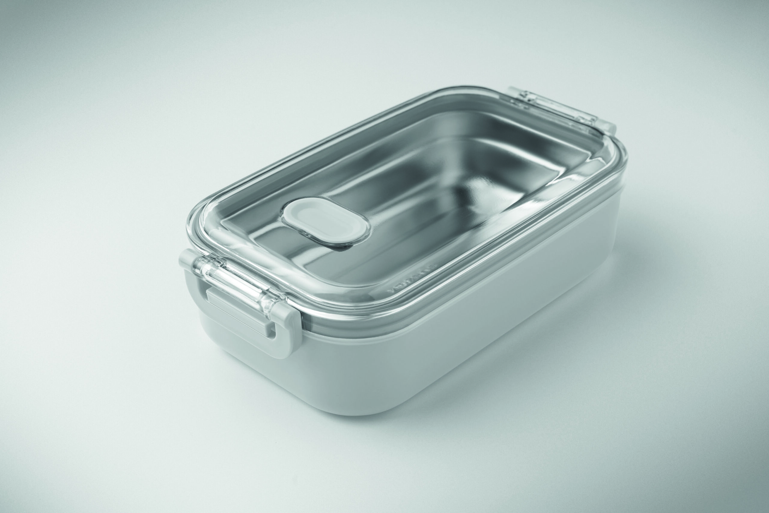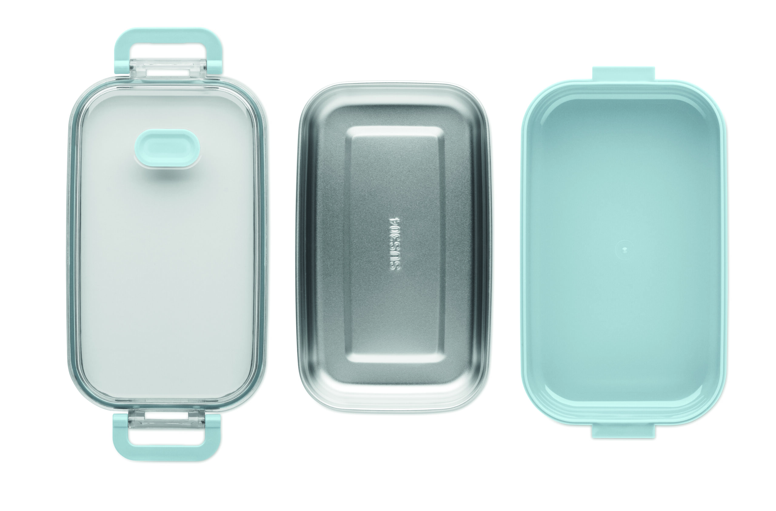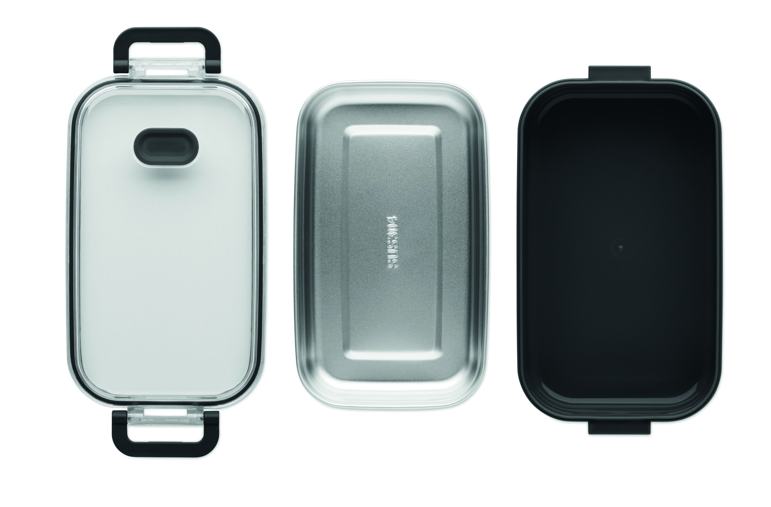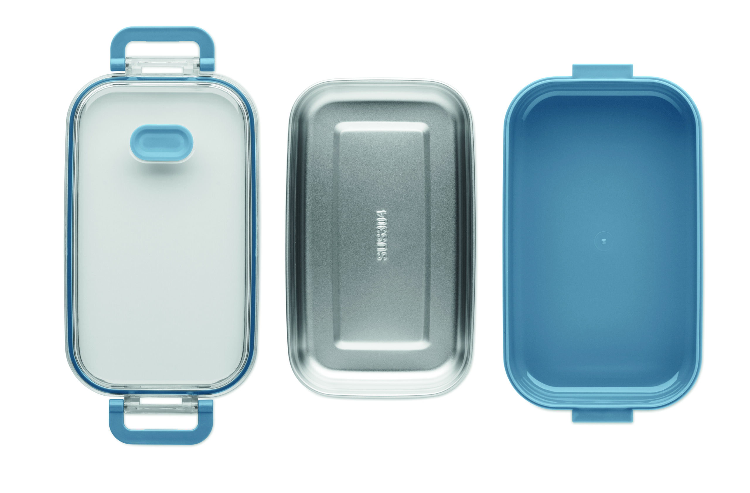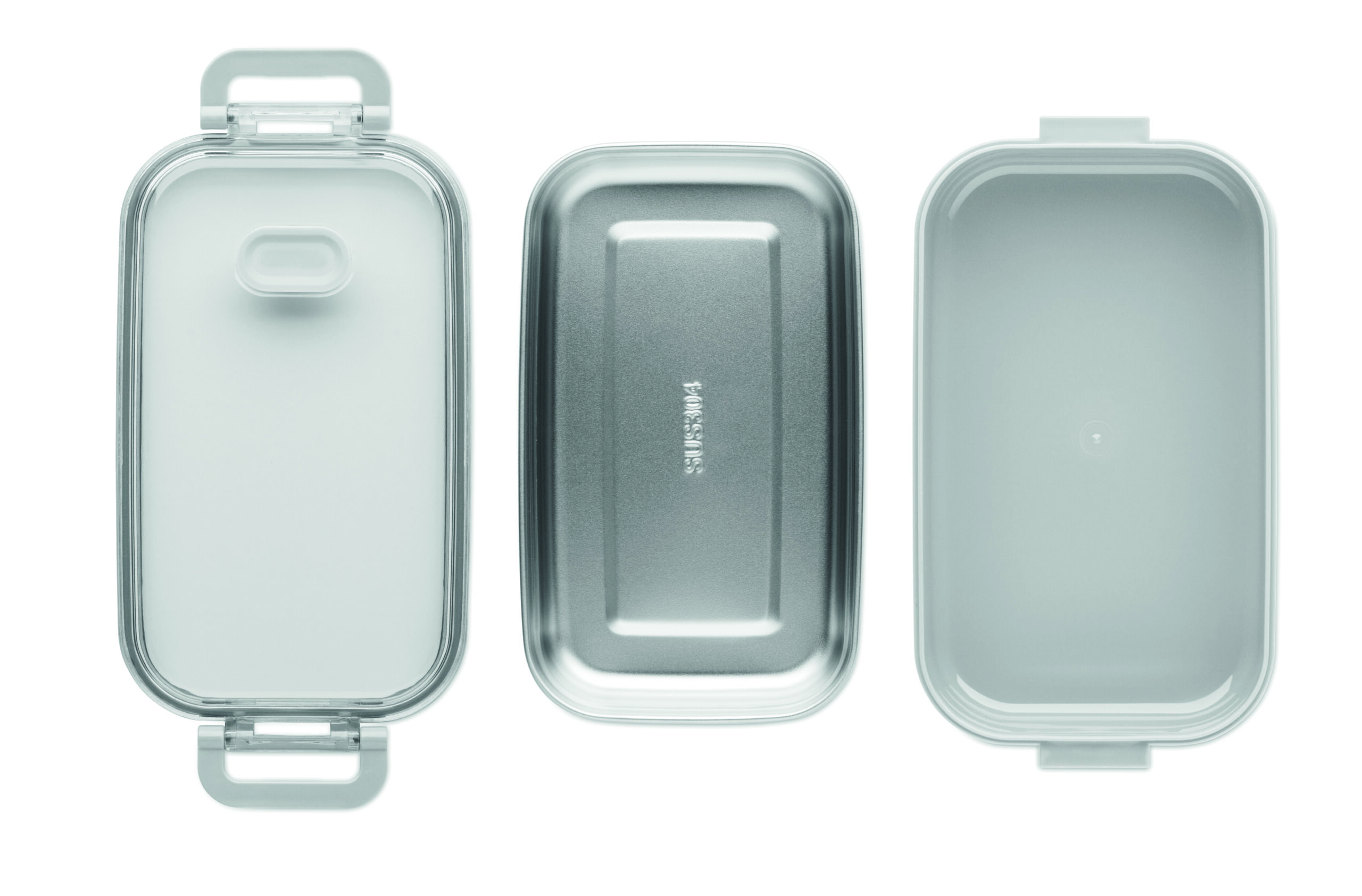 Lunchbox z PP z dodatkową warstwą wewnętrzną z recyklingowanej stali nierdzewnej. Szczelna pokrywa AS zapewnia świeżość i bezpieczeństwo żywności. Pojemność 750 ml bez tacki i 650 ml z tacką.