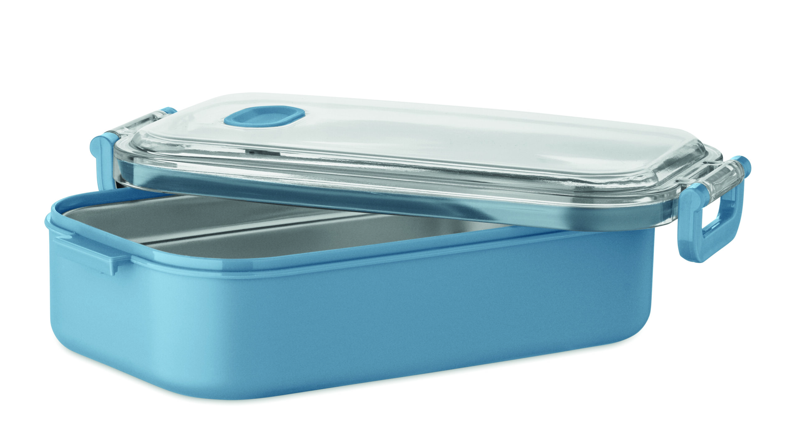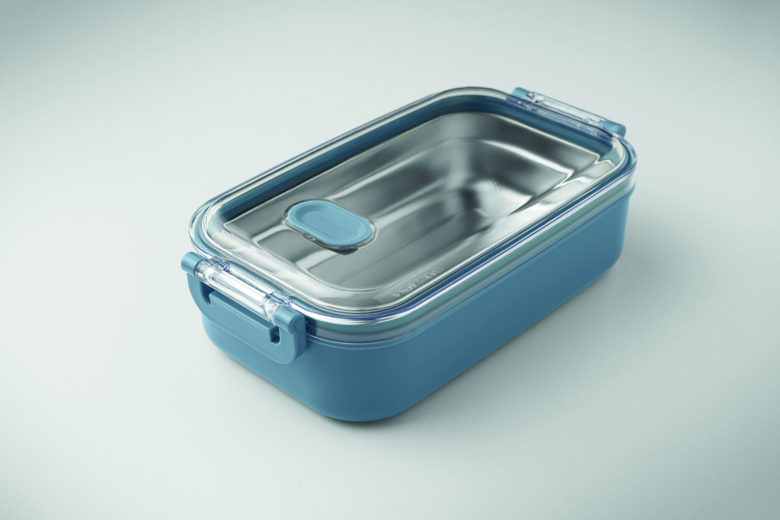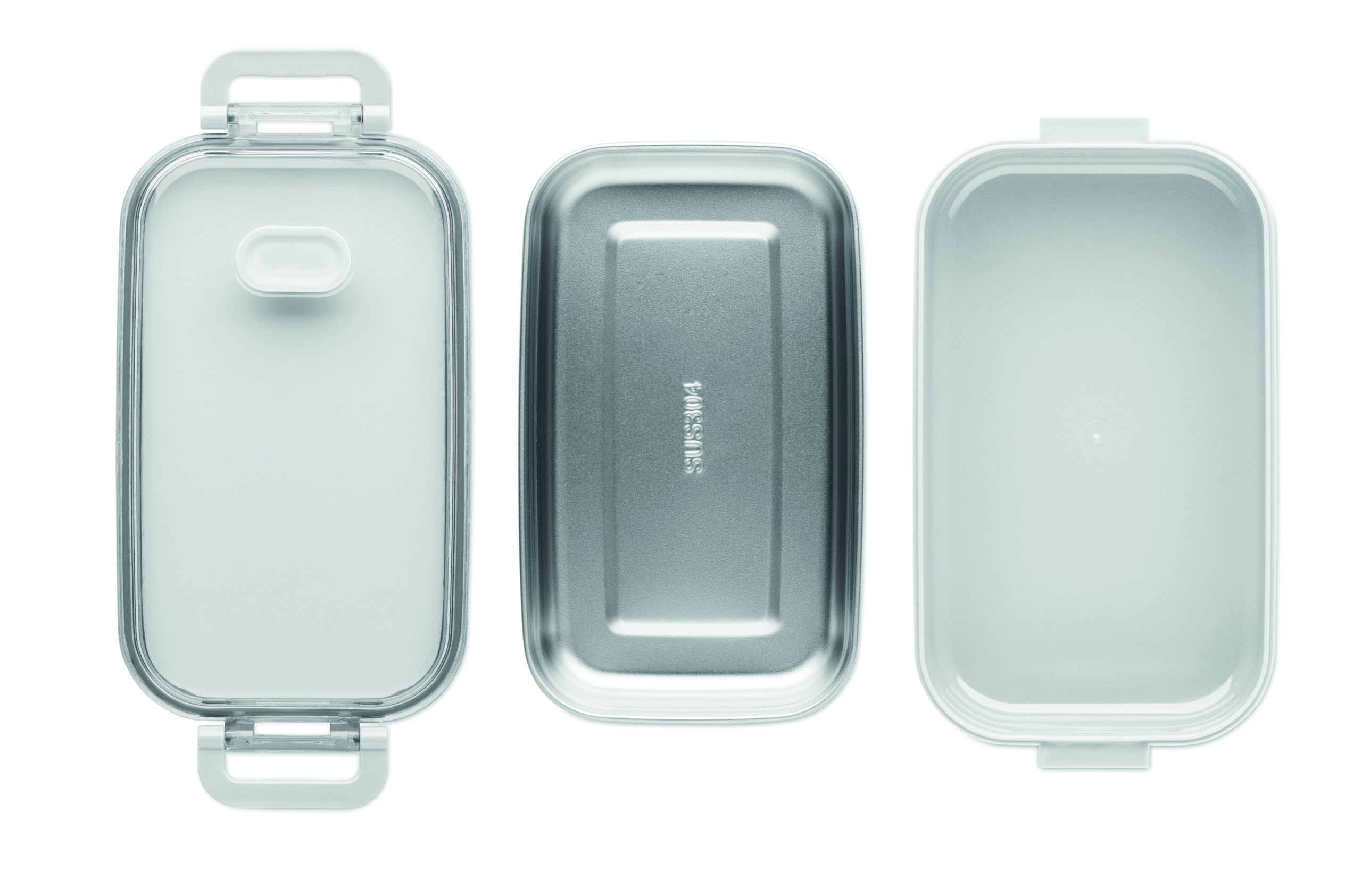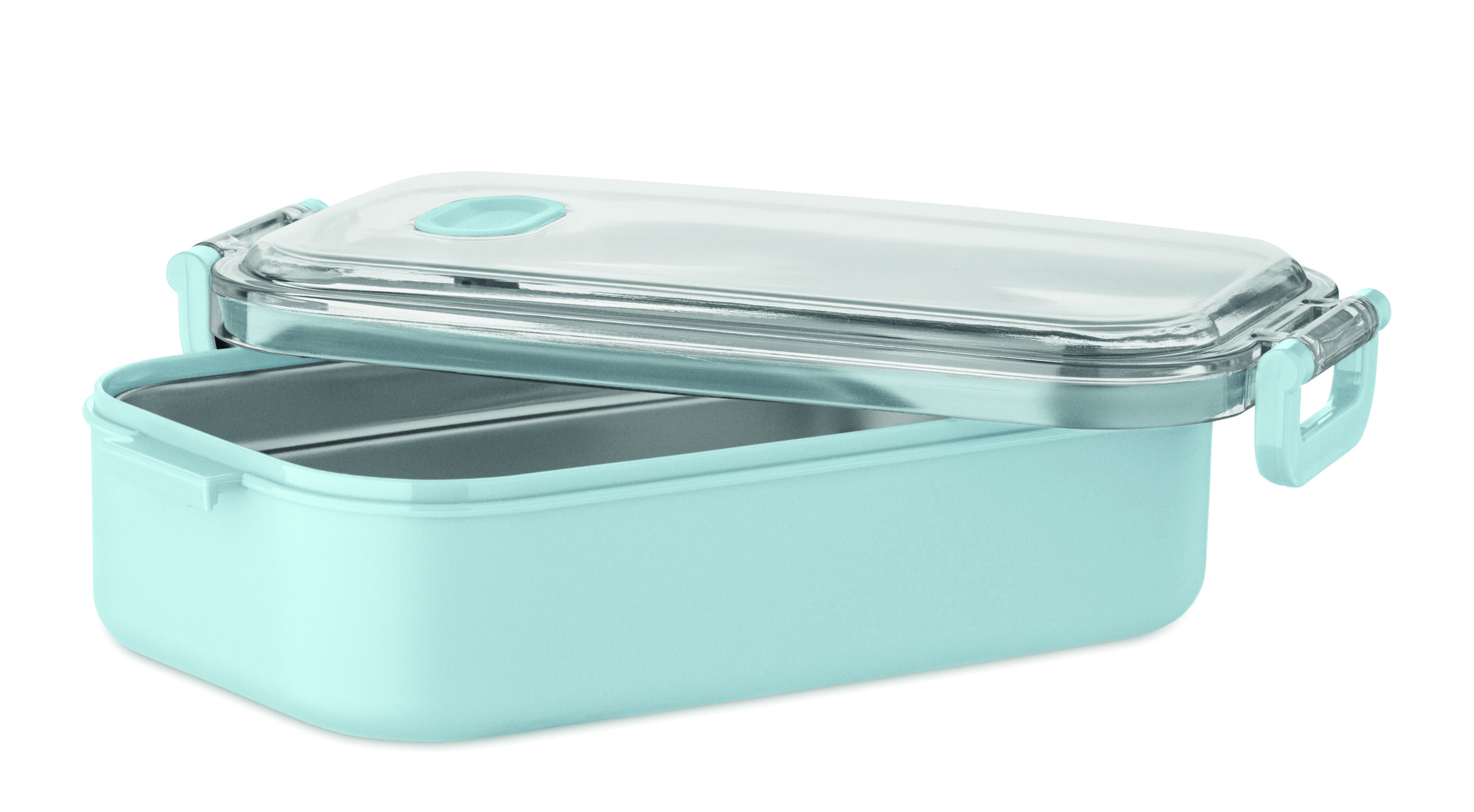 Lunchbox z PP z dodatkową warstwą wewnętrzną z recyklingowanej stali nierdzewnej. Szczelna pokrywa AS zapewnia świeżość i bezpieczeństwo żywności. Pojemność 750 ml bez tacki i 650 ml z tacką.