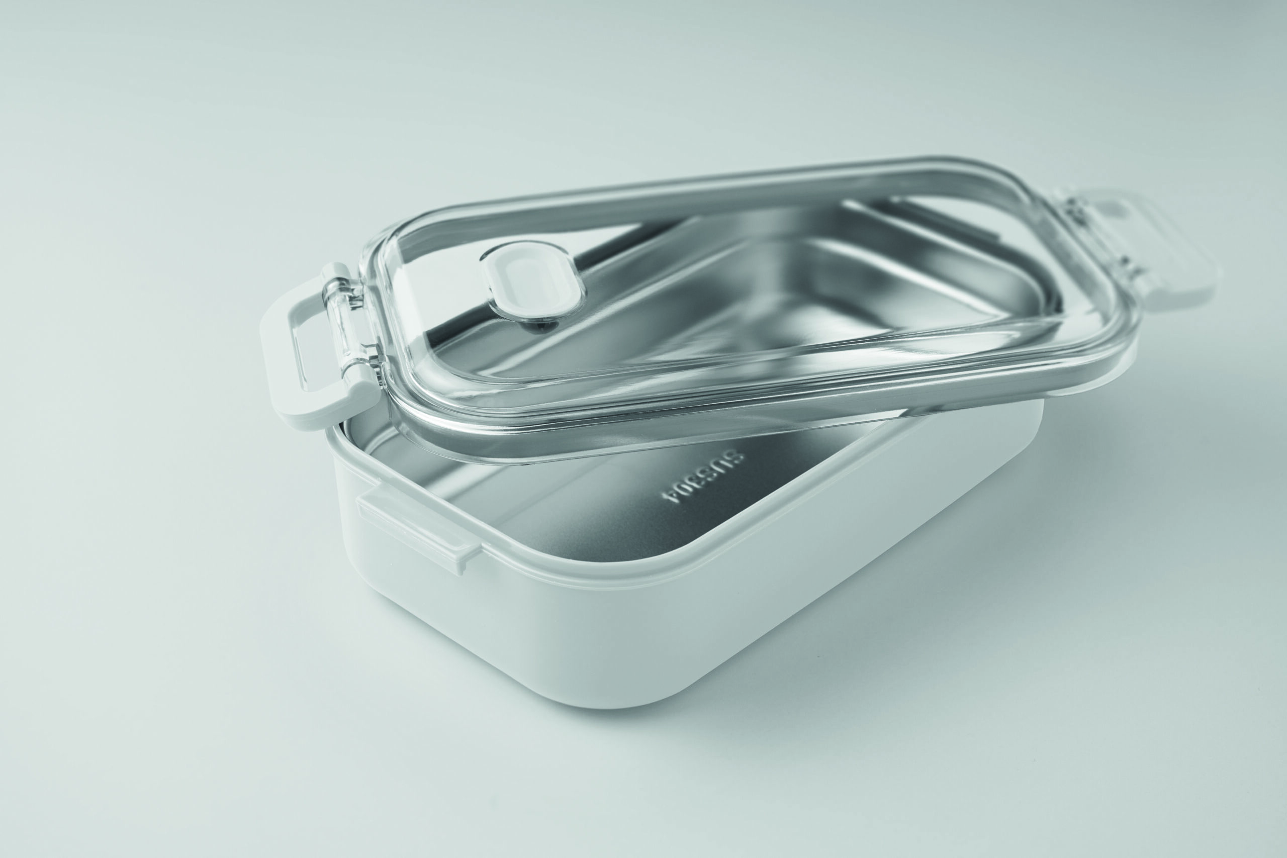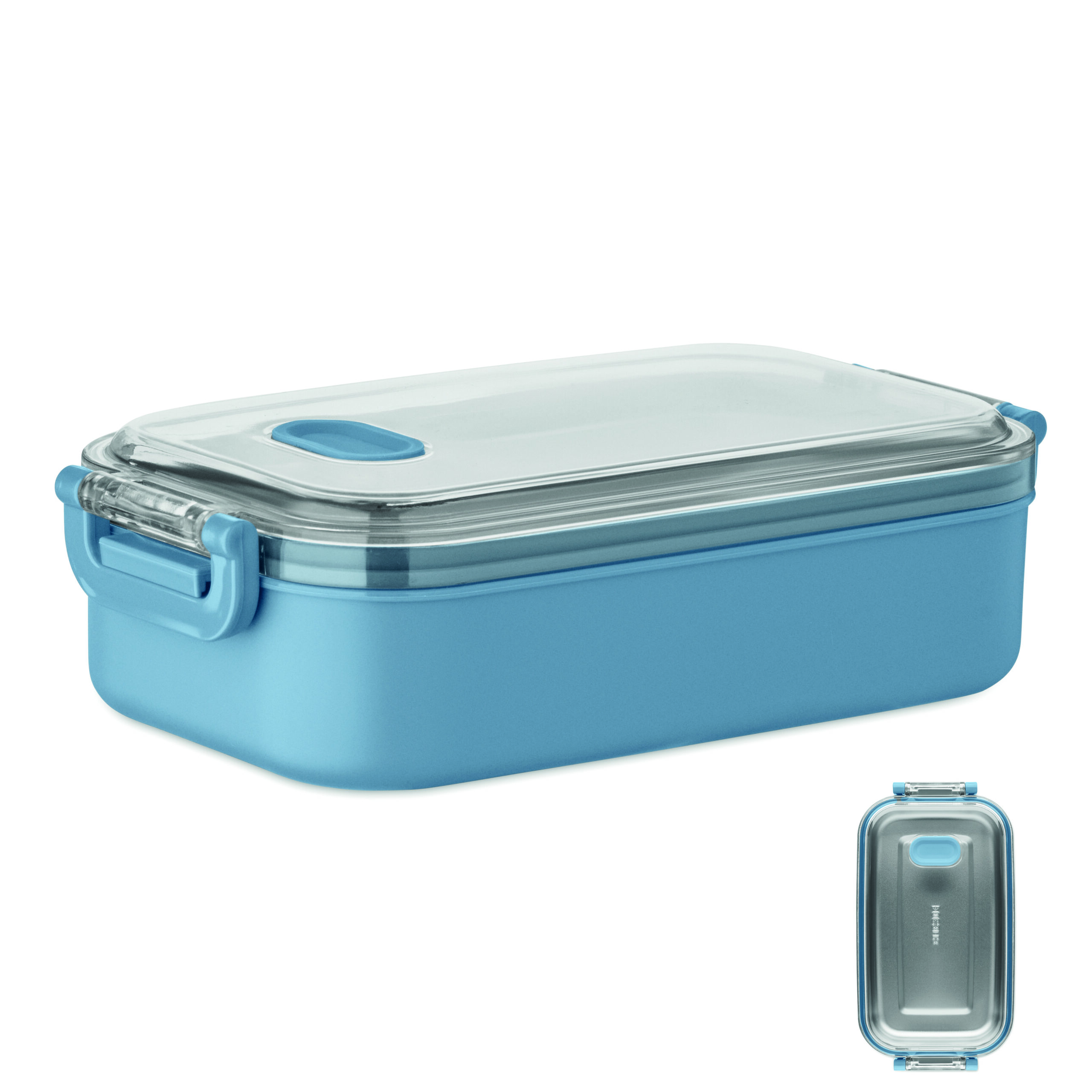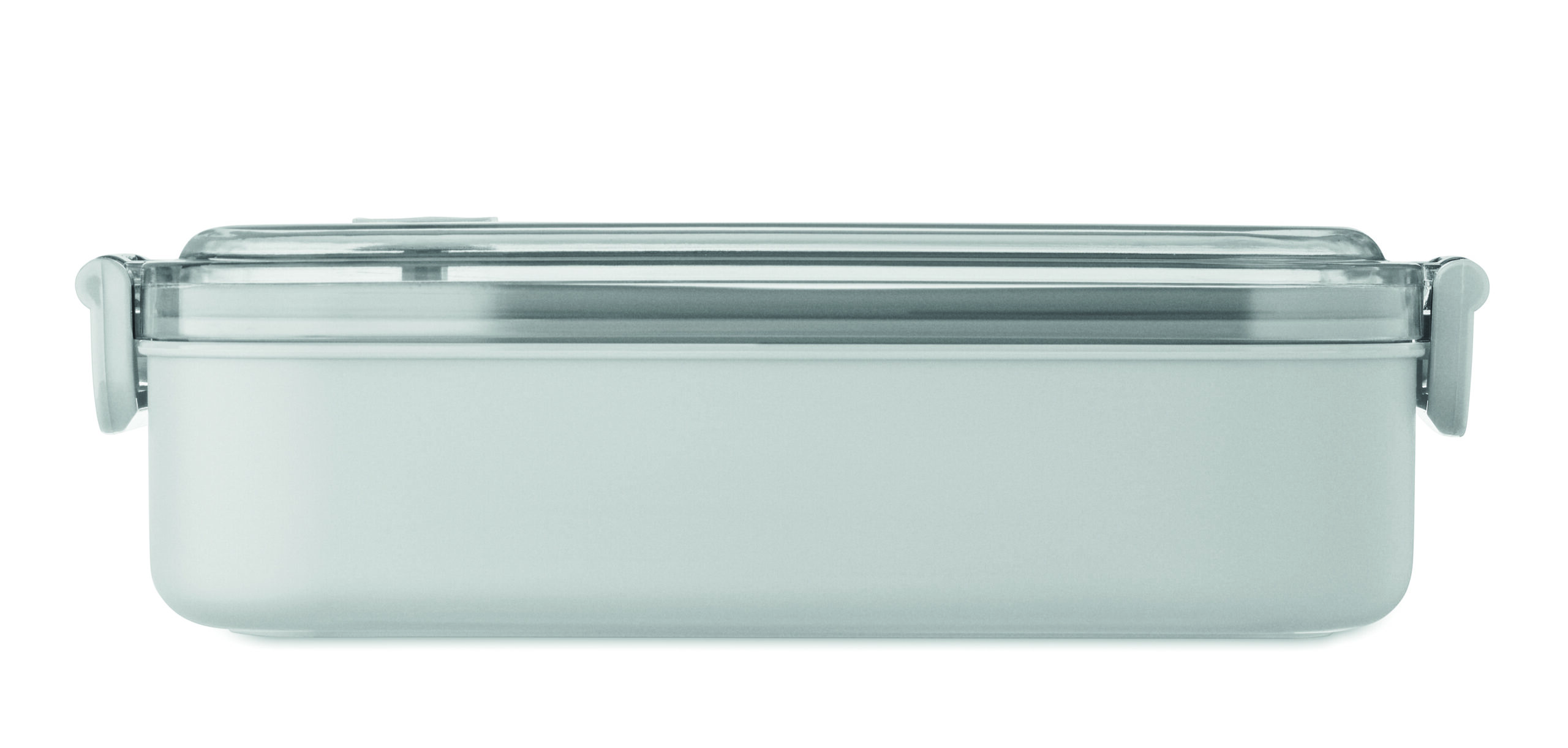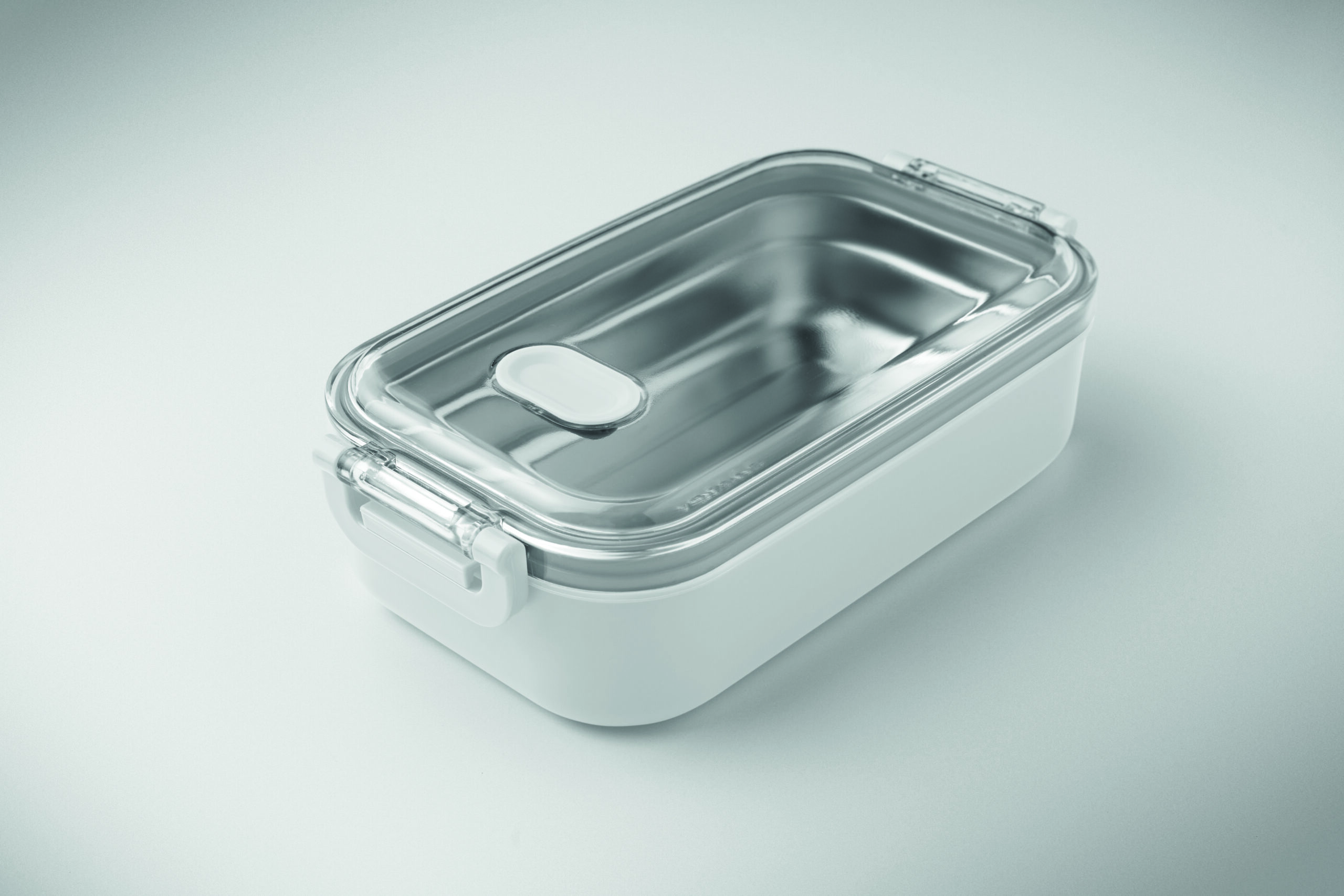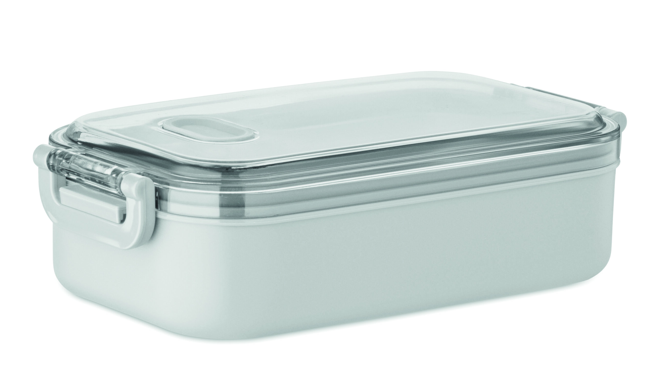 Lunchbox z PP z dodatkową warstwą wewnętrzną z recyklingowanej stali nierdzewnej. Szczelna pokrywa AS zapewnia świeżość i bezpieczeństwo żywności. Pojemność 750 ml bez tacki i 650 ml z tacką.