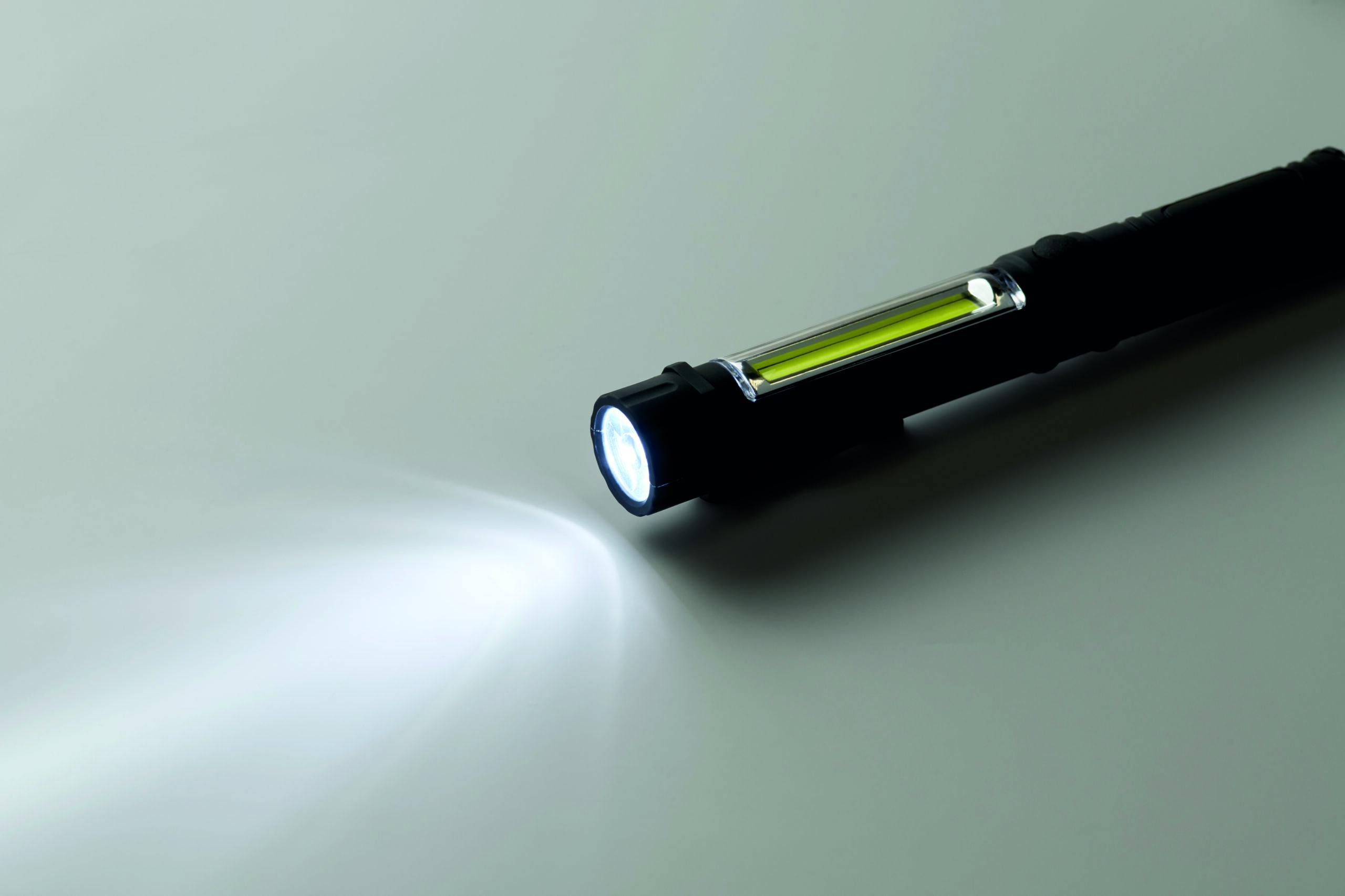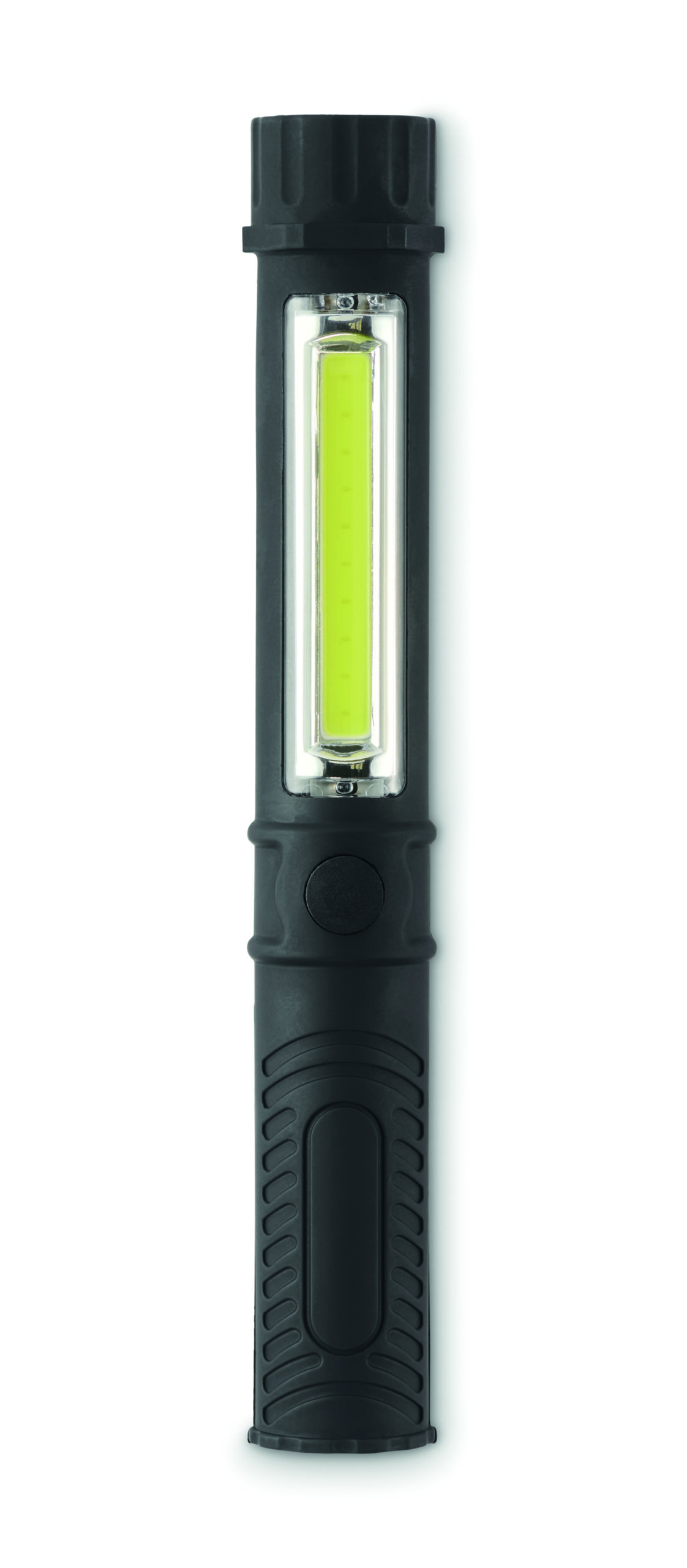 Magnetyczna latarka warsztatowa LED z tworzywa ABS z klipsem i bocznym światłem COB. Posiada magnetyczną podstawę do użytku bez użycia rąk. Wymaga 3 baterii AAA (brak w zestawie).