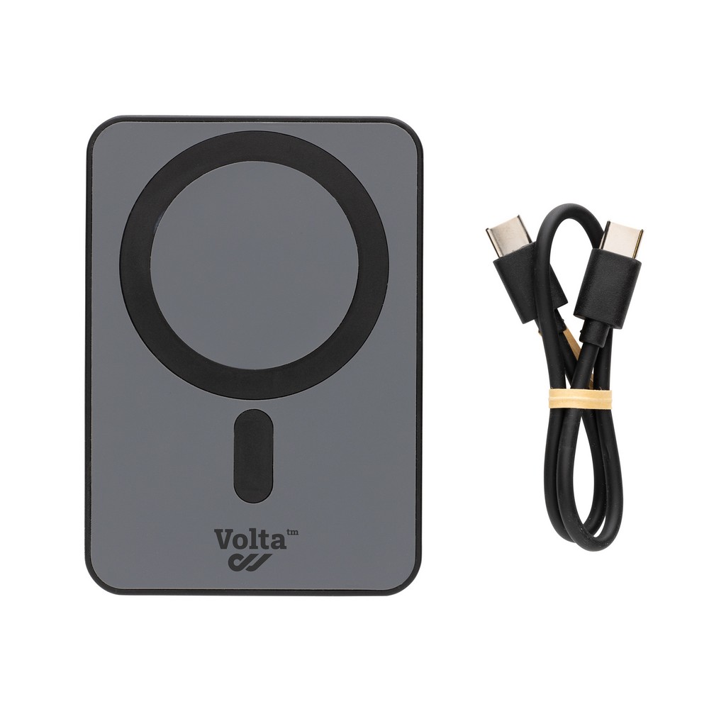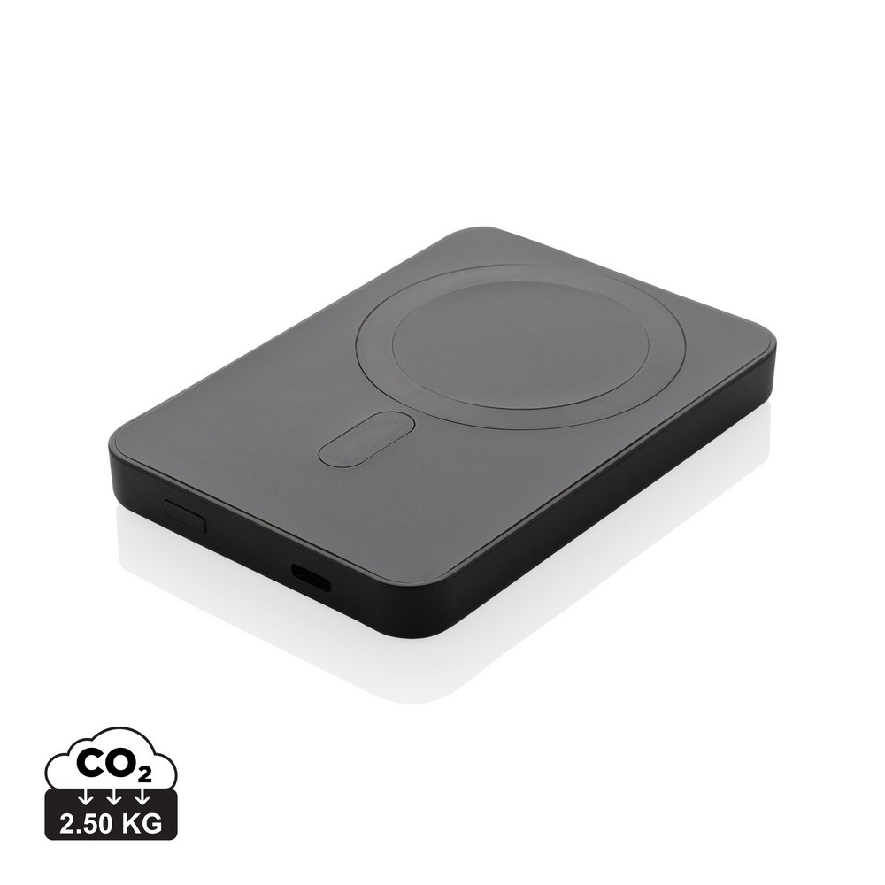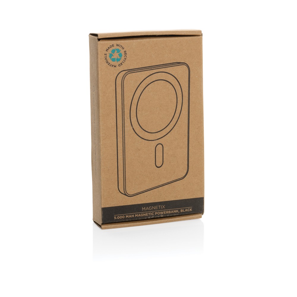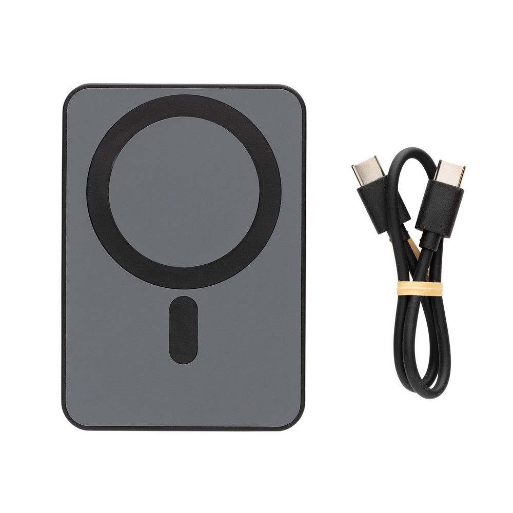 Power bank 5000 mAh, magnetyczna ładowarka bezprzewodowa 5W, wskaźniki poziomu naładowania, wykonany z ABS z recyklingu, całkowita zawartość materiałów z recyklingu obliczona na podstawie wagi całkowitej przedmiotu: 20%, wejście USB typu C 5V/2.4A, wyjście USB typu C 5V/2.4A, kabel w komplecie, w pudełku z certyfikatem FSC® mix, ślad węglowy produktu: 2,5 kg CO2