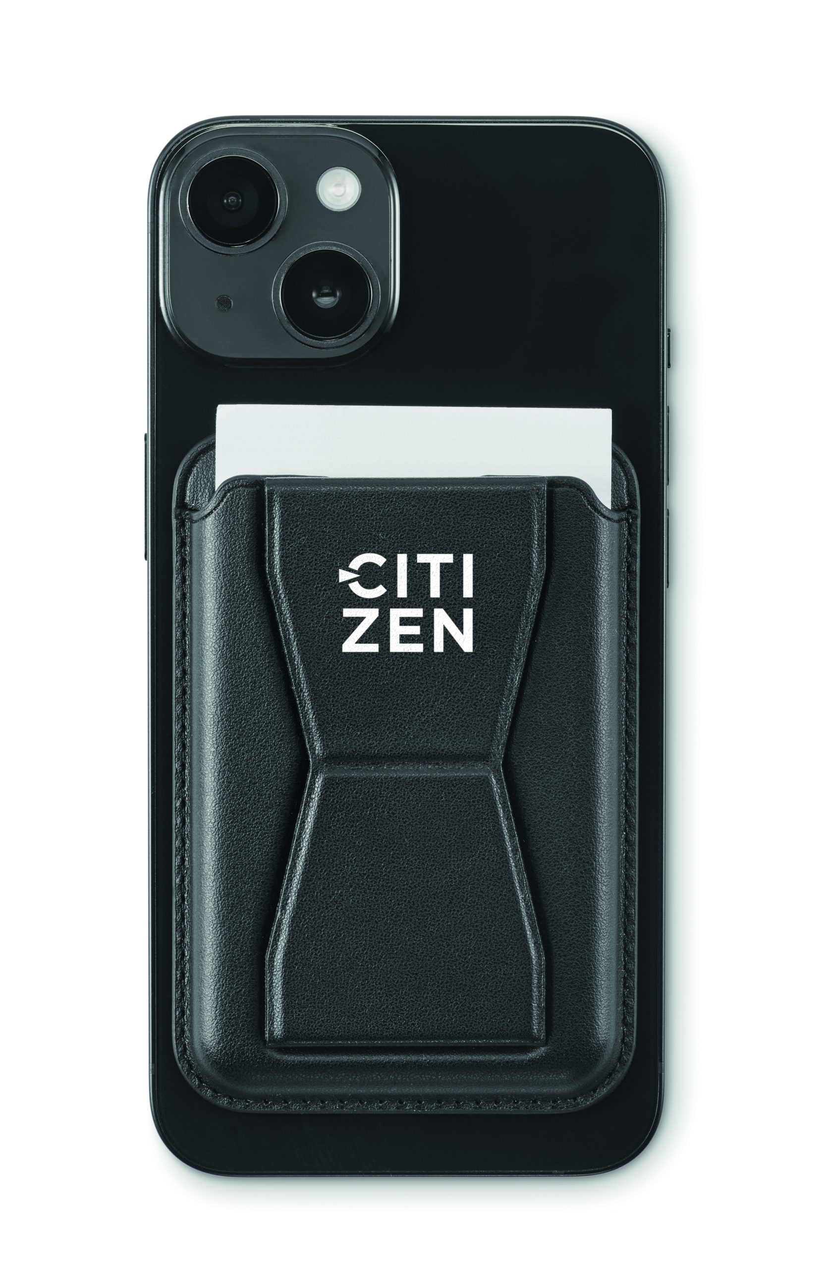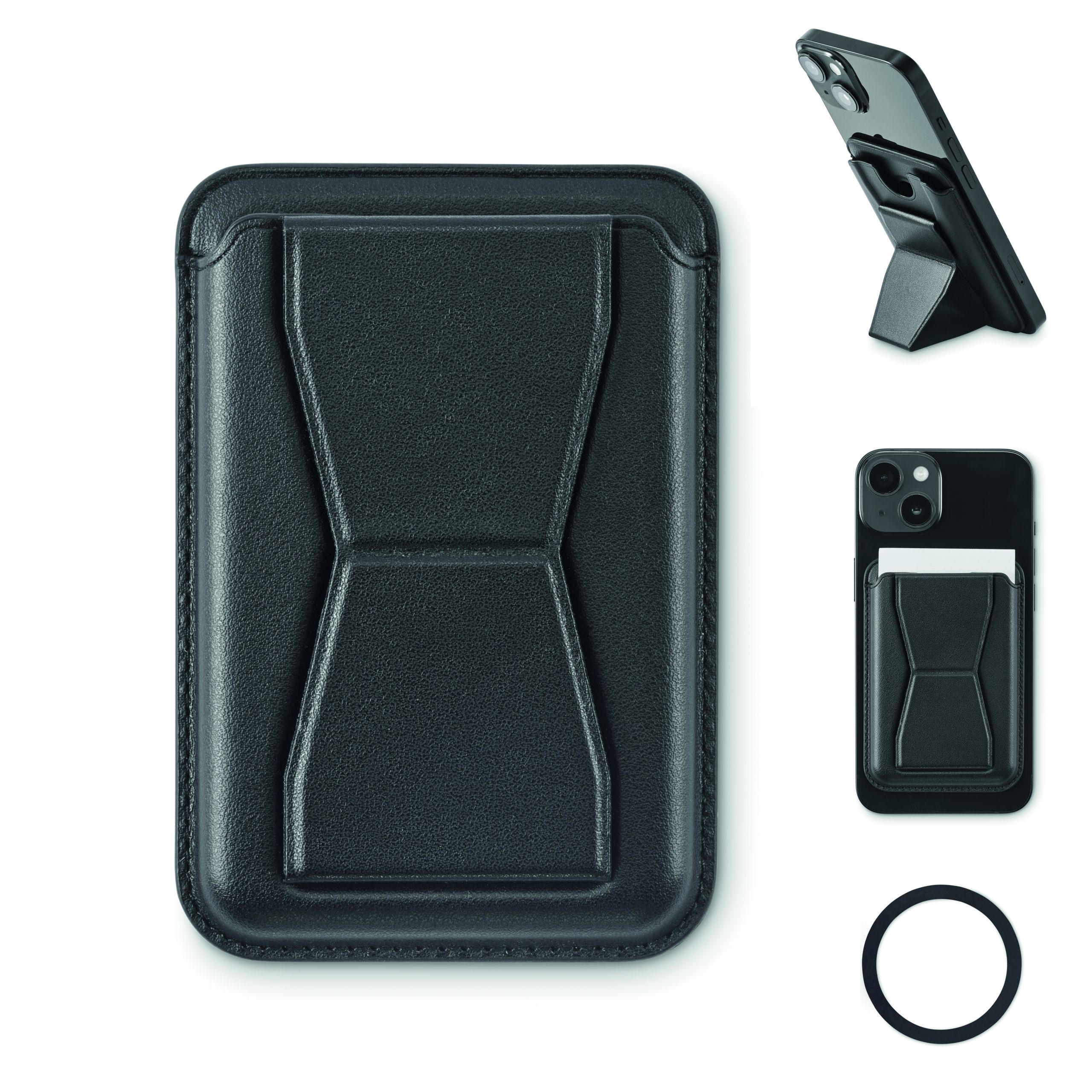 Etui na telefon ze skóry PU z funkcją podstawki i magnetycznym zamknięciem. Kompatybilny z iPhone® 12 i nowszymi. Zawiera magnetyczny metalowy pierścień do obsługi ładowania innych niemagnetycznych telefonów z możliwością ładowania bezprzewodowego.