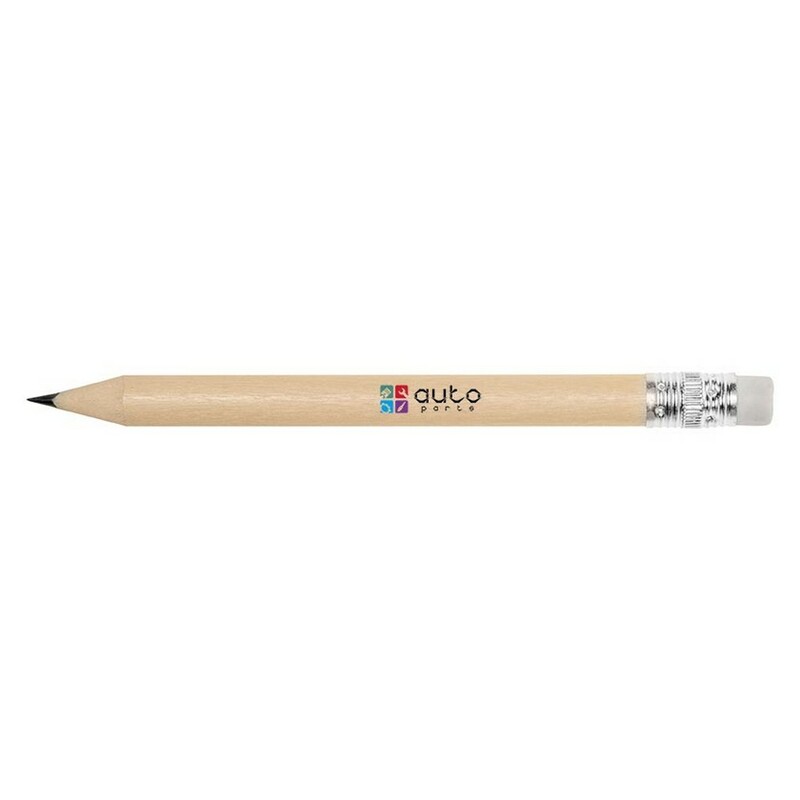 Mini ołówek z gumką, posiada naostrzoną końcówkę, może służyć jako przydatny gadżet dla np. sklepów w branży budowlanej, produkt wykonany z drewna