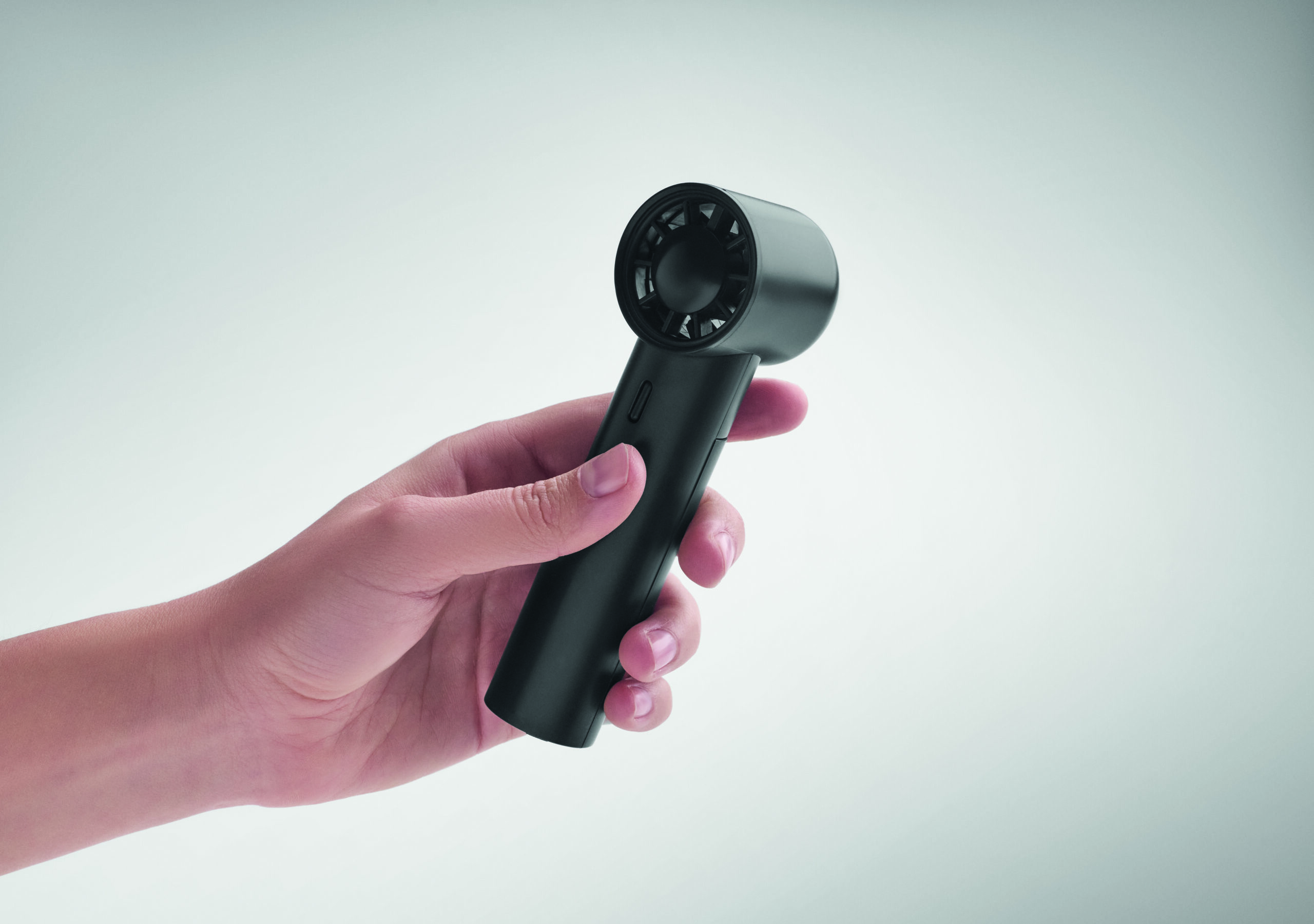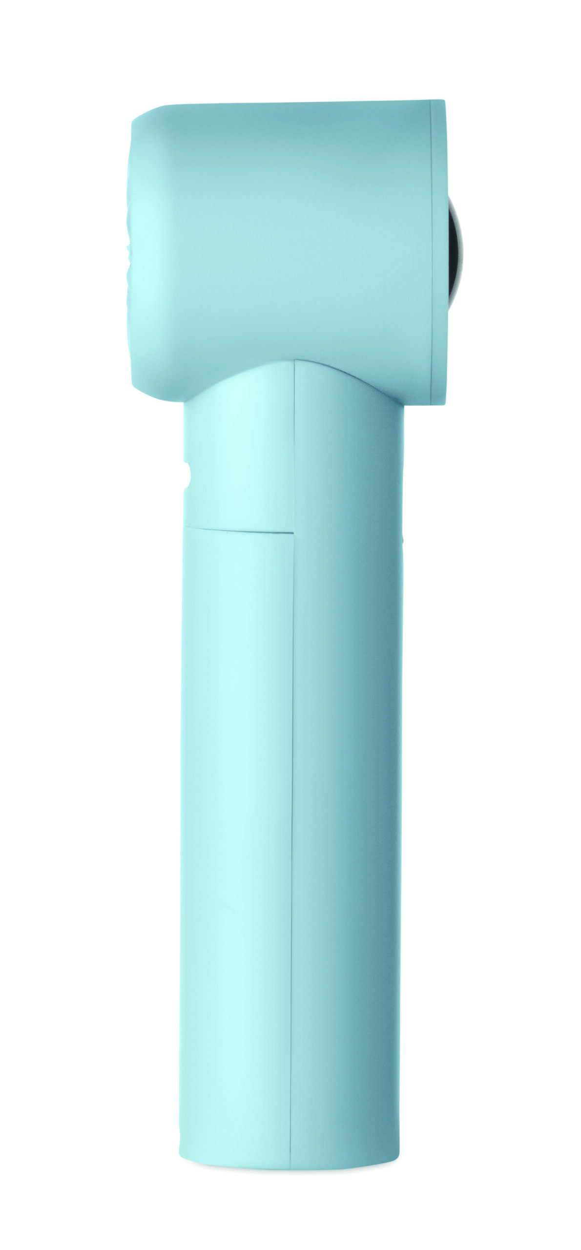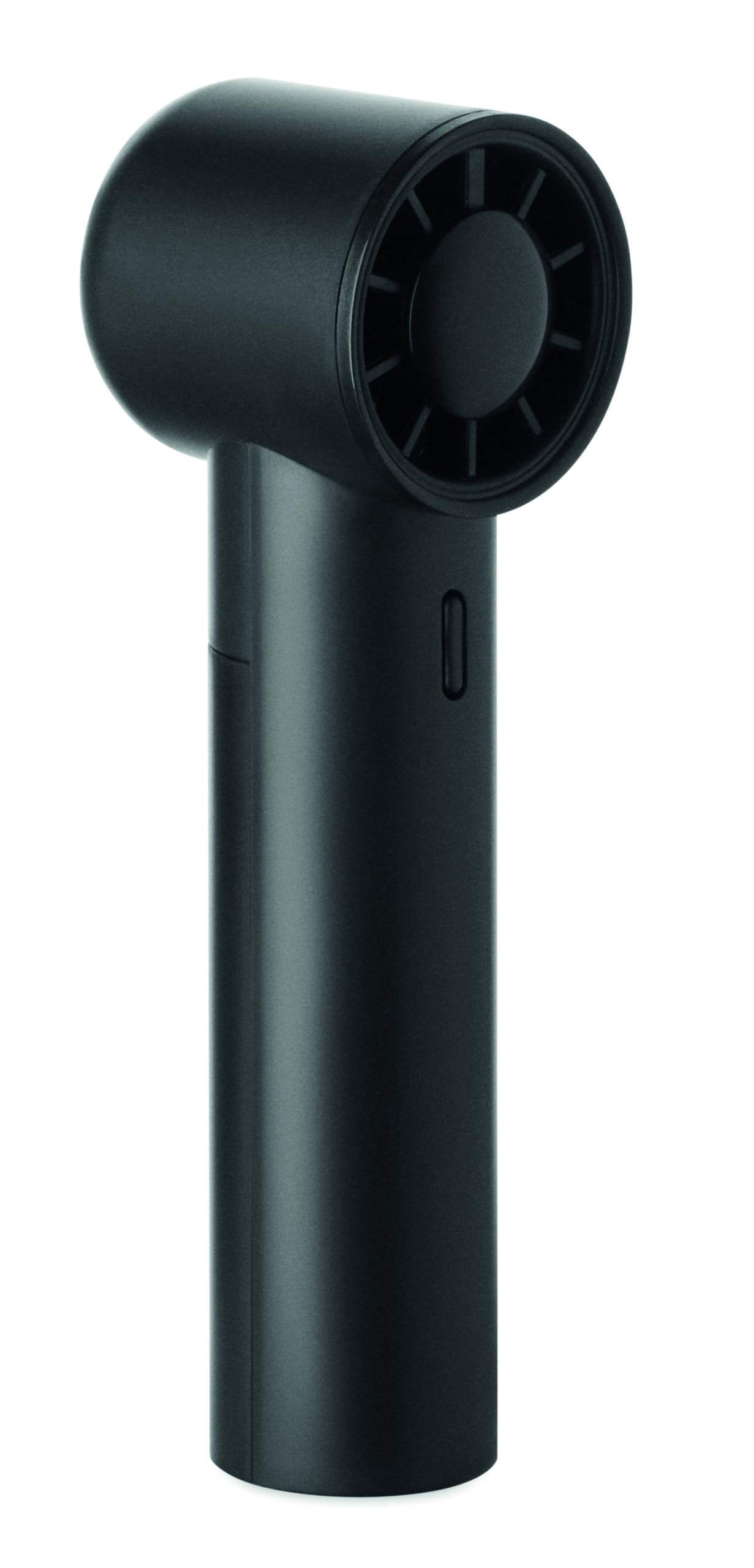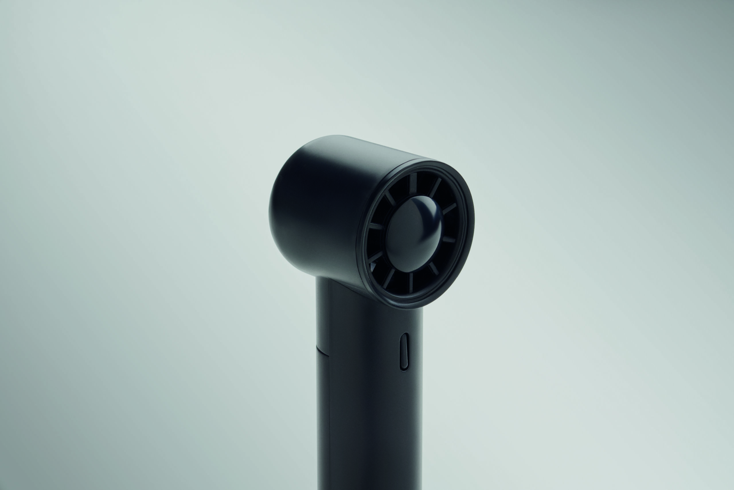 Mini wentylator ręczny z tworzywa ABS z wyświetlaczem i 5 ustawieniami prędkości. Zawiera wymienny akumulator litowy o pojemności 2600 mAh.
