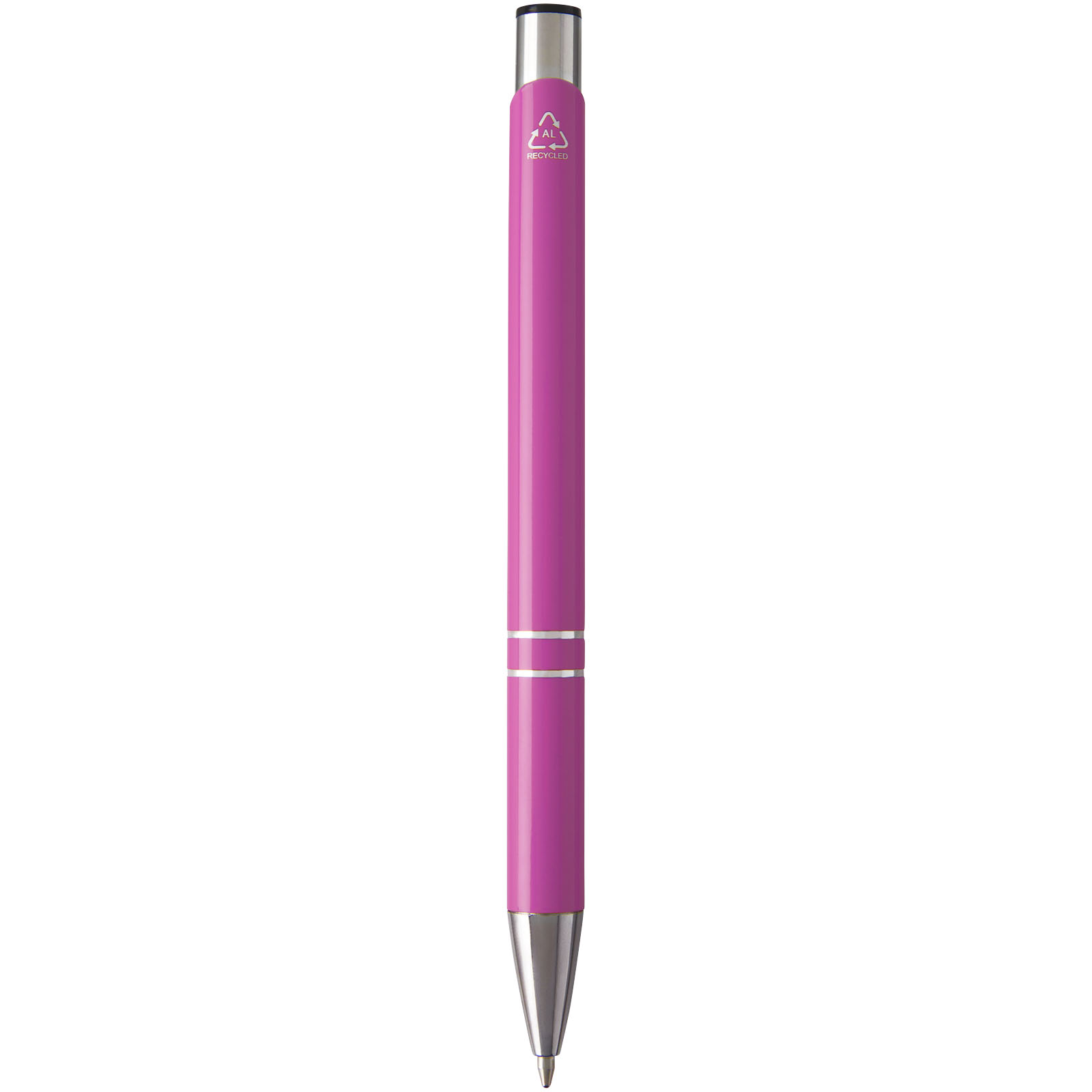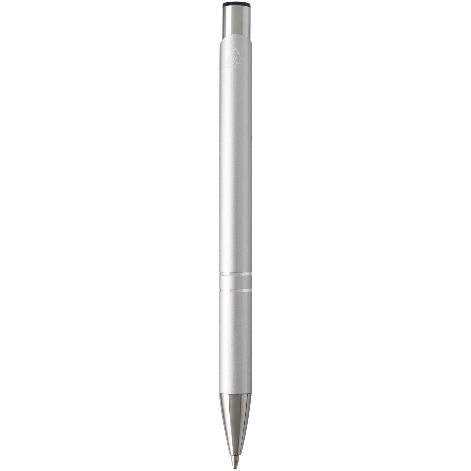 Długopis wykonany z aluminium z recyklingu z lakierowanym wykończeniem, połyskiem i wyrazistymi chromowanymi detalami. Aluminium z recyklingu wymaga mniej energii niż produkcja aluminium z surowców, co sprawia, że jest bardziej ekologiczne. Ogranicza również ilość odpadów na wysypiskach śmieci i pomaga chronić zasoby naturalne w celu zmniejszenia emisji gazów cieplarnianych. Czarny tusz. Żywotność: 600 metrów.
