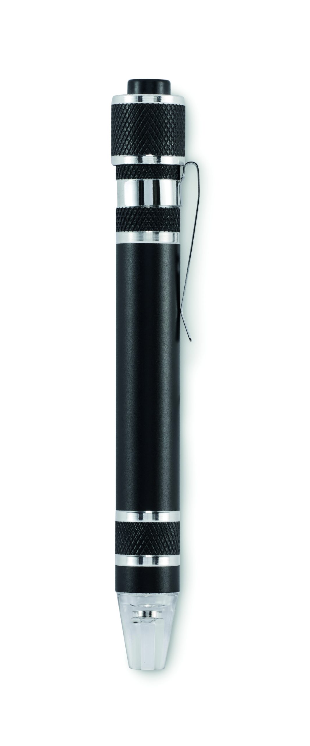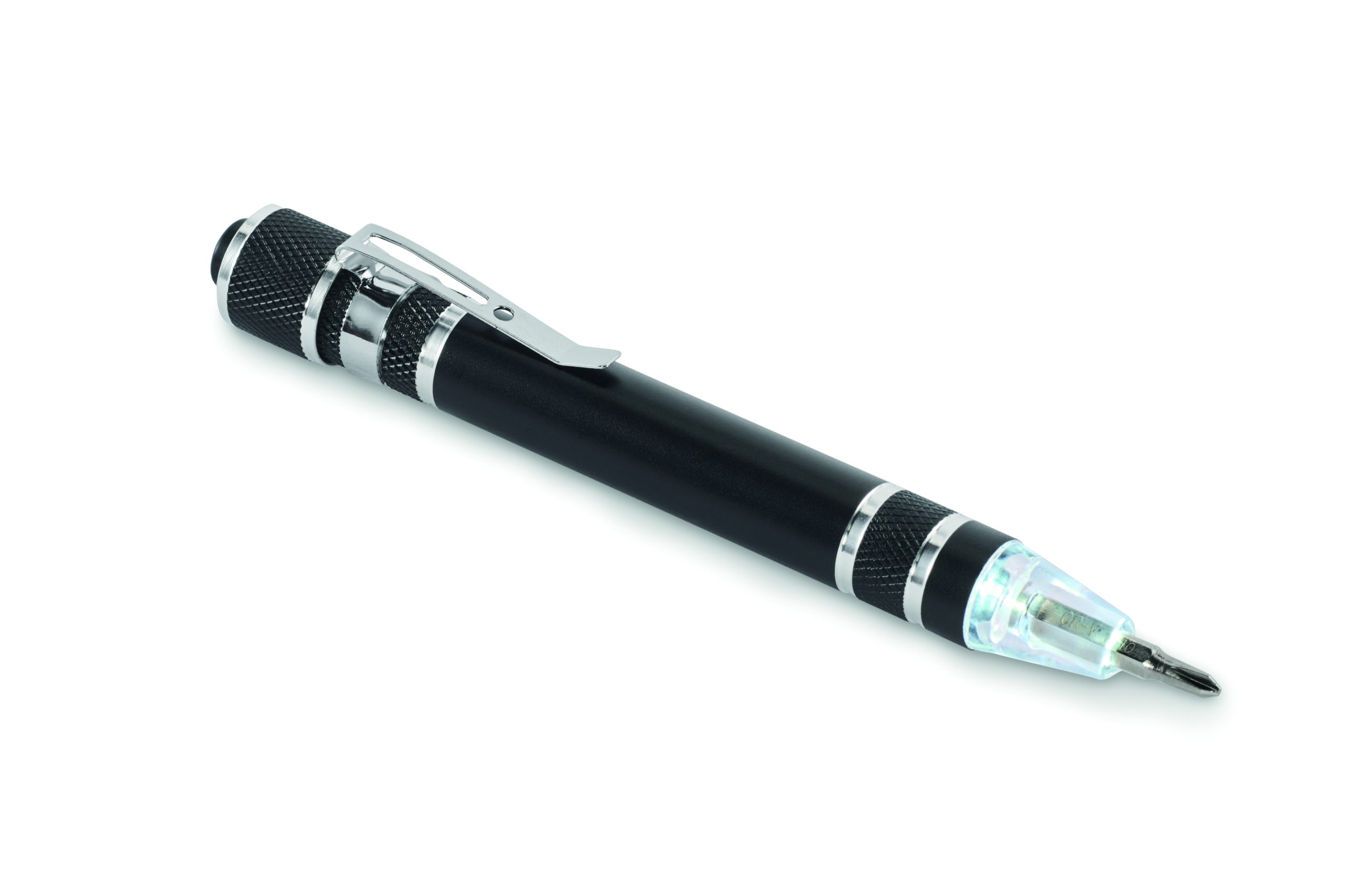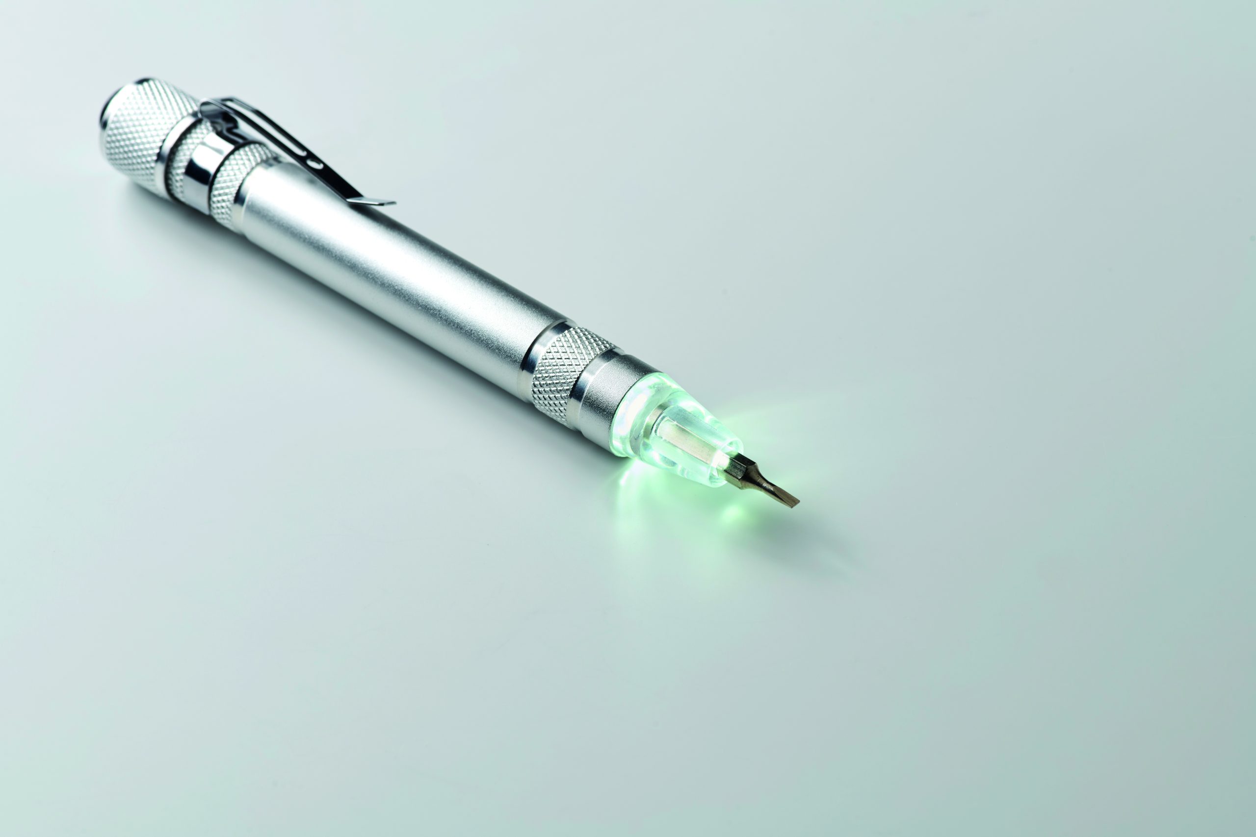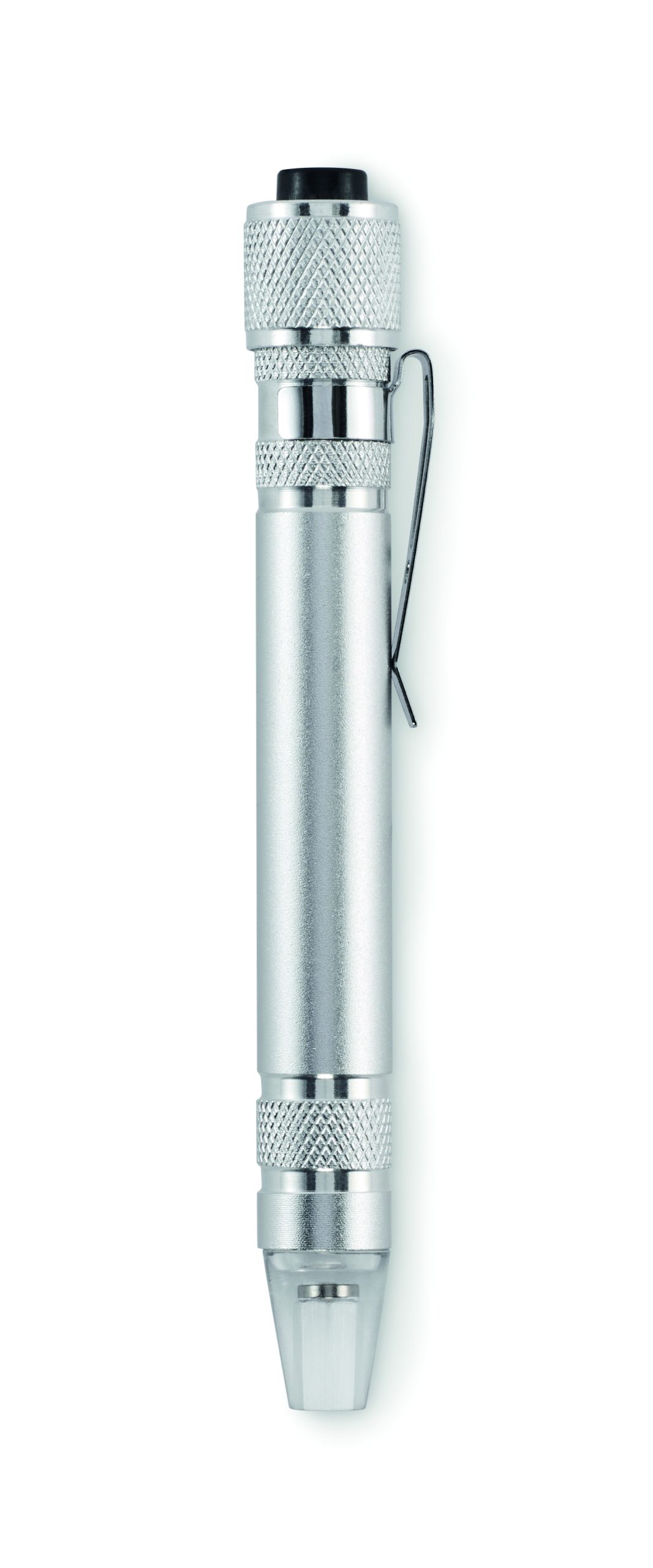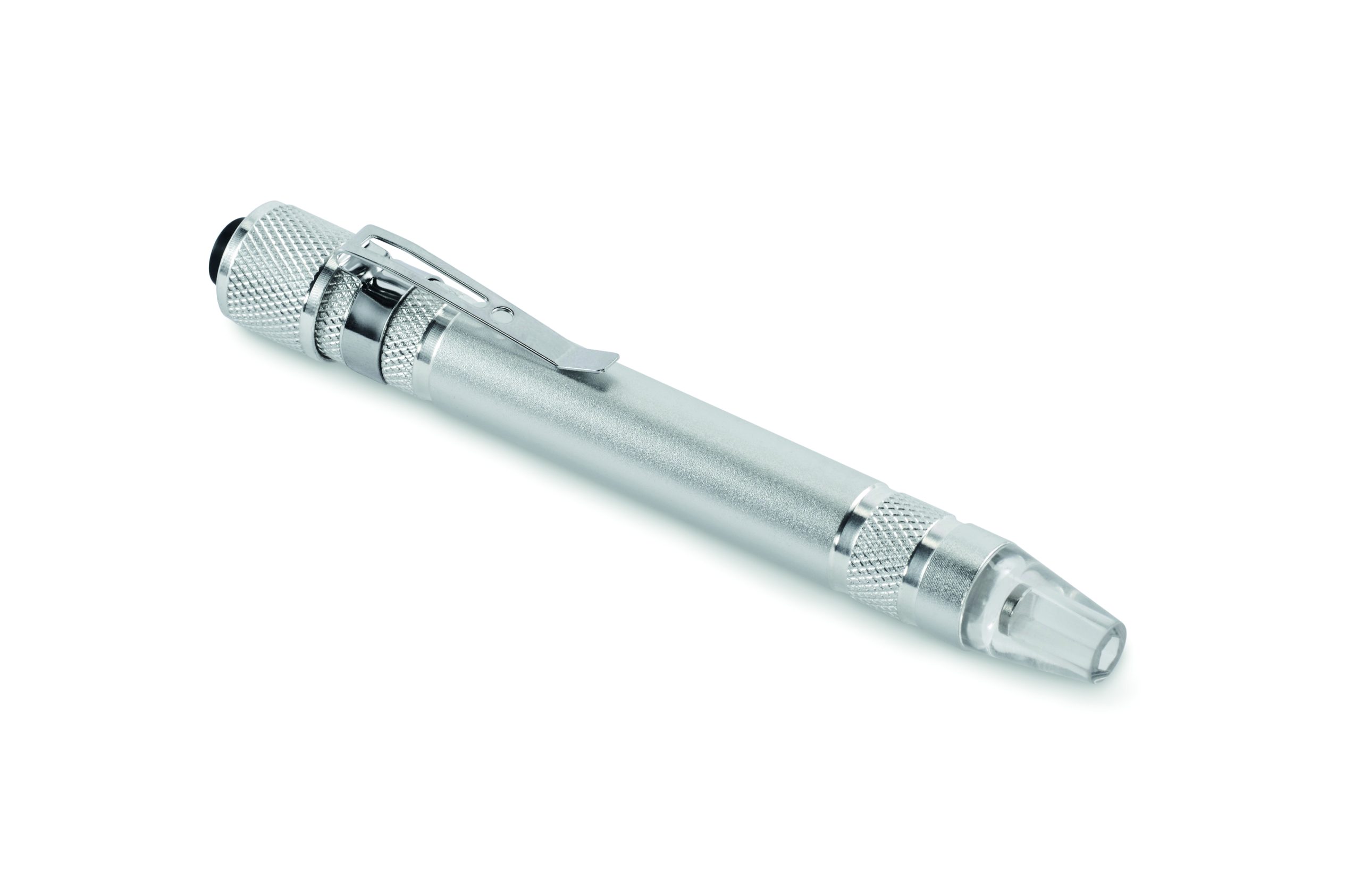 Aluminiowe narzędzie wielofunkcyjne z recyklingu w kształcie długopisu z latarką. Zawiera 3 śrubokręty płaskie i 3 krzyżakowe. w zestawie 4 baterie guzikowe LR41.