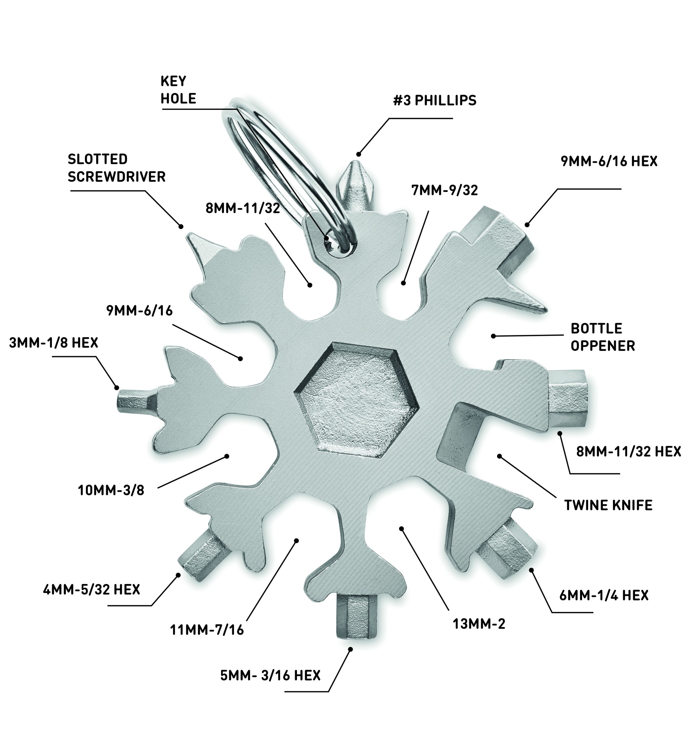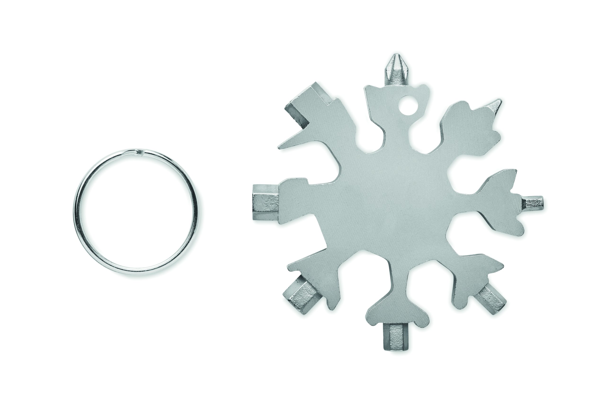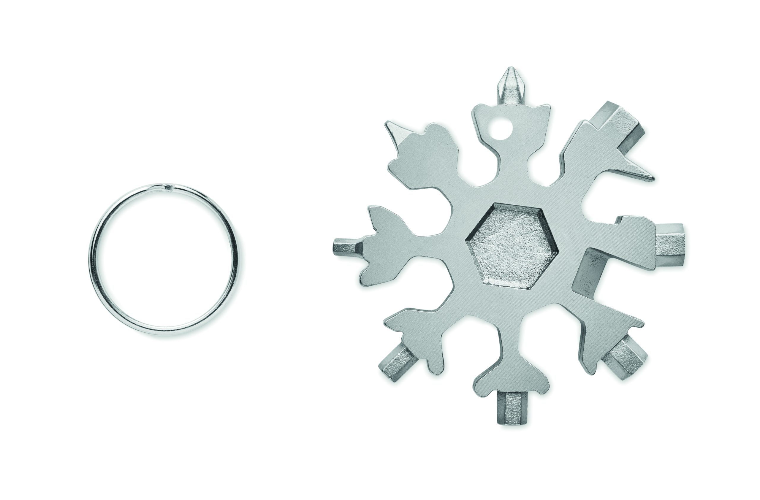 Narzędzie wielofunkcyjne 17 w 1 w kształcie płatka śniegu ze stali nierdzewnej. Opcjonalnie dołączony metalowy pierścień.
