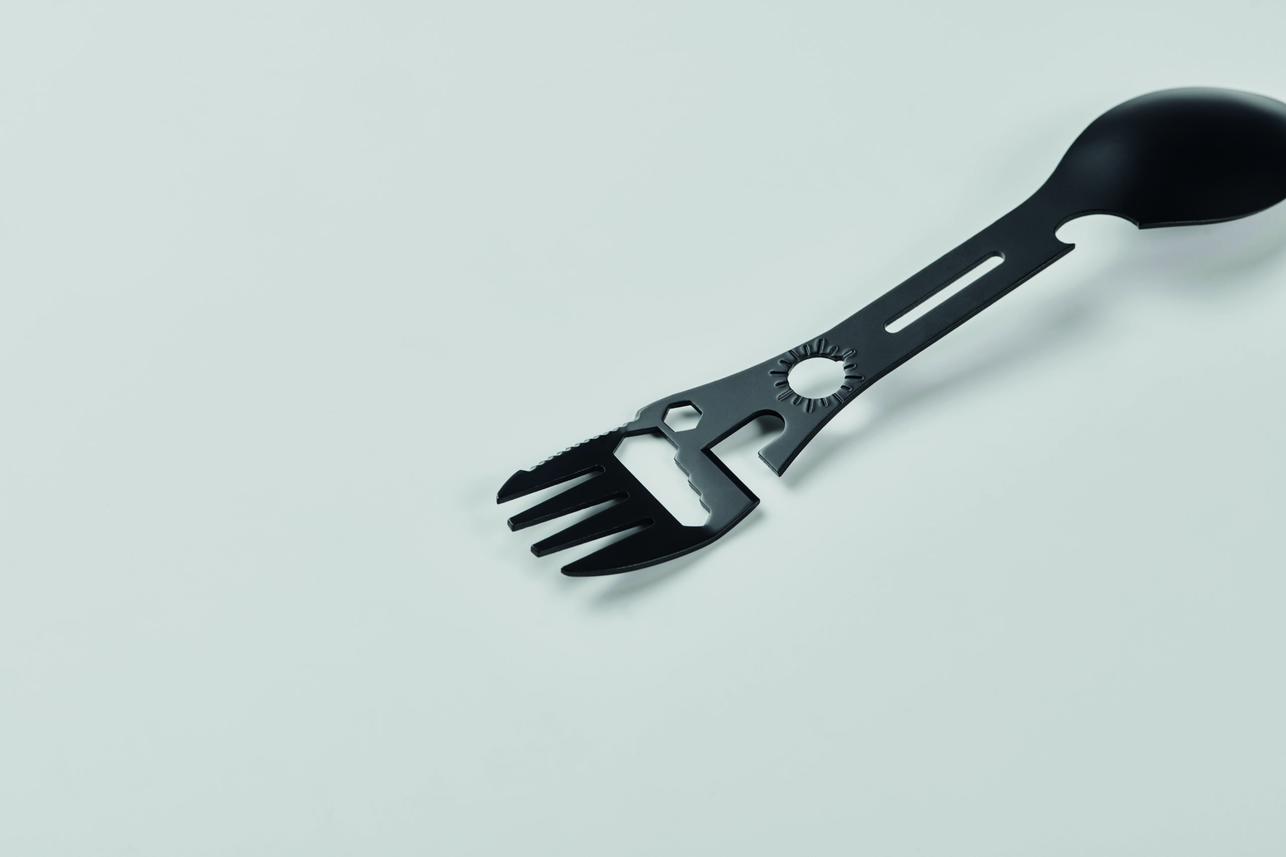 Naczynia stołowe wielofunkcyjne ze stali nierdzewnej. Narzędzia obejmują łyżkę, widelec, klucz nastawny, otwieracz do butelek, klucz sześciokątny, nóż ząbkowany, otwieracz i klucz pozycjonujący.