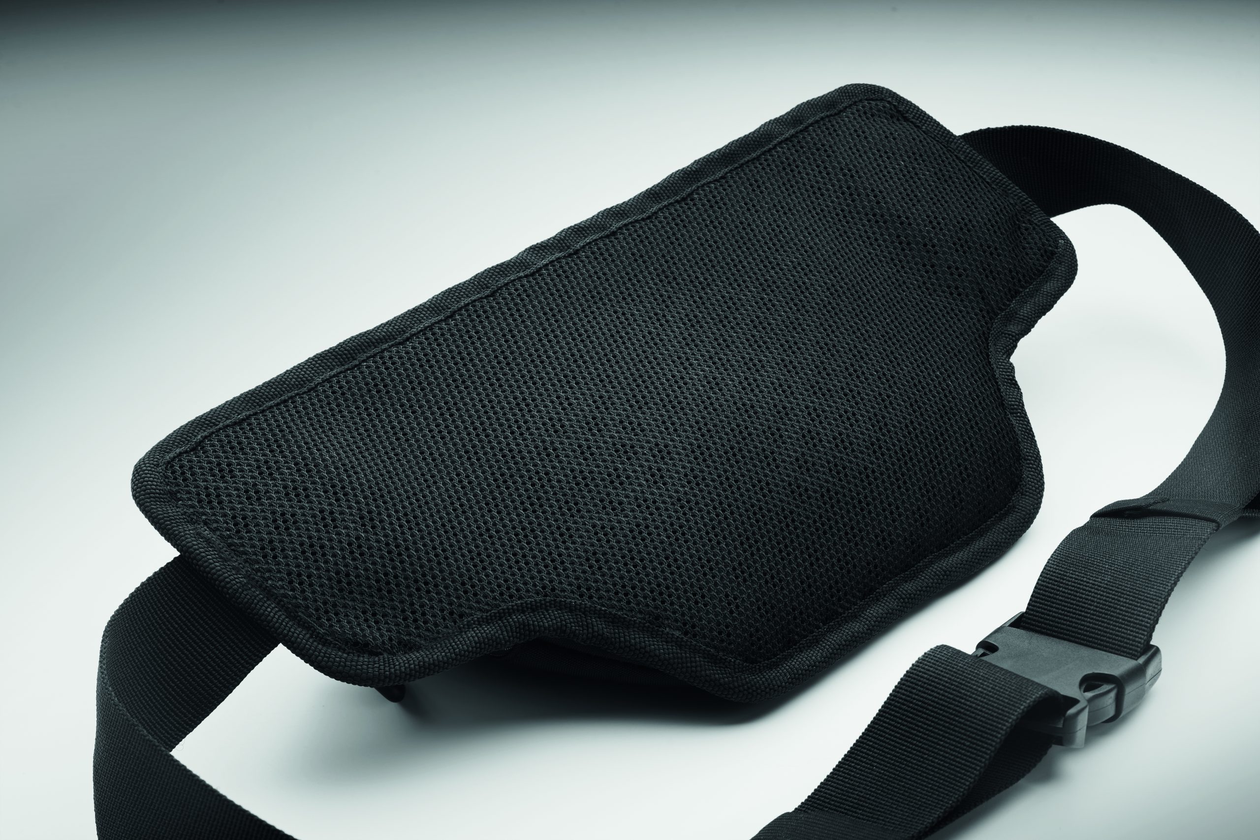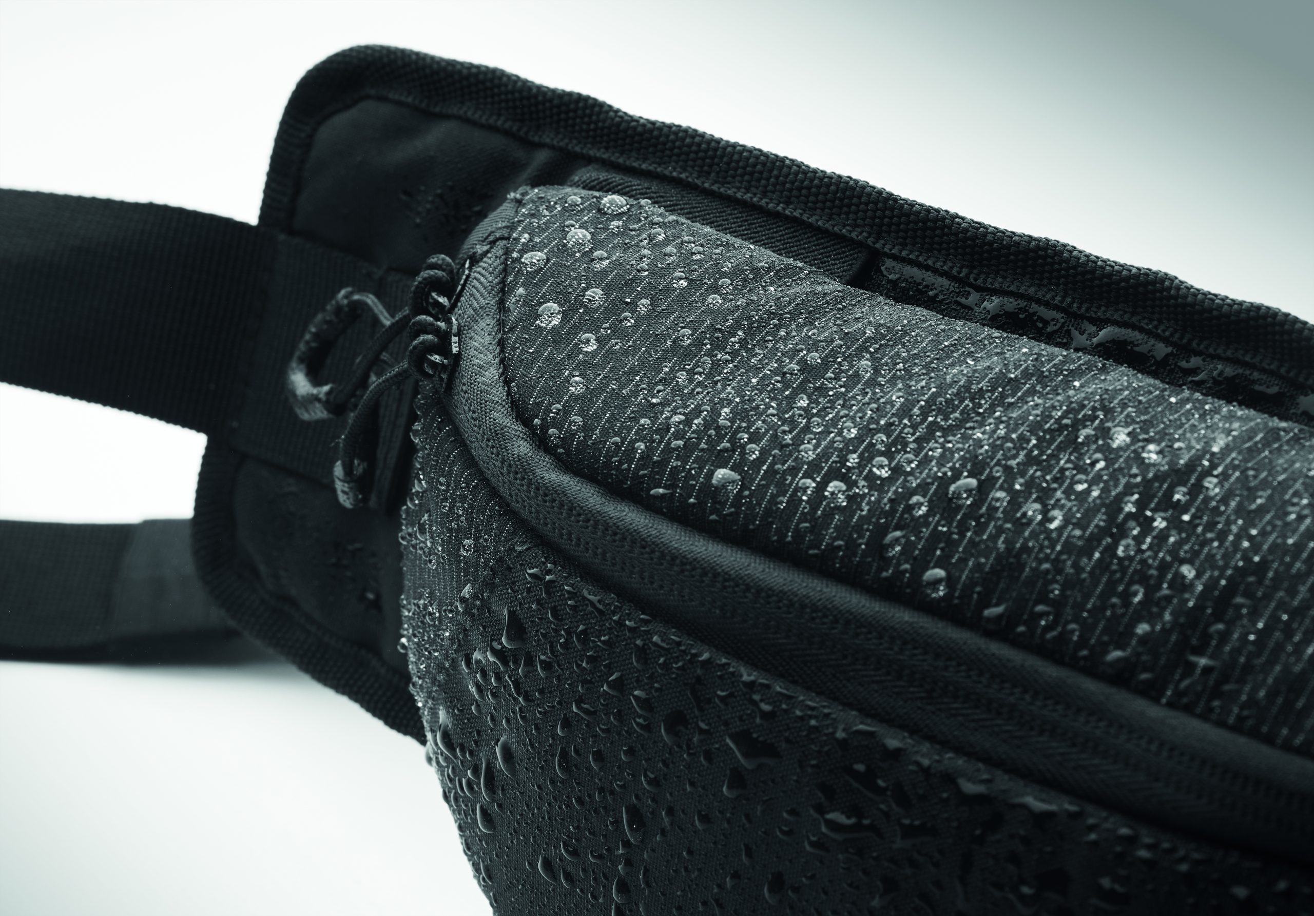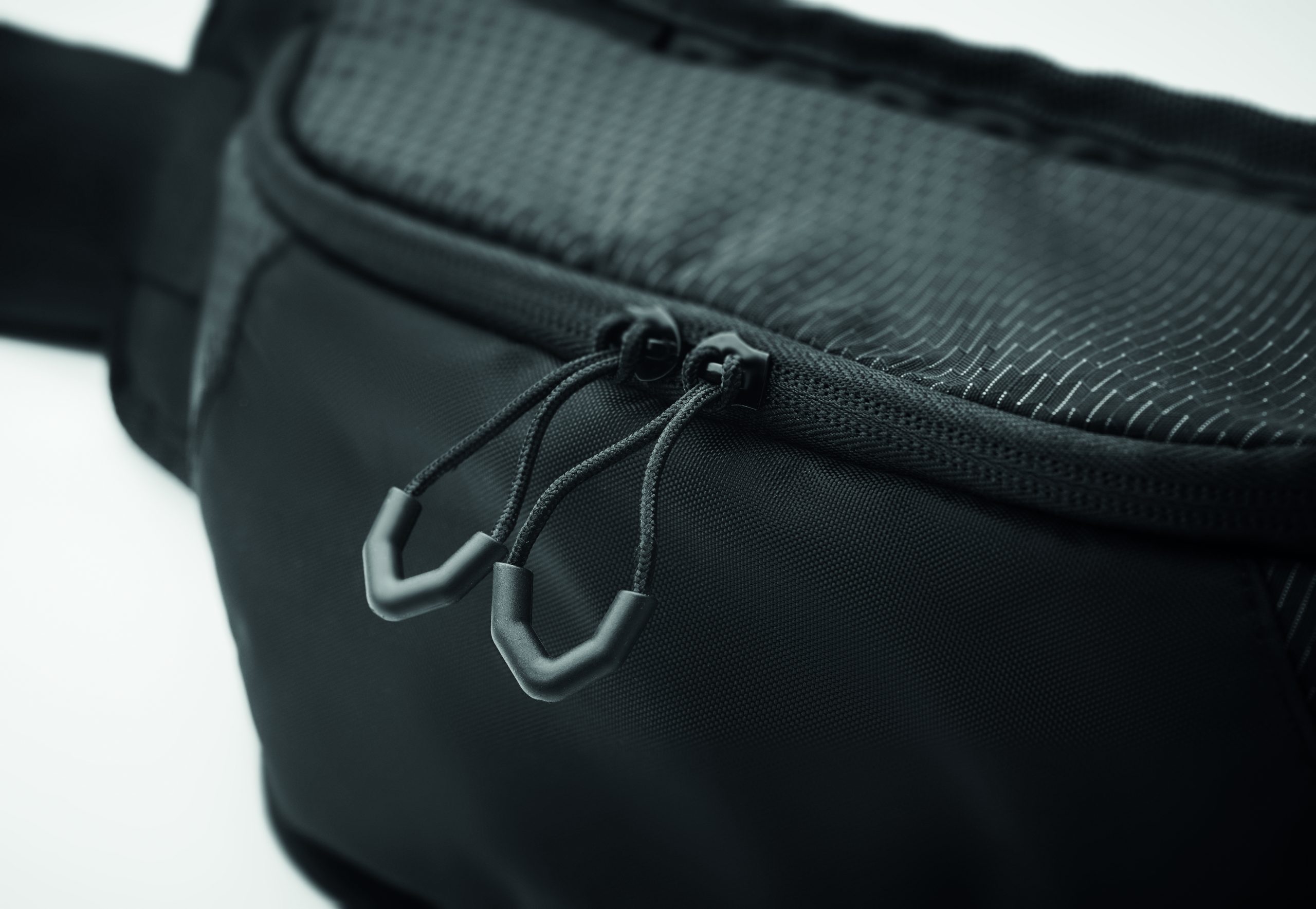 Turystyczna torba biodrowa typu nerka z wodoodpornego nylonu 420D z poliestrową podszewką 210D. W pełni wyściełana komora główna i duży dwukierunkowy zamek błyskawiczny. Wentylowany tył.