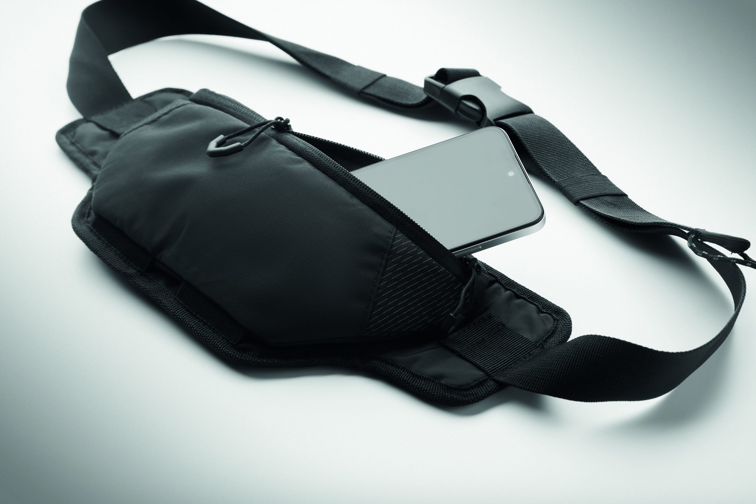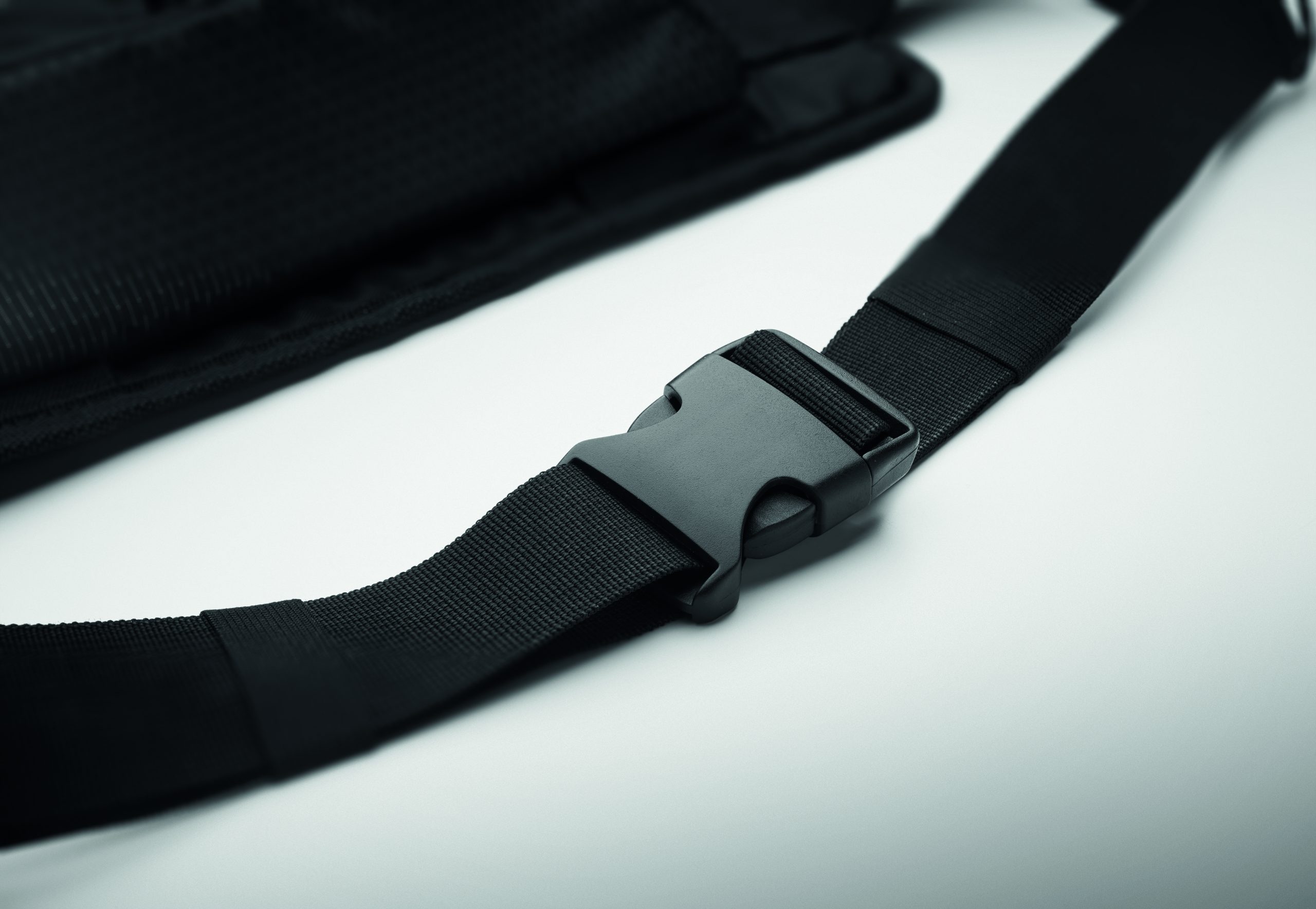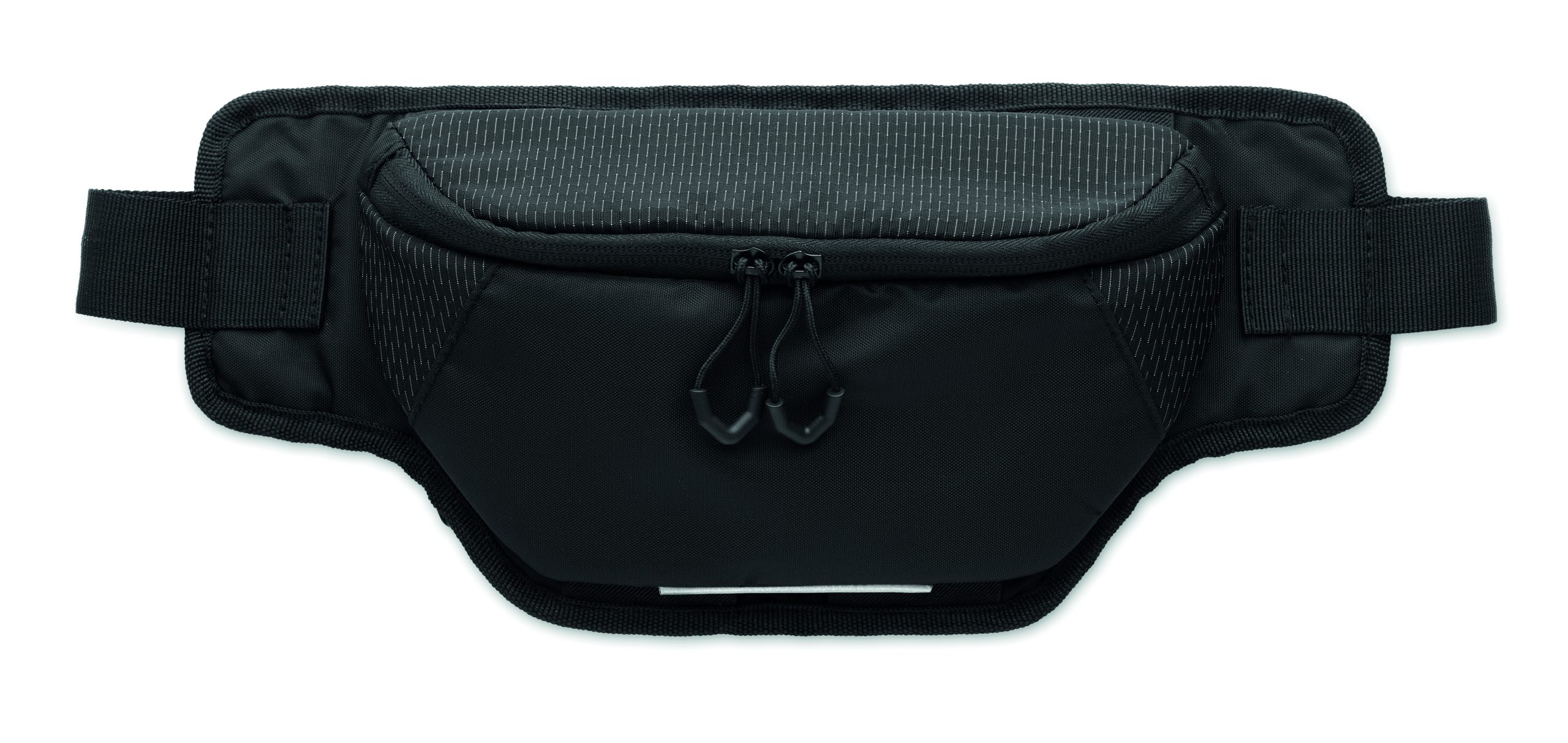 Turystyczna torba biodrowa typu nerka z wodoodpornego nylonu 420D z poliestrową podszewką 210D. W pełni wyściełana komora główna i duży dwukierunkowy zamek błyskawiczny. Wentylowany tył.