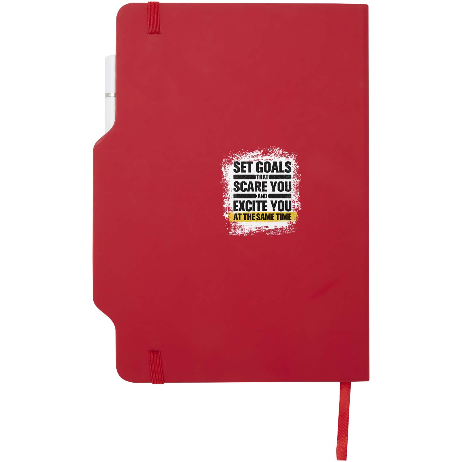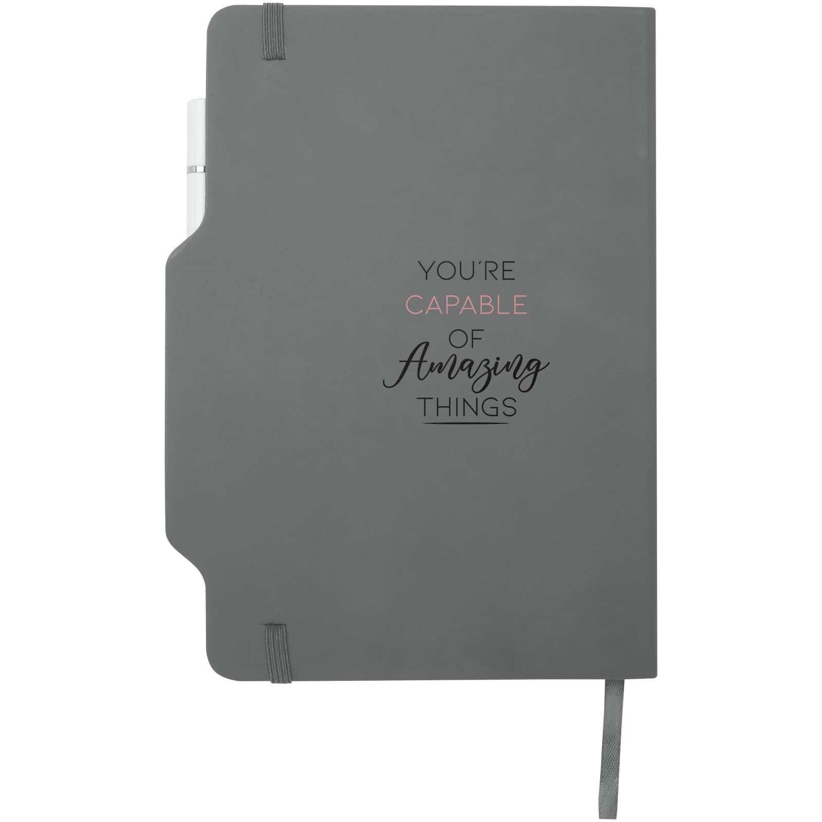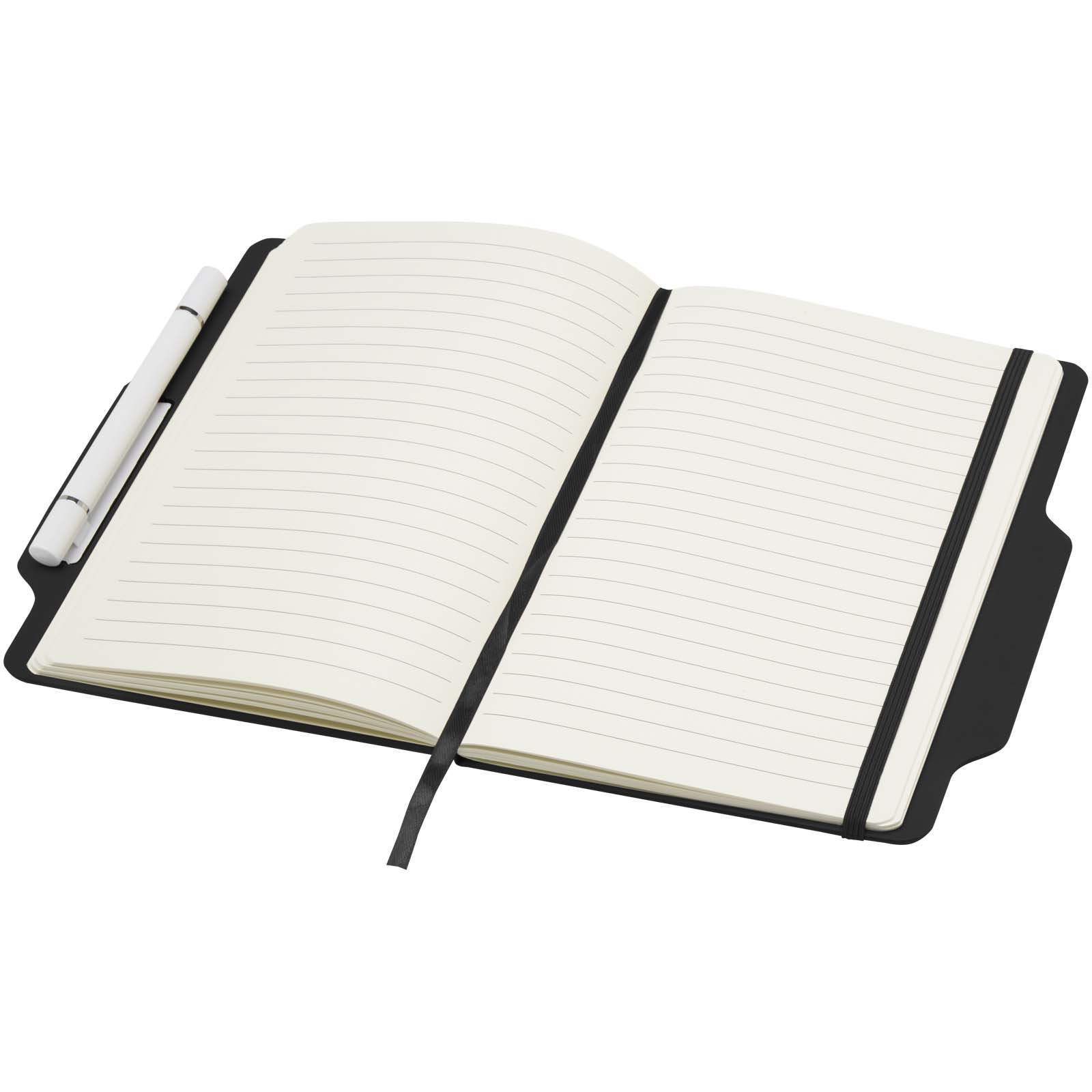 Notatnik w twardej okładce Nexus w formacie A5 z zestawem długopis/ołówek zawiera 80 kremowych kartek w linie o gramaturze 70 g/m² oraz ma zaokrąglone rogi, elastyczne zamknięcie i wstążkową zakładkę. Długopis ma dwie końcówki, z których jedna jest długopisem z czarnym tuszem, a druga ołówkiem. Długość linii pisania długopisem: 1000 metrów. Rozmiar stalówki: 1,00 (mm).