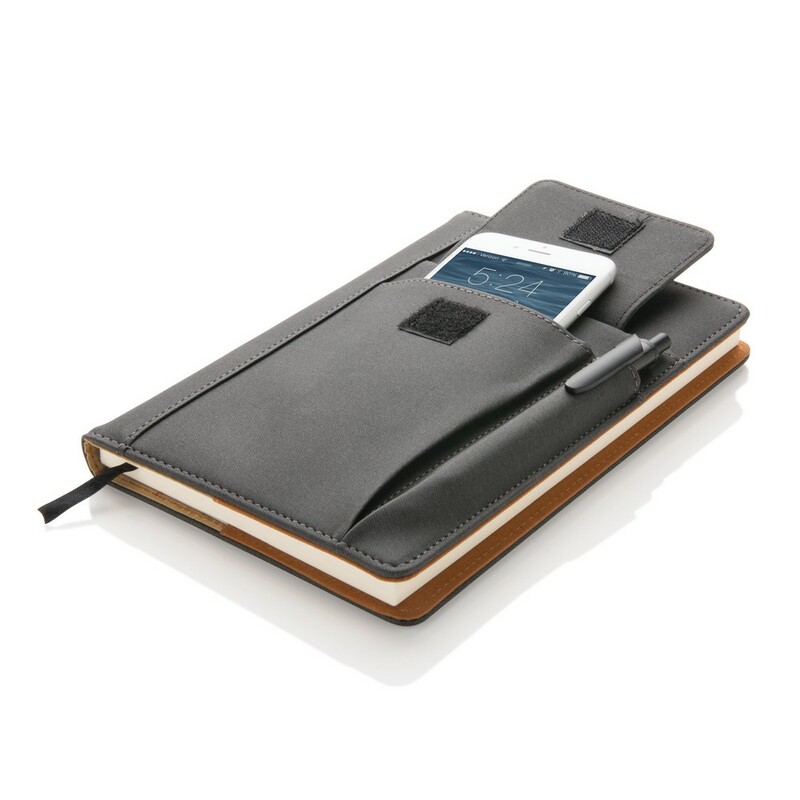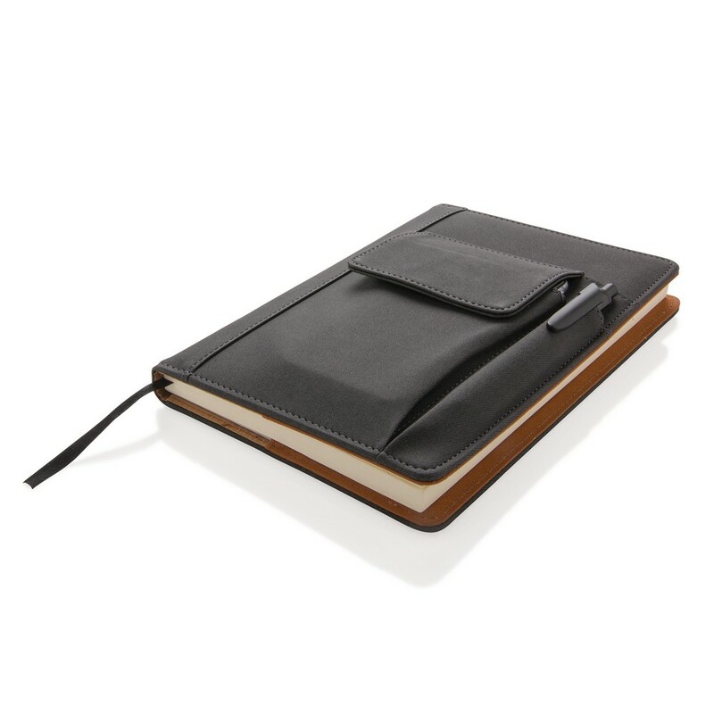 Notatnik A5 (80 kartek 80 g/m2 w linie), pokryta PU okładka wielokrotnego użytku, przednia kieszeń na telefon (14 x 10 cm), miejsce na przybory do pisania, czarna tasiemka zakładkowa, po zapisaniu wszystkich stron okładkę można użyć ponownie, wystarczy wymienić notatnik na nowy, ślad węglowy produktu: 1,16 kg CO2