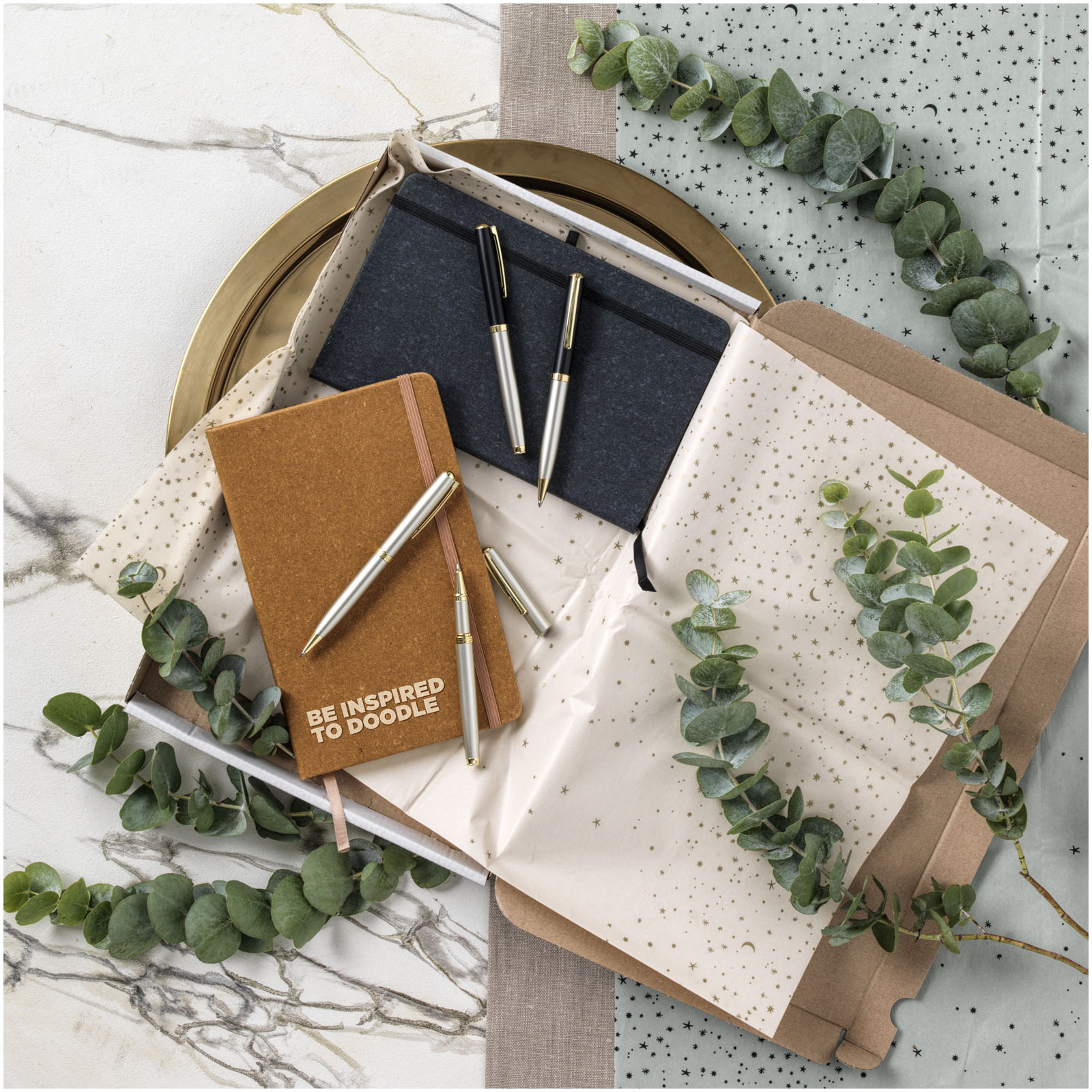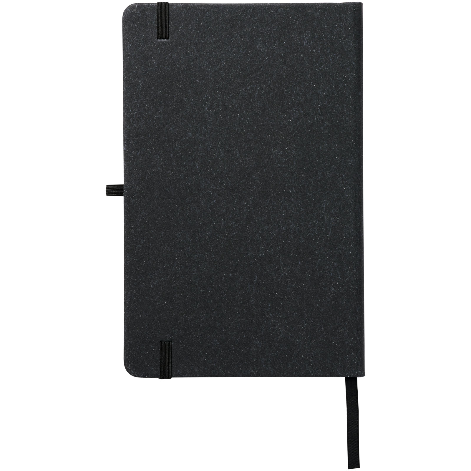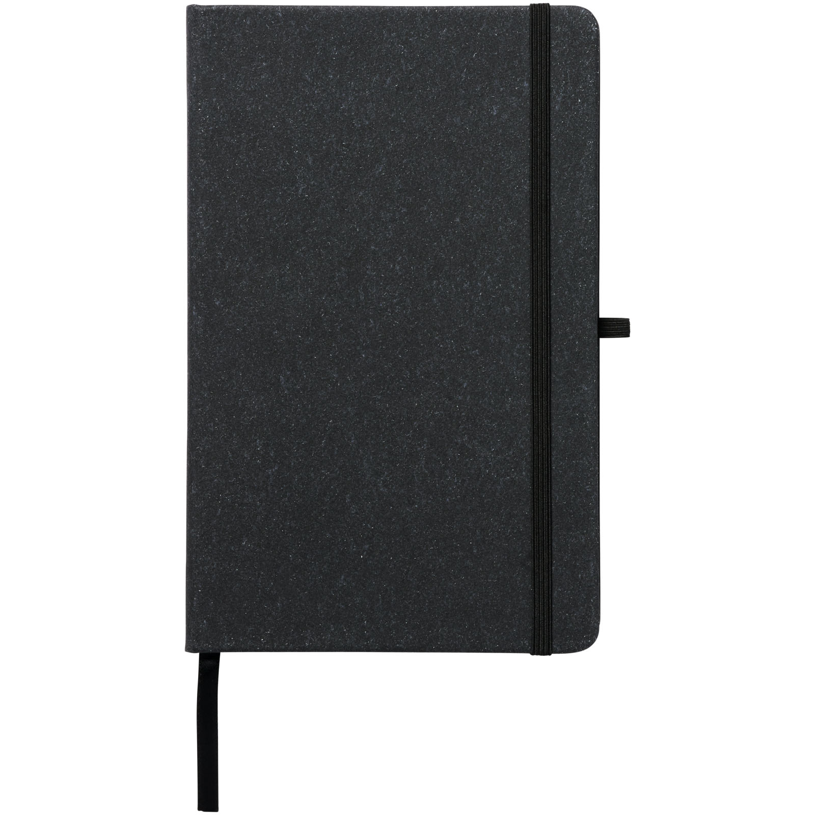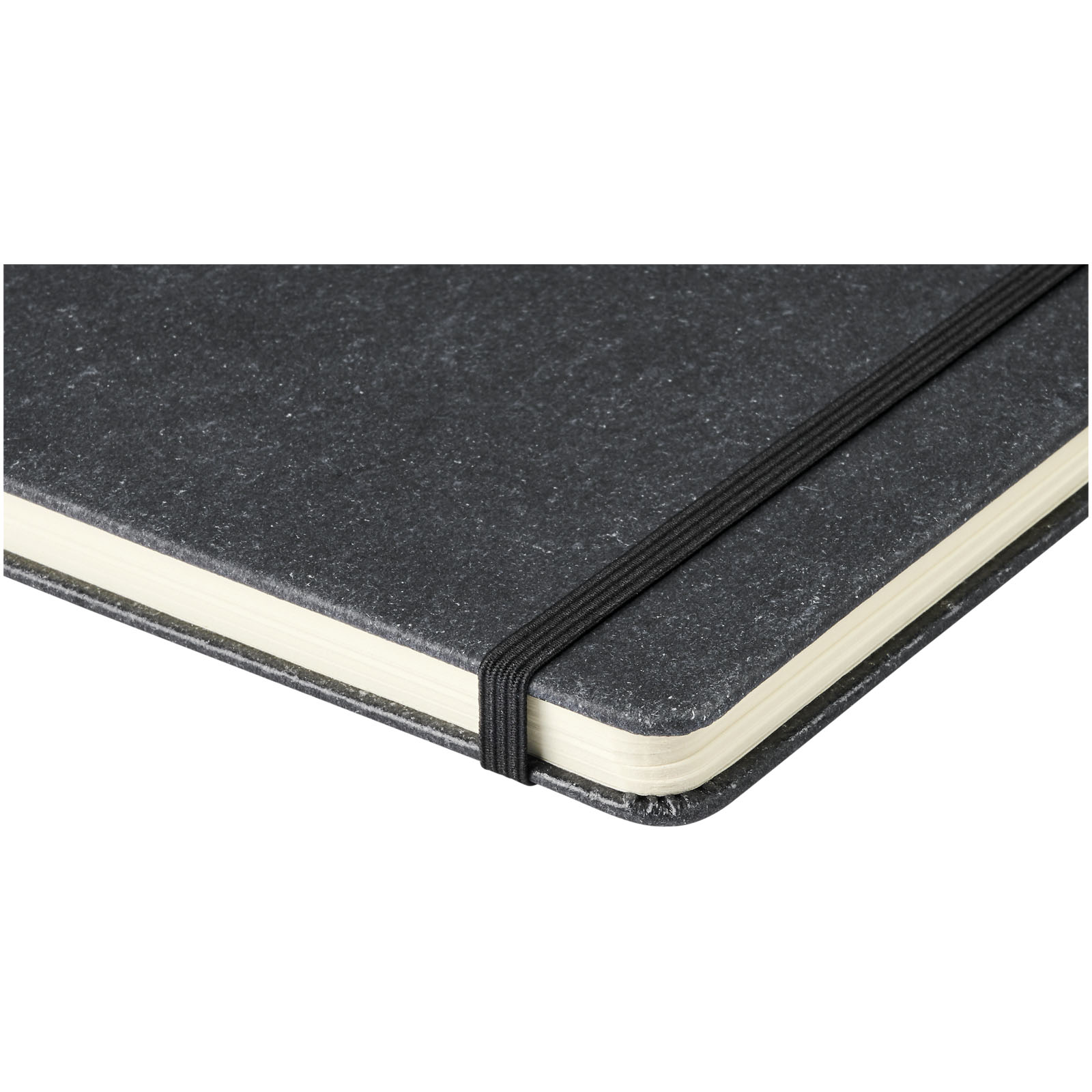Notatnik biurowy w formacie A5 z okładką wykonaną z resztek skóry. Posiada elastyczną taśmę, pętlę na długopis, zakładkę tasiemkową i 80 arkuszy w linie.