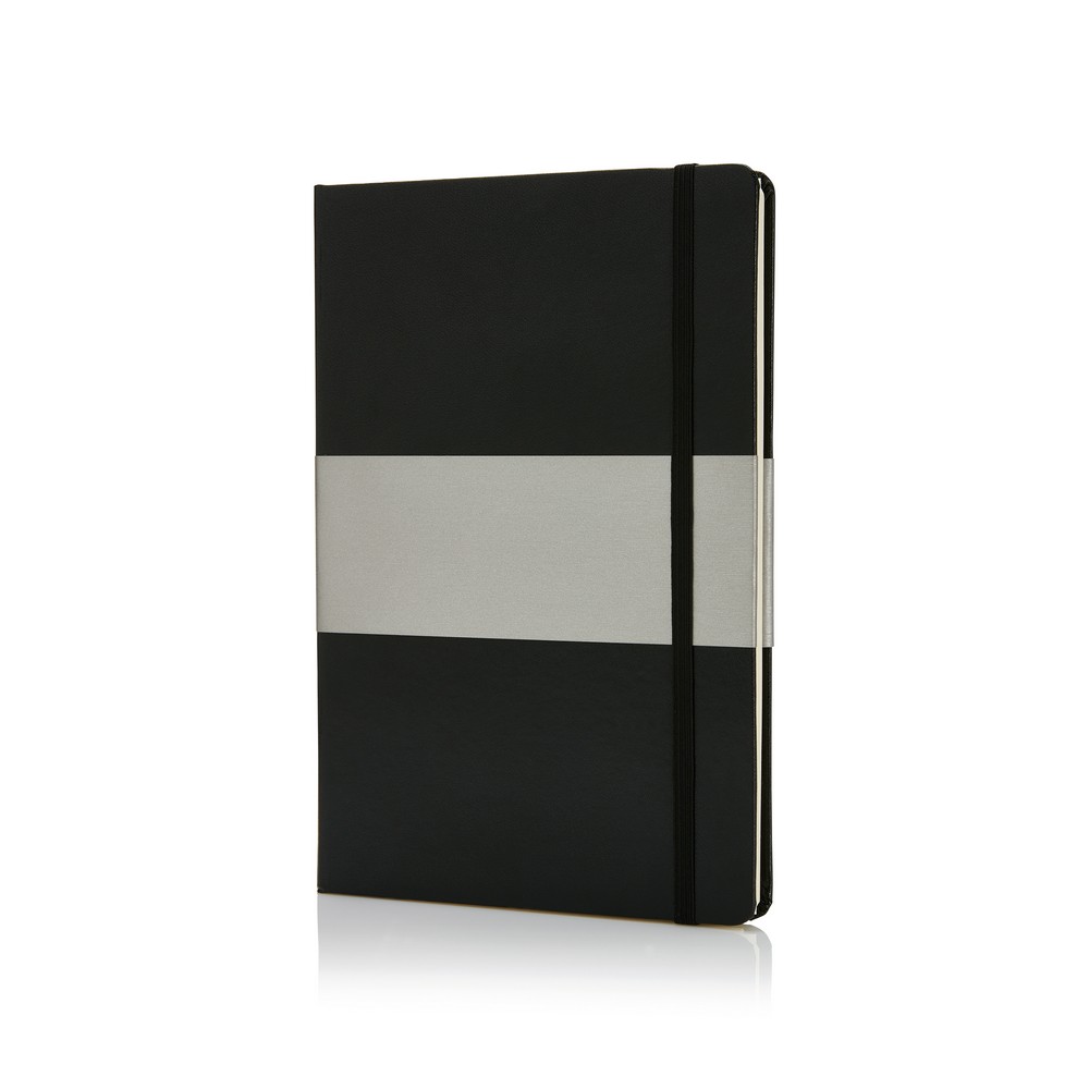 Notatnik A5 (80 kremowych kartek 80 g/m2 w linie), twarda okładka, tasiemka zakładkowa, elastyczna opaska do zamykania, obwoluta, zaokrąglone rogi, ślad węglowy produktu: 0,7 kg CO2