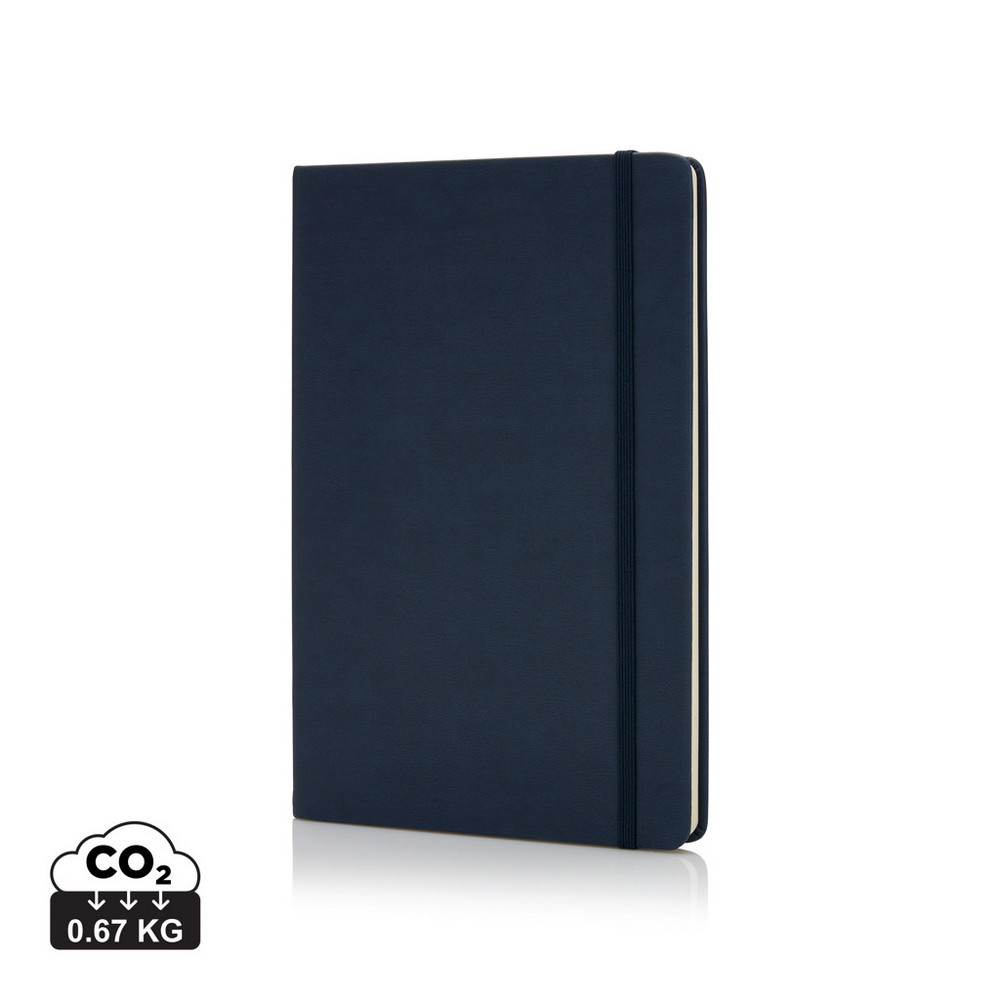 Notatnik A5 (80 kartek 80 g/m2 w linie), twarda okładka z PU doskonale nadaje się do tłoczenia, tasiemka zakładkowa i elastyczna opaska do zamykania, ślad węglowy produktu: 0,67 kg CO2
