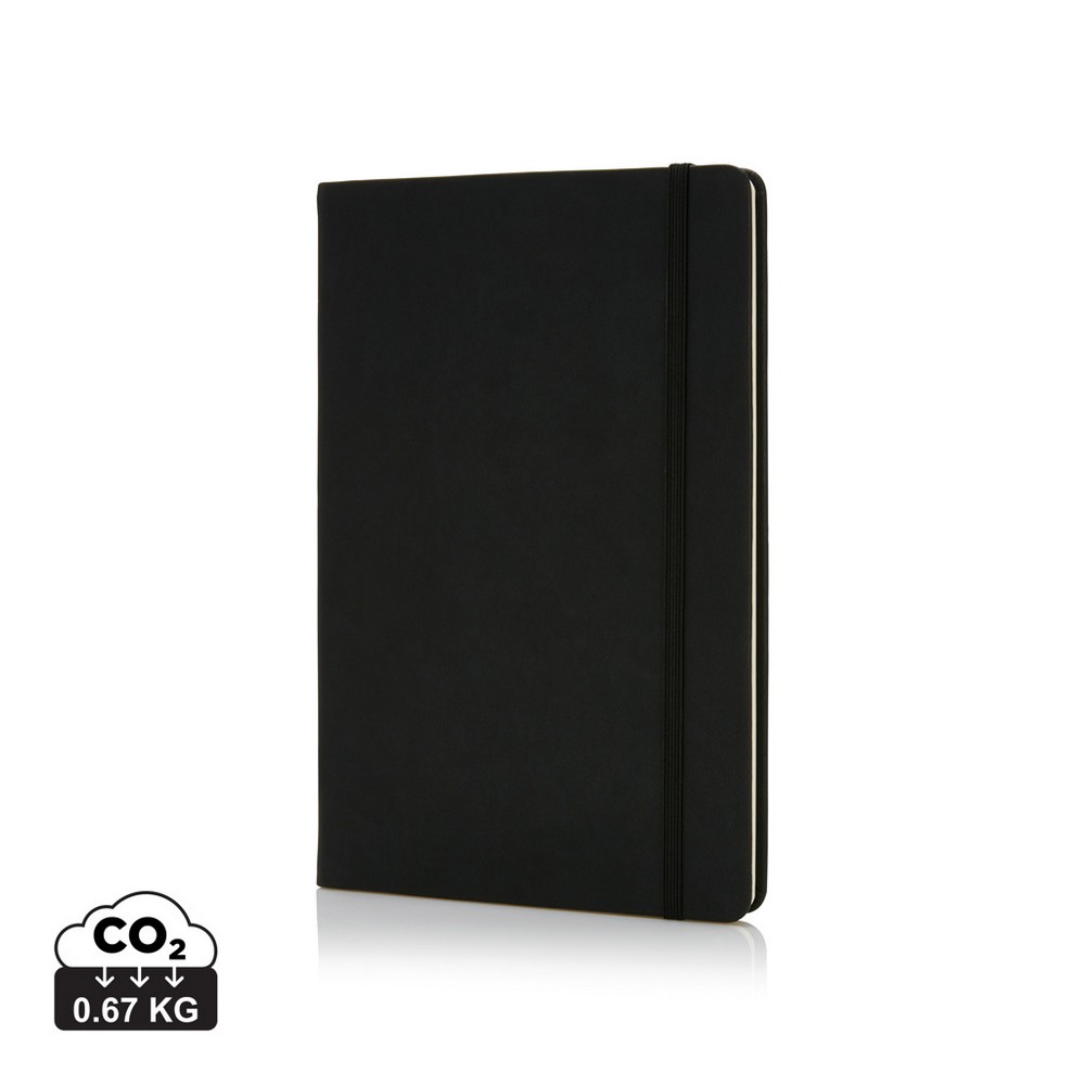 Notatnik A5 (80 kartek 80 g/m2 w linie), twarda okładka z PU doskonale nadaje się do tłoczenia, tasiemka zakładkowa i elastyczna opaska do zamykania, ślad węglowy produktu: 0,67 kg CO2