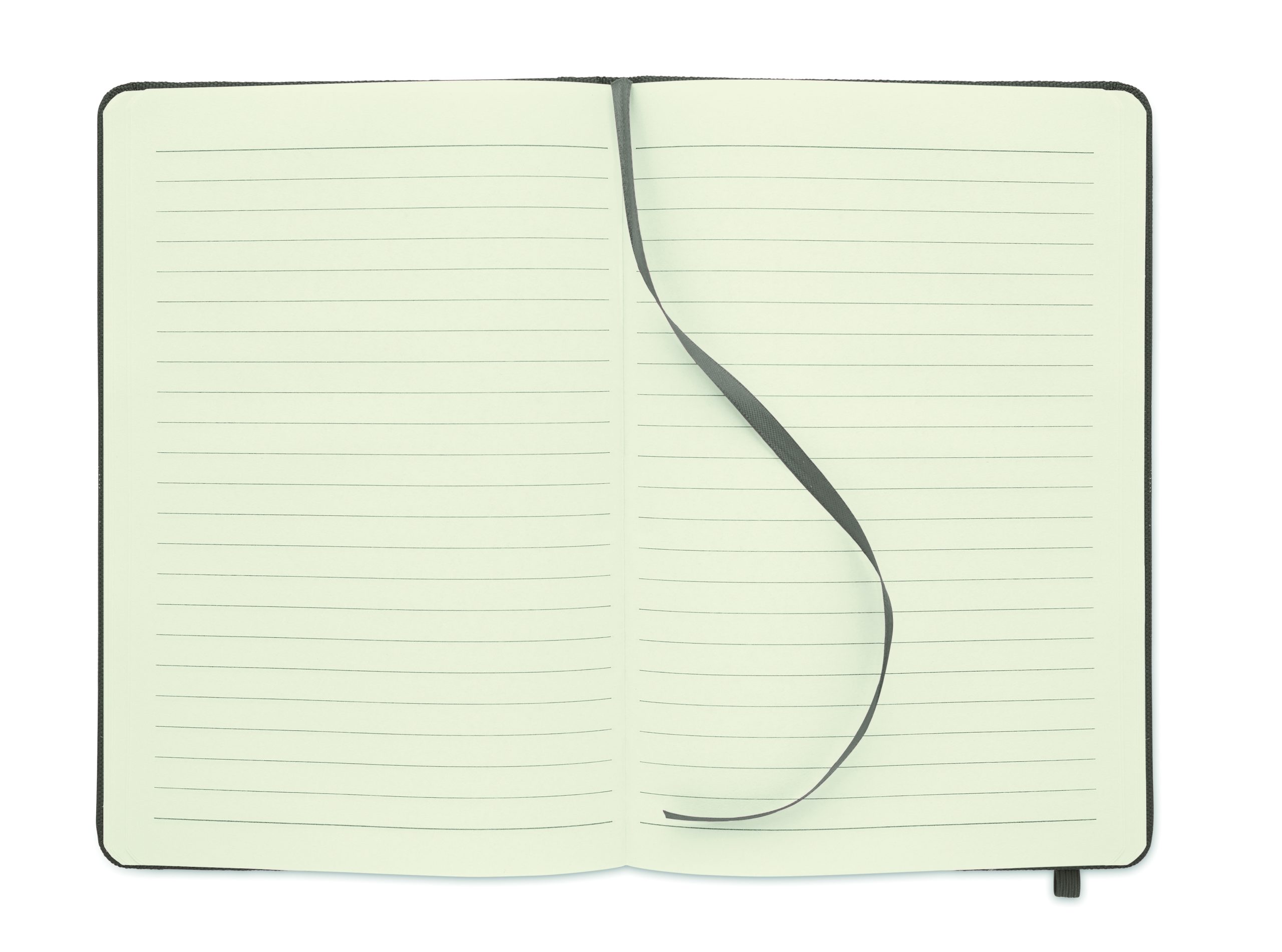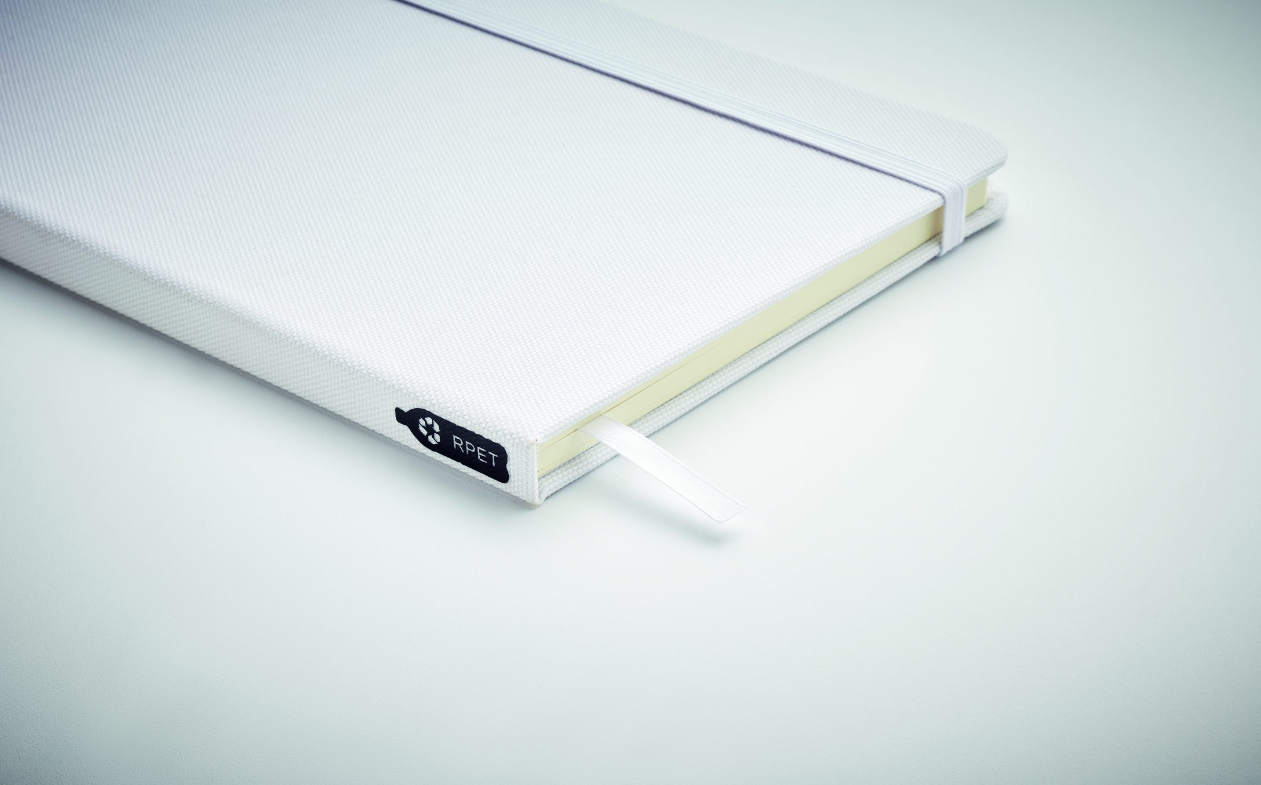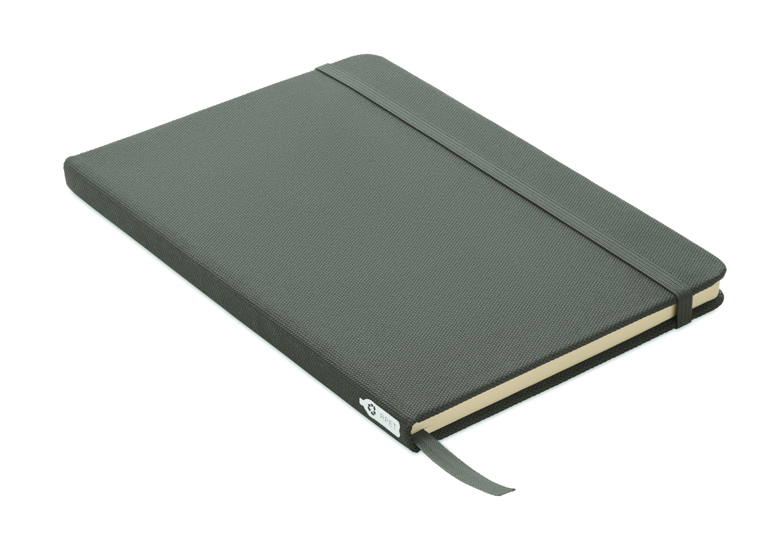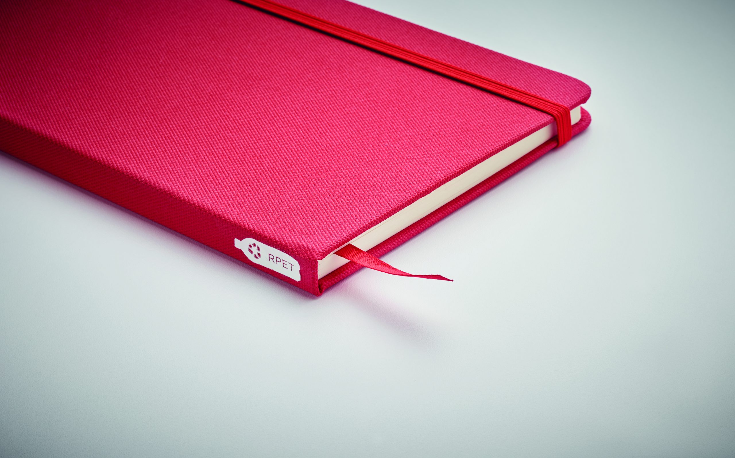 Notatnik A5 z twardą okładką 600D RPET. 160 stron (80 kartek) w linie z papieru ekologicznego. Dopasowany elastyczny pasek zamykający i zakładka z tasiemki. FSC®-certified | FSC MIX CREDIT, P7.1, FSC-C213206