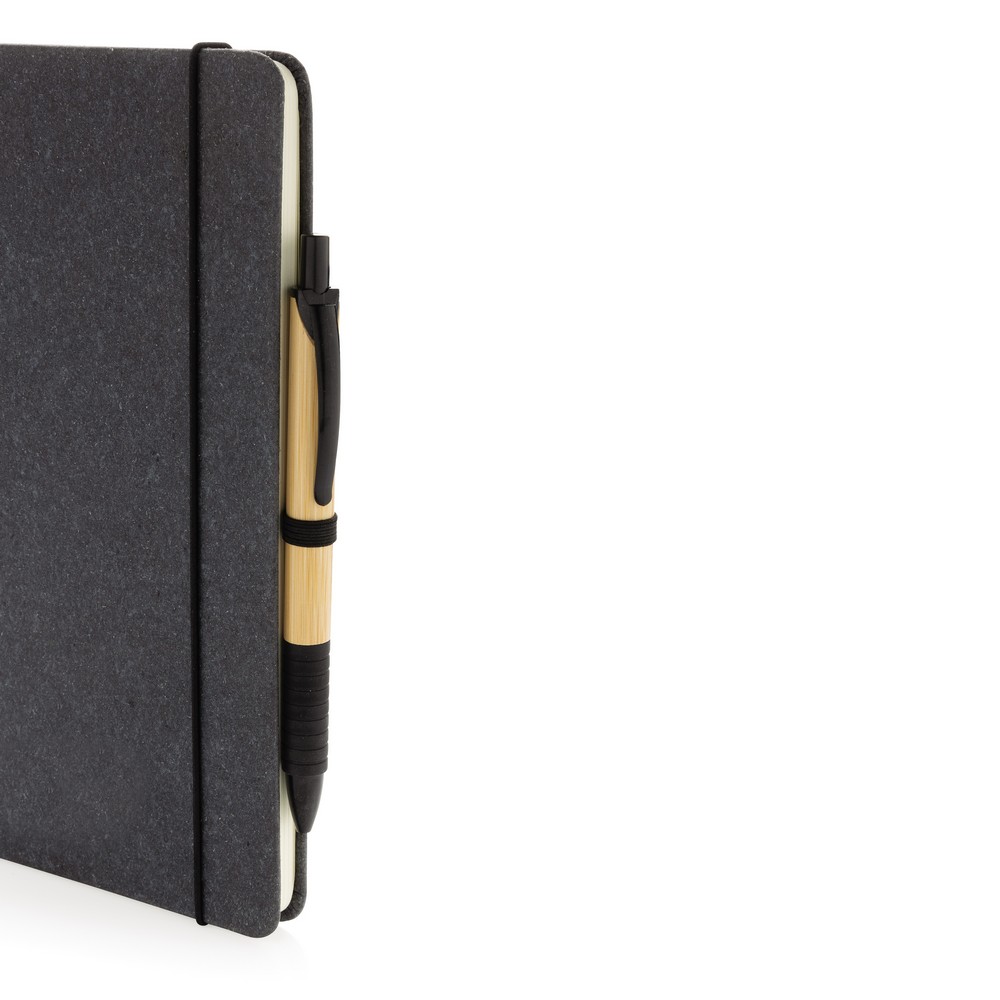 Notatnik A5 (80 białych kartek 70 g/m2 w linie), elastyczna opaska do zamykania, miejsce na przybory do pisania, okładka wykonana ze skóry pochodzącej z recyklingu, ślad węglowy produktu: 0,47 kg CO2