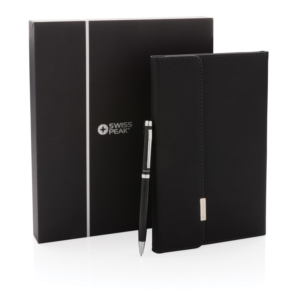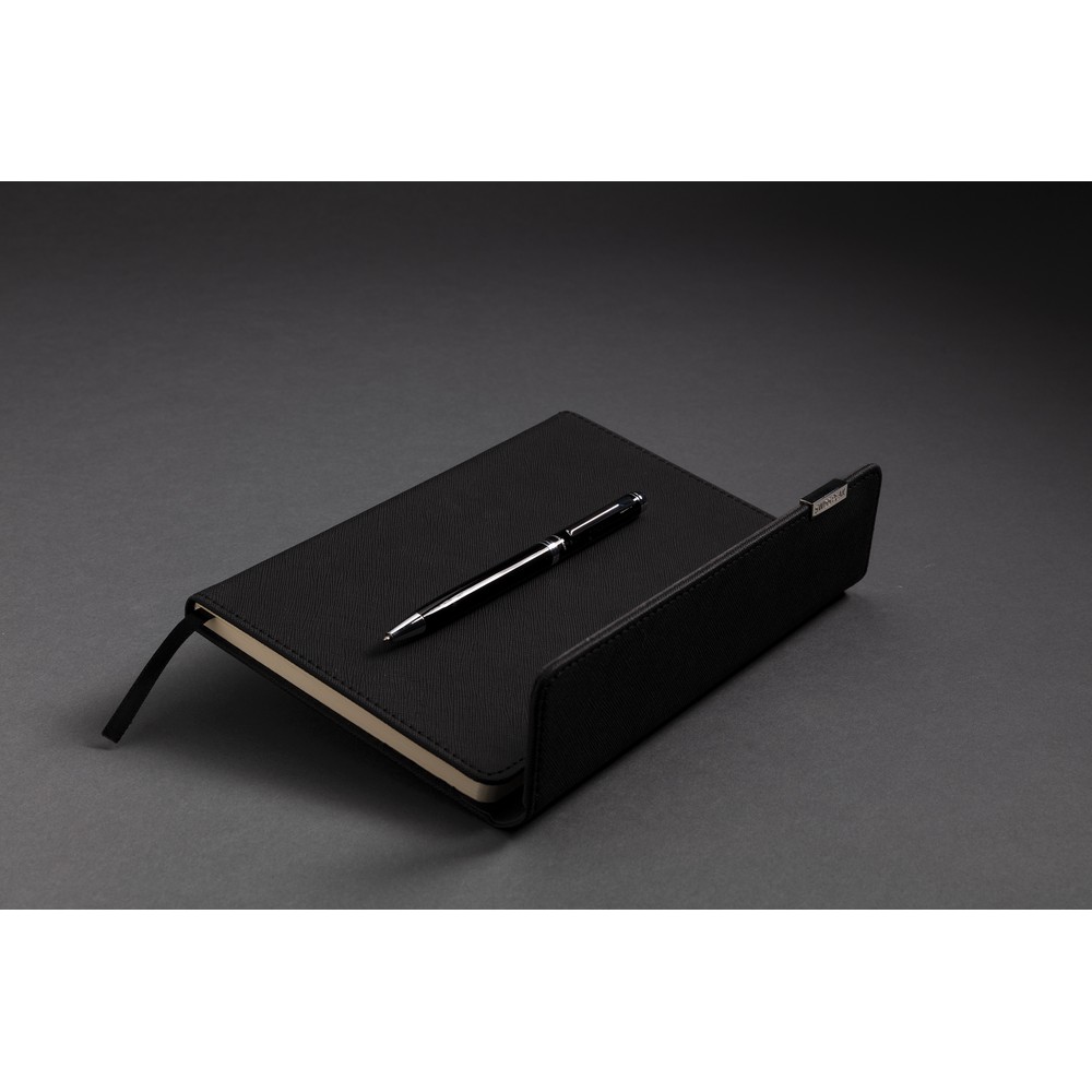 Luksusowy notatnik A5 (80 kremowych kartek 80 g/m2 w linie), okładka wykonana z PU z metalowym logo, długopis z niemieckim wkładem w komplecie, długość pisania ok. 1200 m, w ozdobnym pudełku, ślad węglowy produktu: 1,34 kg CO2