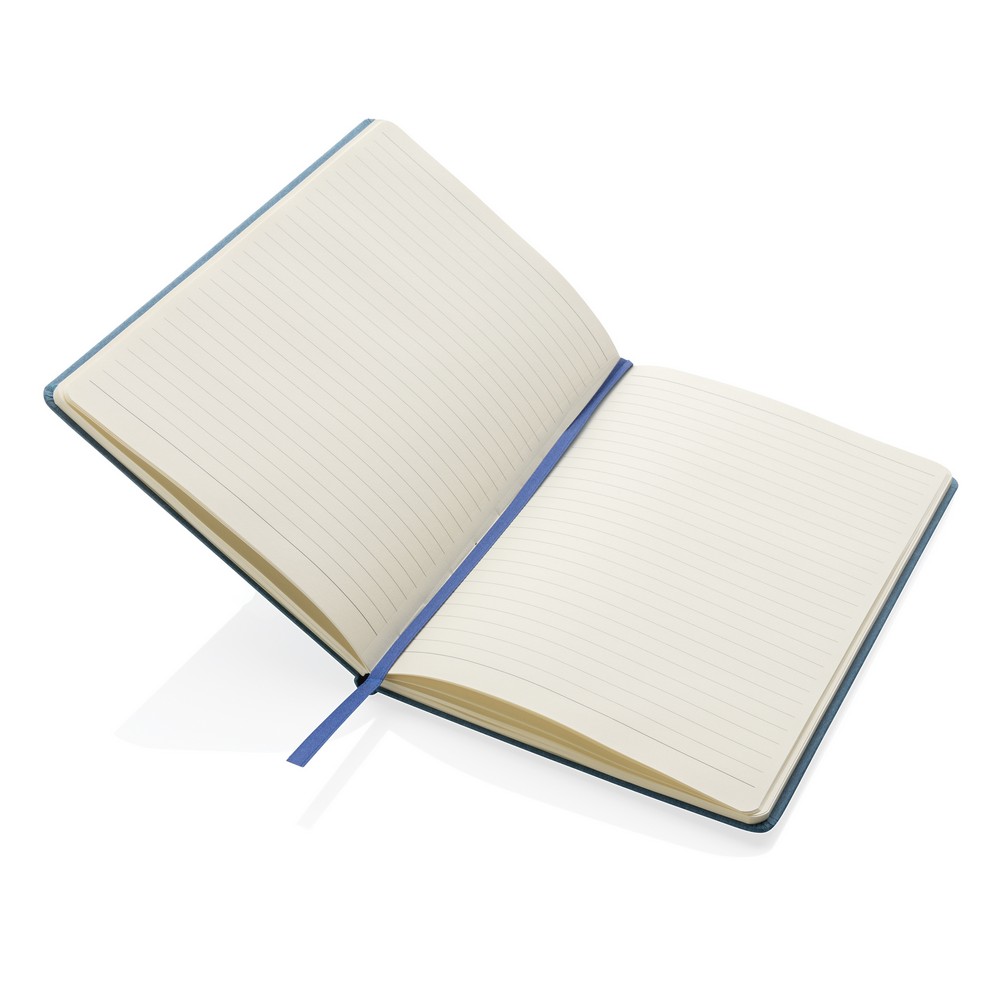 Notatnik A5, (80 kremowych kartek w linie), twarda okładka, okładka oraz strony wewnętrzne posiadają certyfikat FSC® (Forest Stewardship Council), tasiemka zakładkowa, ślad węglowy produktu: 0,52 kg CO2