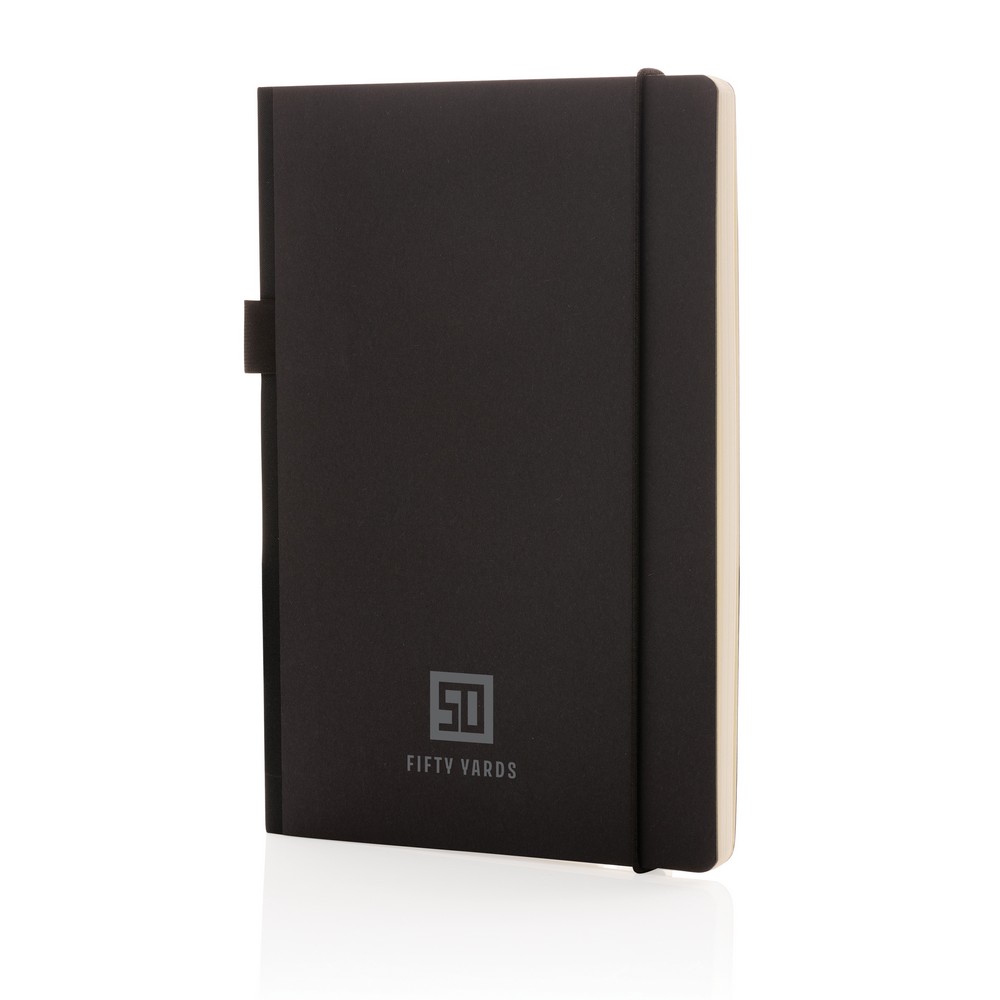 Notatnik A5, (80 kremowych kartek w linie), twarda okładka, okładka oraz strony wewnętrzne posiadają certyfikat FSC® (Forest Stewardship Council), tasiemka zakładkowa, elastyczna pętla na przybory do pisania, z tyłu kieszonka na luźne notatki, ślad węglowy produktu: 0,55 kg CO2