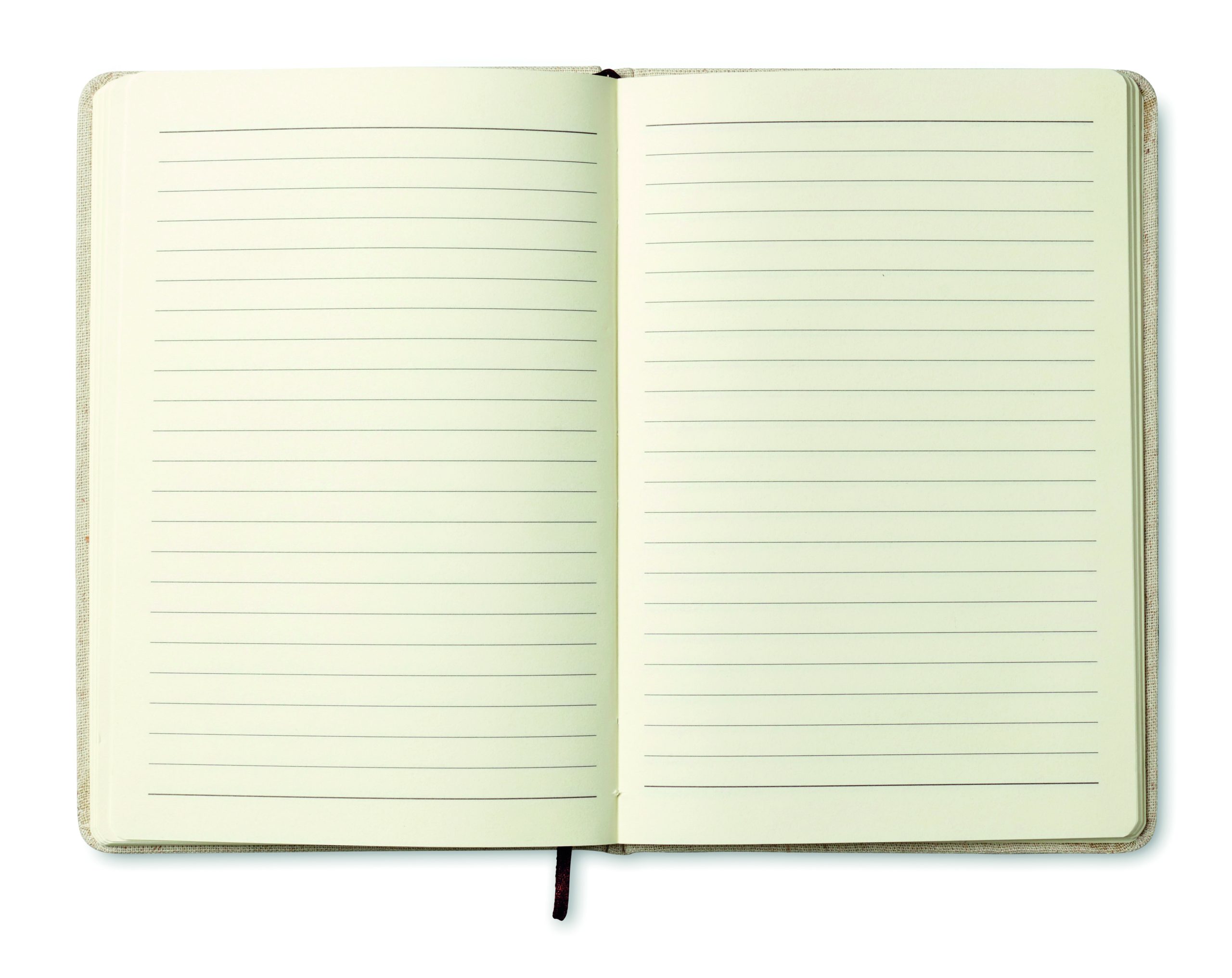 Notatnik A5 z twardą płócienną okładką. Oprawiony. 192 strony w linie z papieru z recyklingu (96 arkuszy). Kontrastowy elastyczny pasek i wstążka do oznaczania stron.