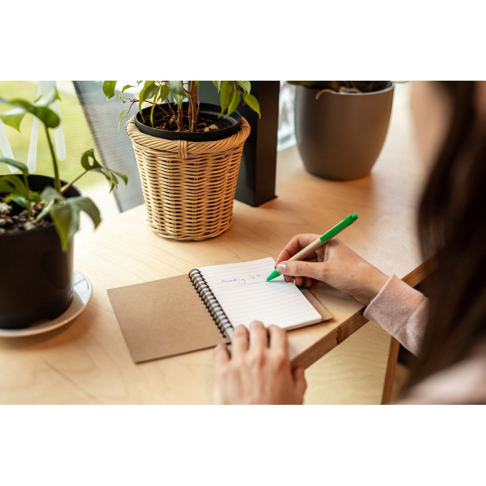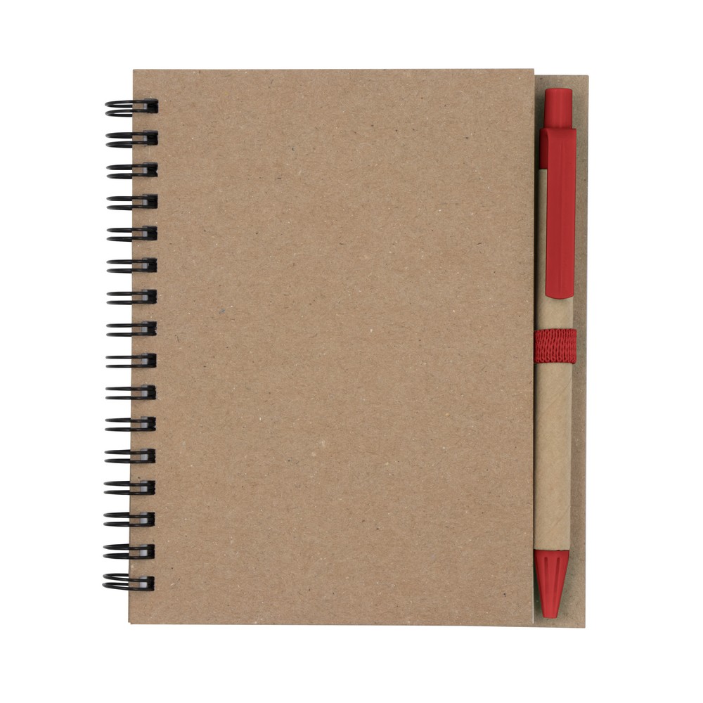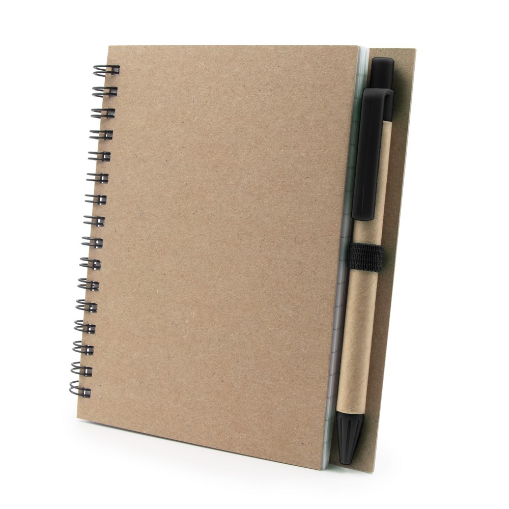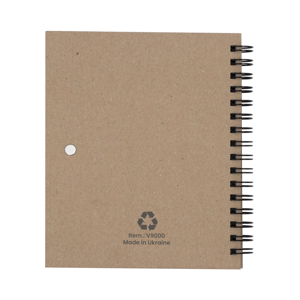 Notatnik A6 (50 kartek 80 g/m2 w linie), twarda okładka z kartonu z recyklingu, spiralne bindowanie, w komplecie długopis z trzonem z kartonu z recyklingu i kolorowymi elementami (wyprodukowany w Ukrainie / made in Ukraine)