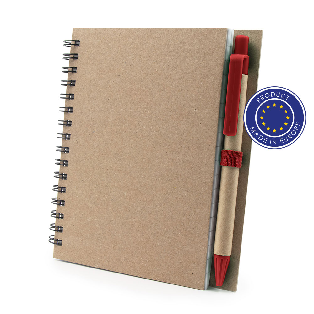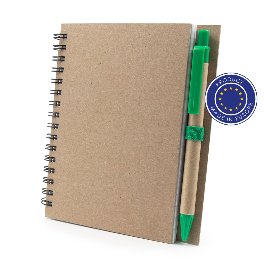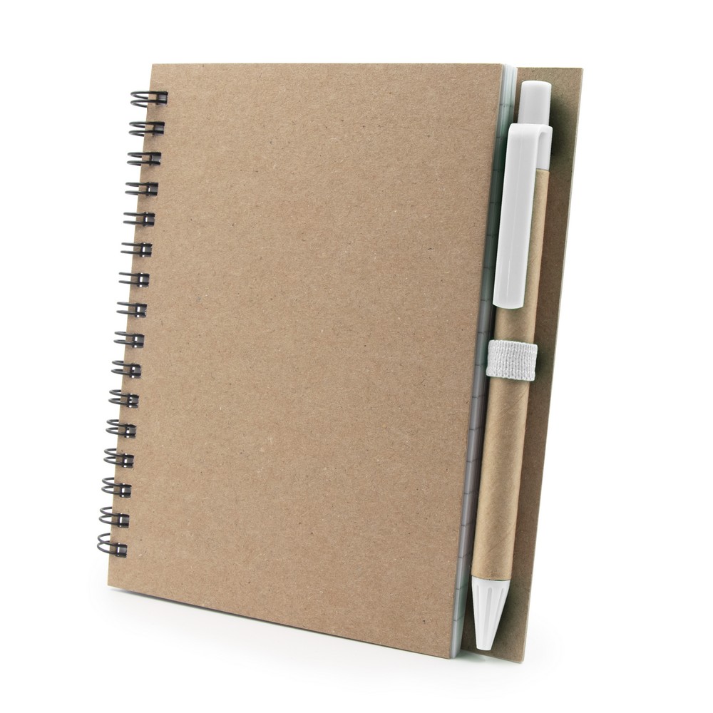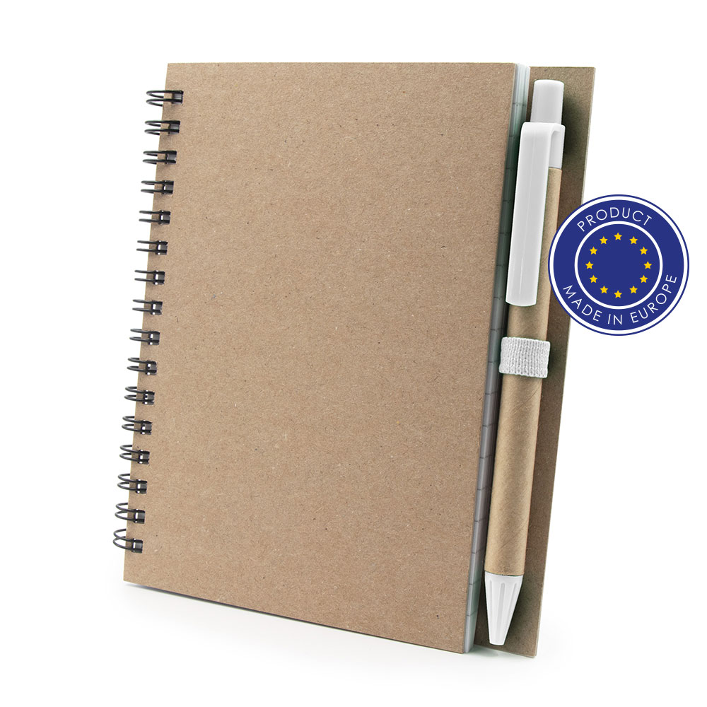Notatnik A6 (50 kartek 80 g/m2 w linie), twarda okładka z kartonu z recyklingu, spiralne bindowanie, w komplecie długopis z trzonem z kartonu z recyklingu i kolorowymi elementami (wyprodukowany w Ukrainie / made in Ukraine)