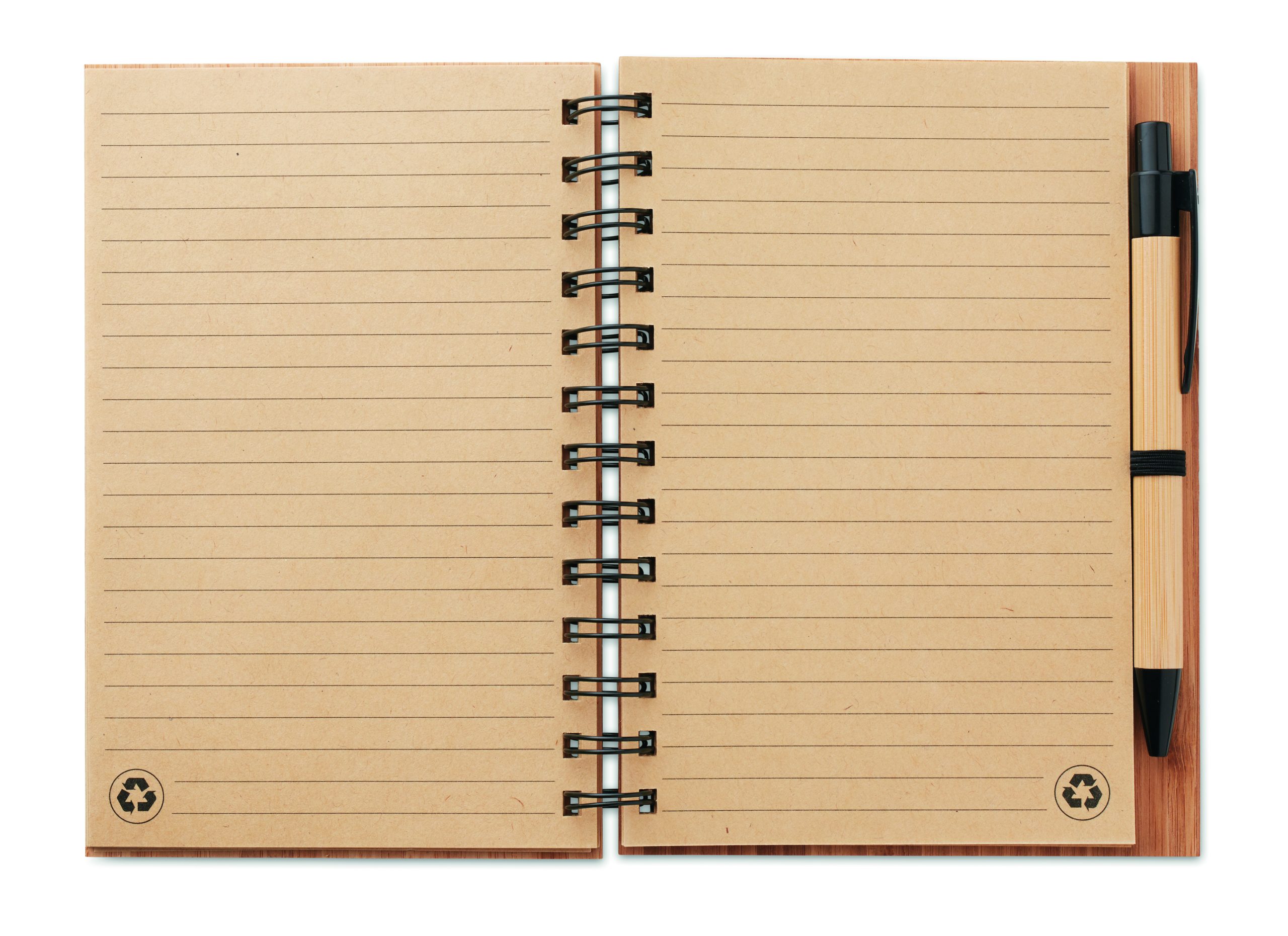 Notes w okładce bambusowej z dopasowanym długopisem. Podwójna spirala. 140 stron (70 kartek) czystego papieru z recyklingu. Dopasowany długopis z bambusowym korpusem i elementami z tworzywa ABS. Elastyczny uchwyt na długopis. Bambus jest produktem naturalnym, dlatego mogą wystąpić nieznaczne różnice w kolorze, wzorze i rozmiarze. FSC®-certified | FSC 100%, N5.7, FSC-C213206