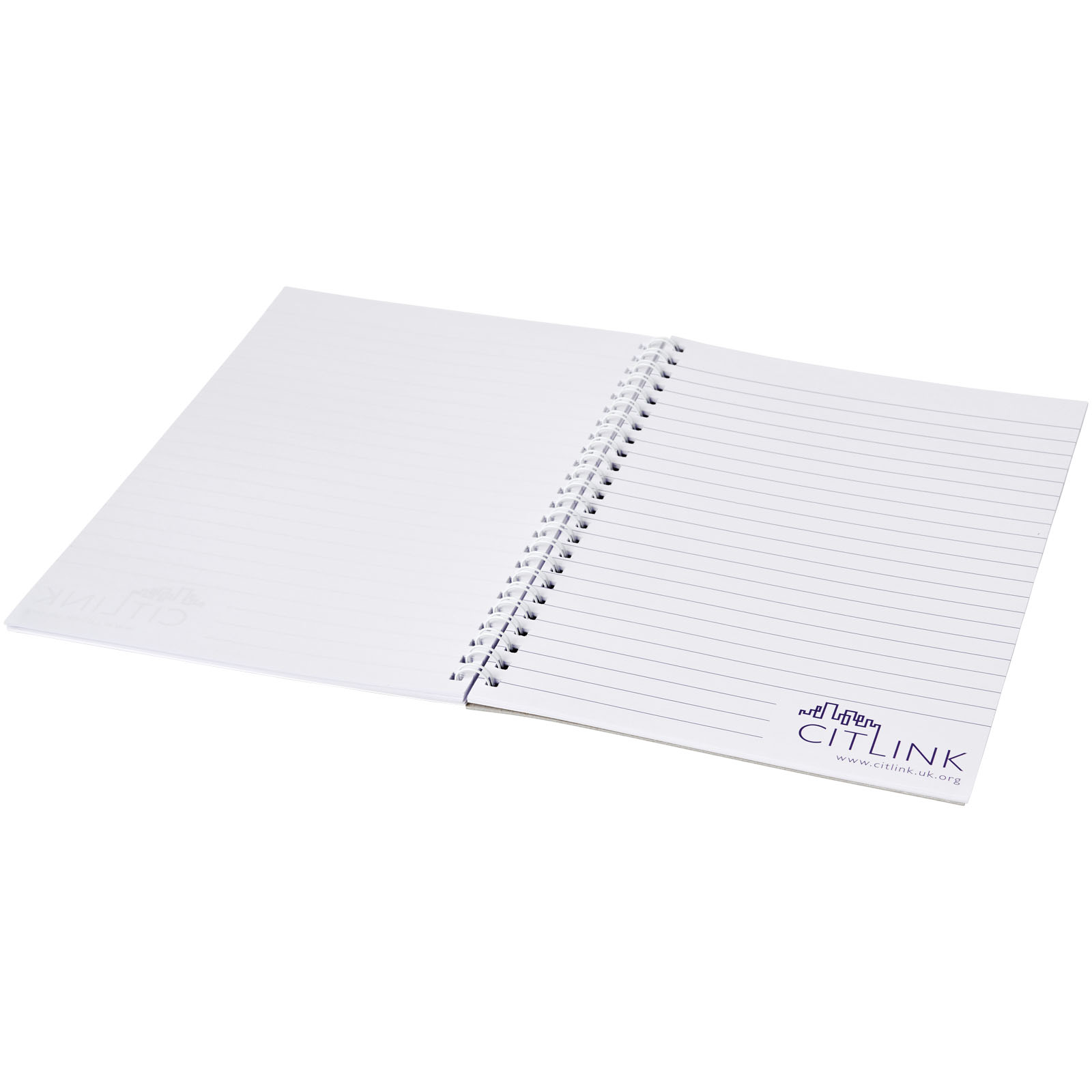 Notes na spirali Desk-Mate® w formacie A4. Notatnik zawiera białą lub czarną przedziałkę. Dostępny w różnych rozmiarach. Obity w lakierowaną, twardą okładkę (250g/m2) z czystymi kartkami (80g/m2). Standardowo 50 kartek, dostępny również w wersji 80 kartek. Możliwość zdobienia okładki i każdego arkusza.