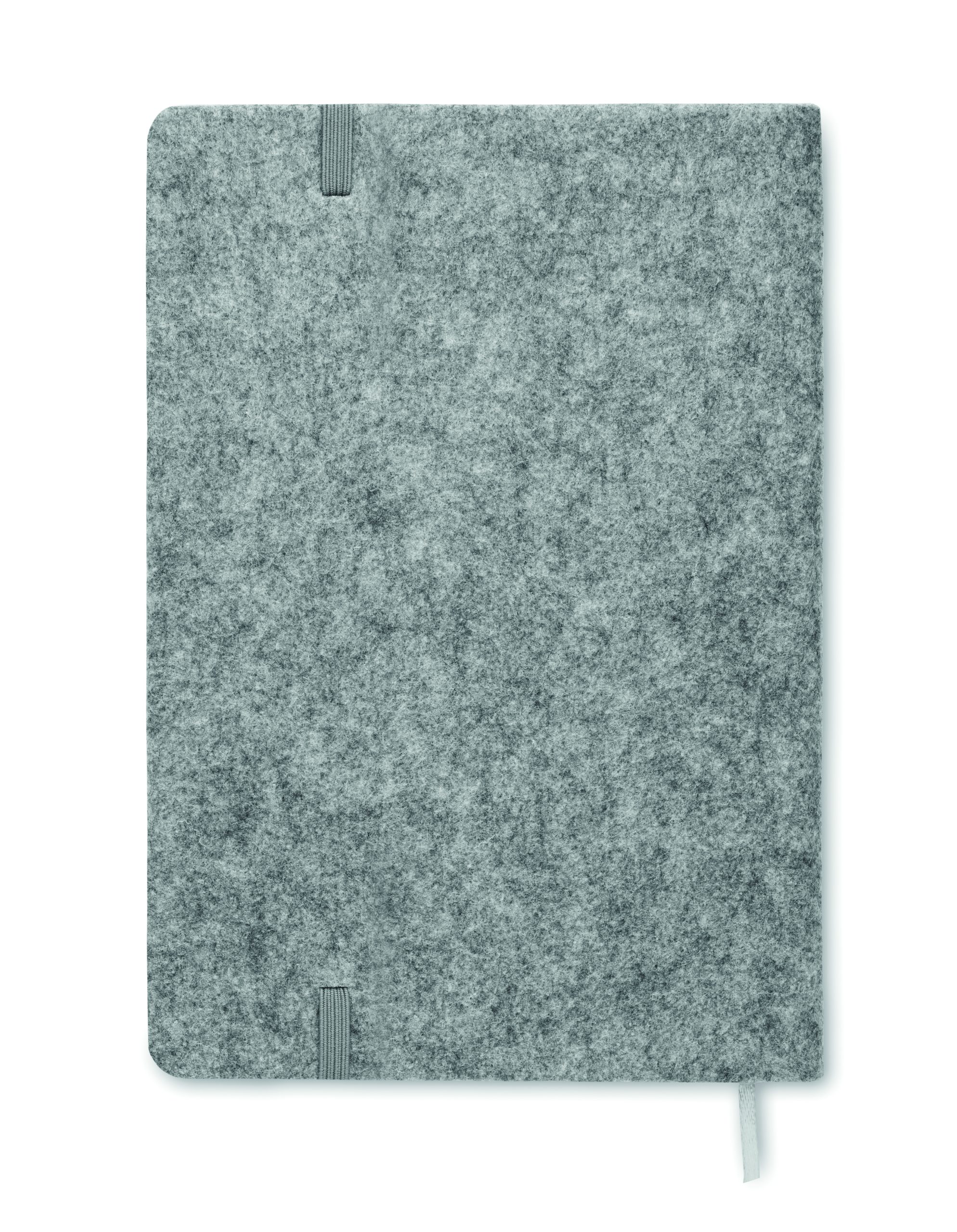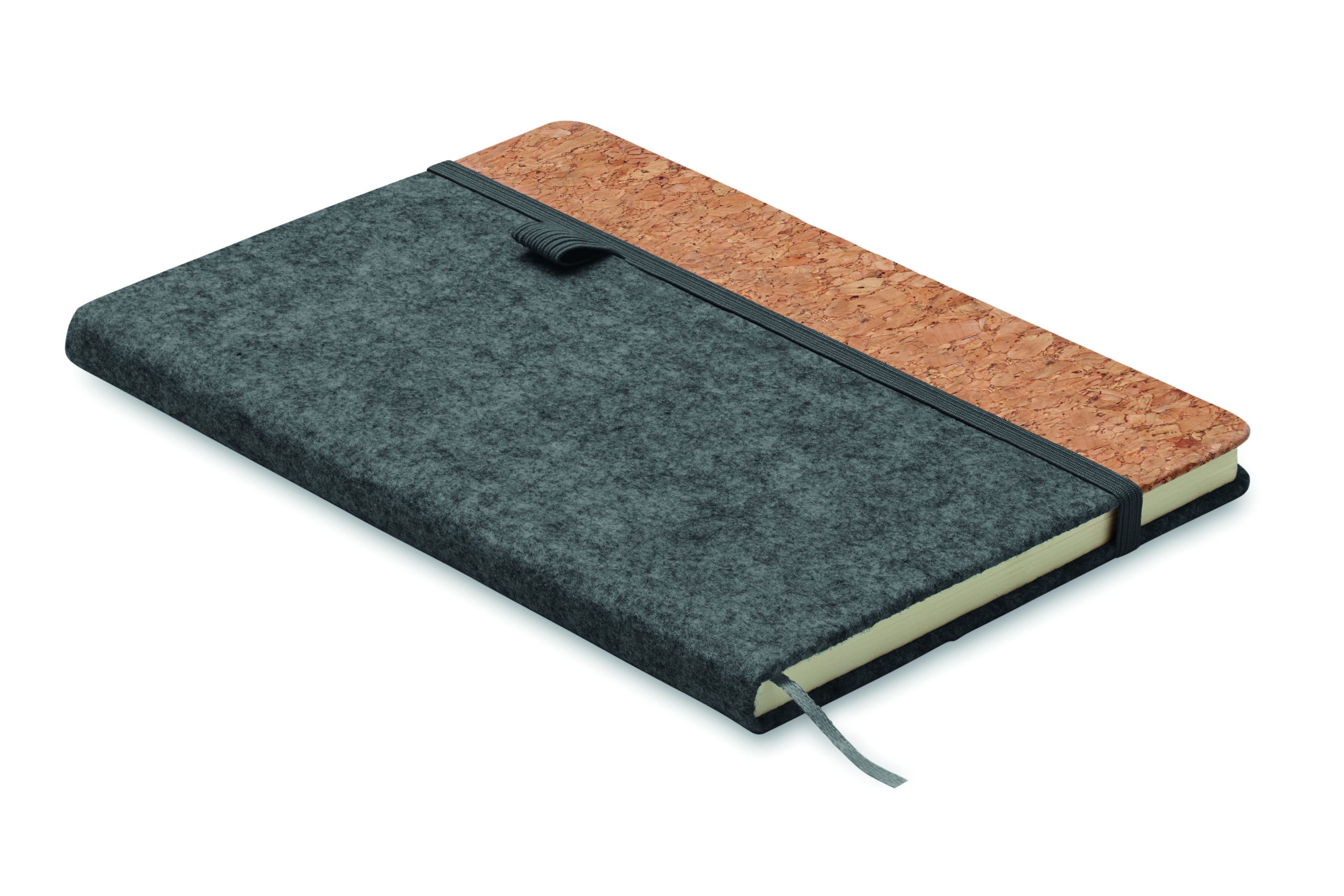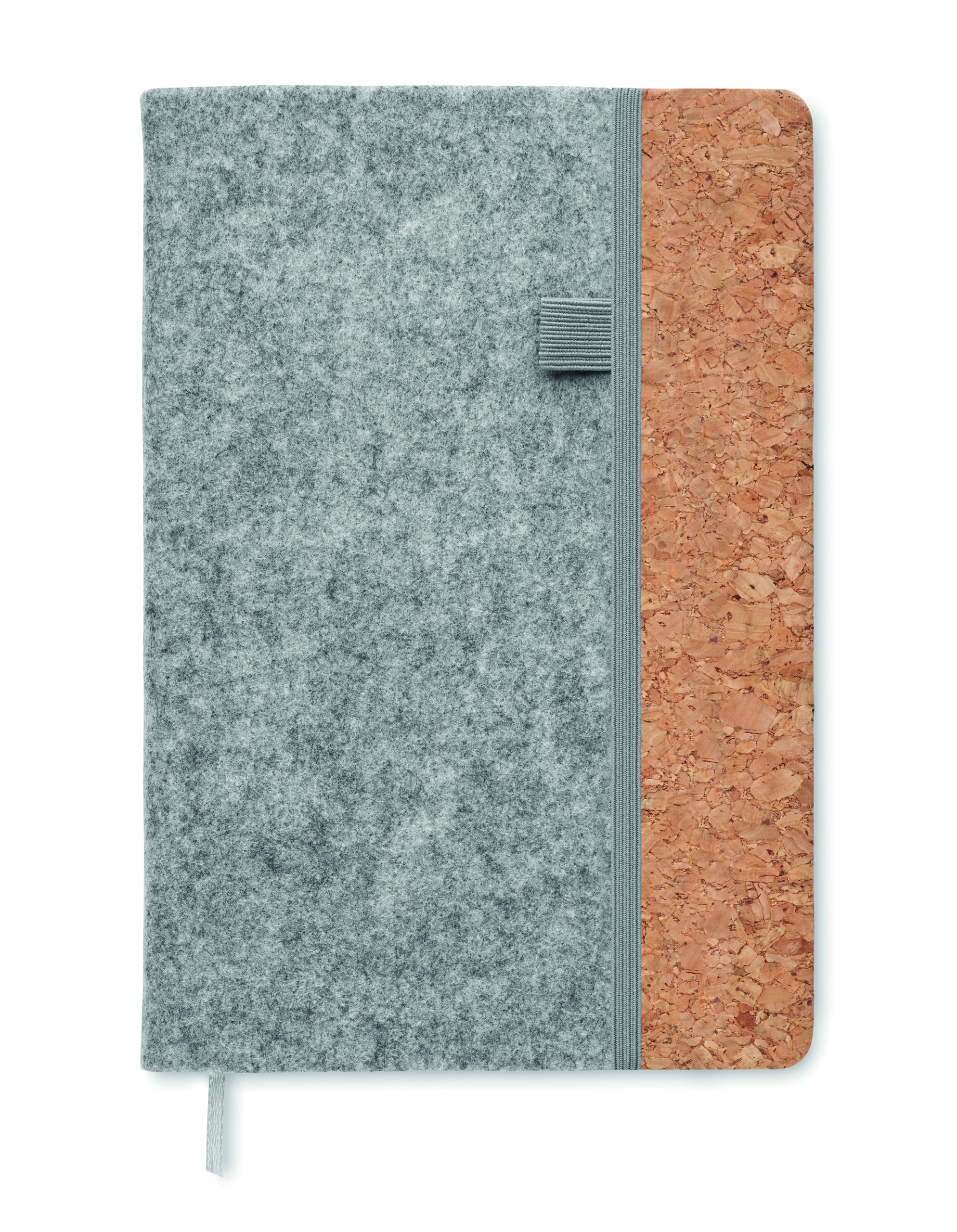 Notatnik A5 z okładką z filcu RPET i z korkiem. 160 stron w linie z papieru z recyklingu (80 arkuszy). Elastyczna pętelka na długopis z przodu, gumka zamykająca i wstążka do oznaczania stron. FSC MIX 100% | P7.1 | FSC-C213206