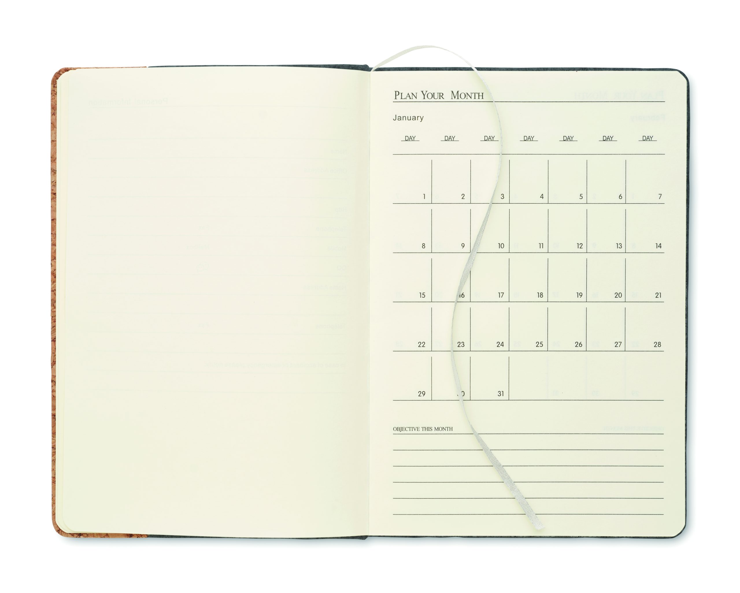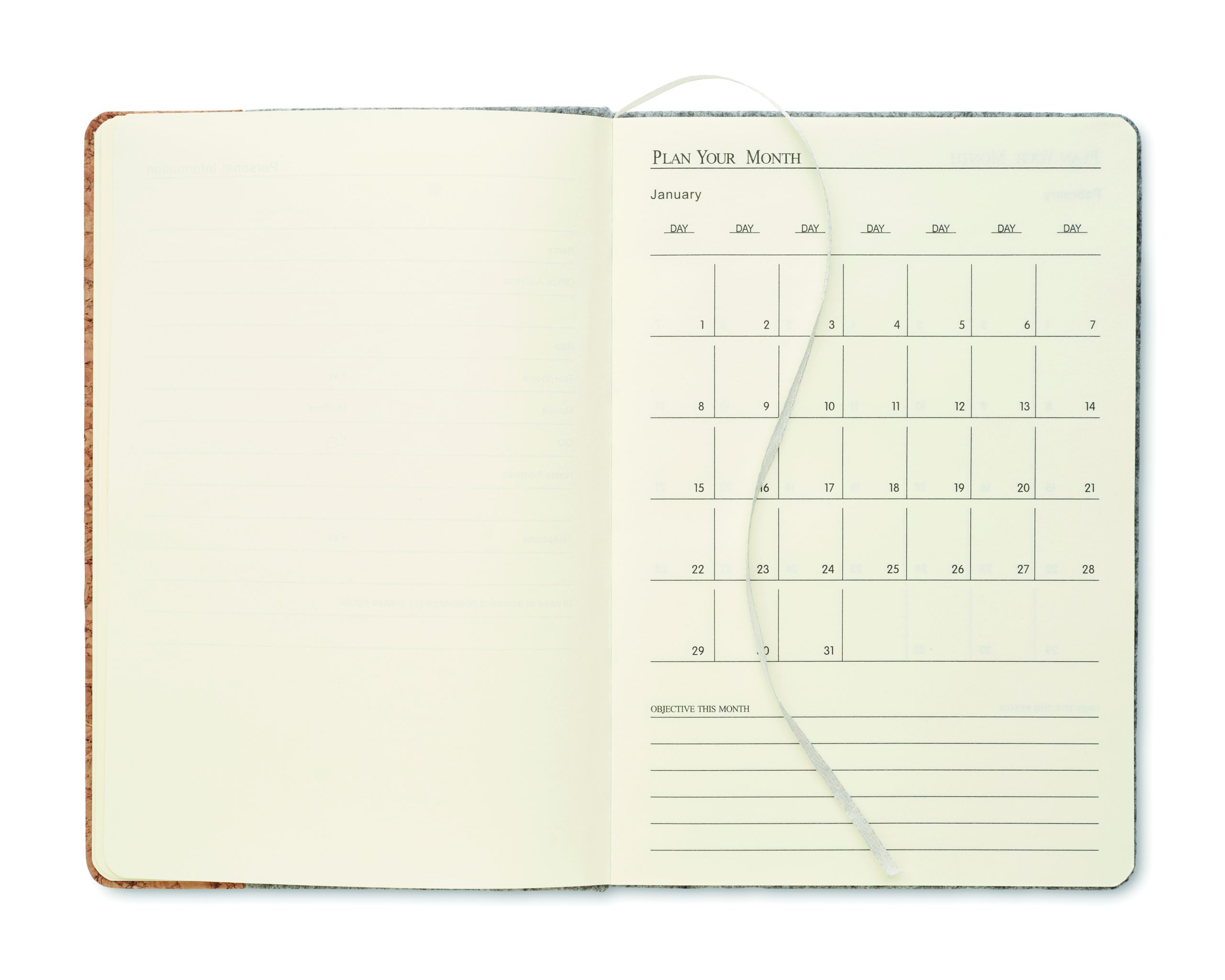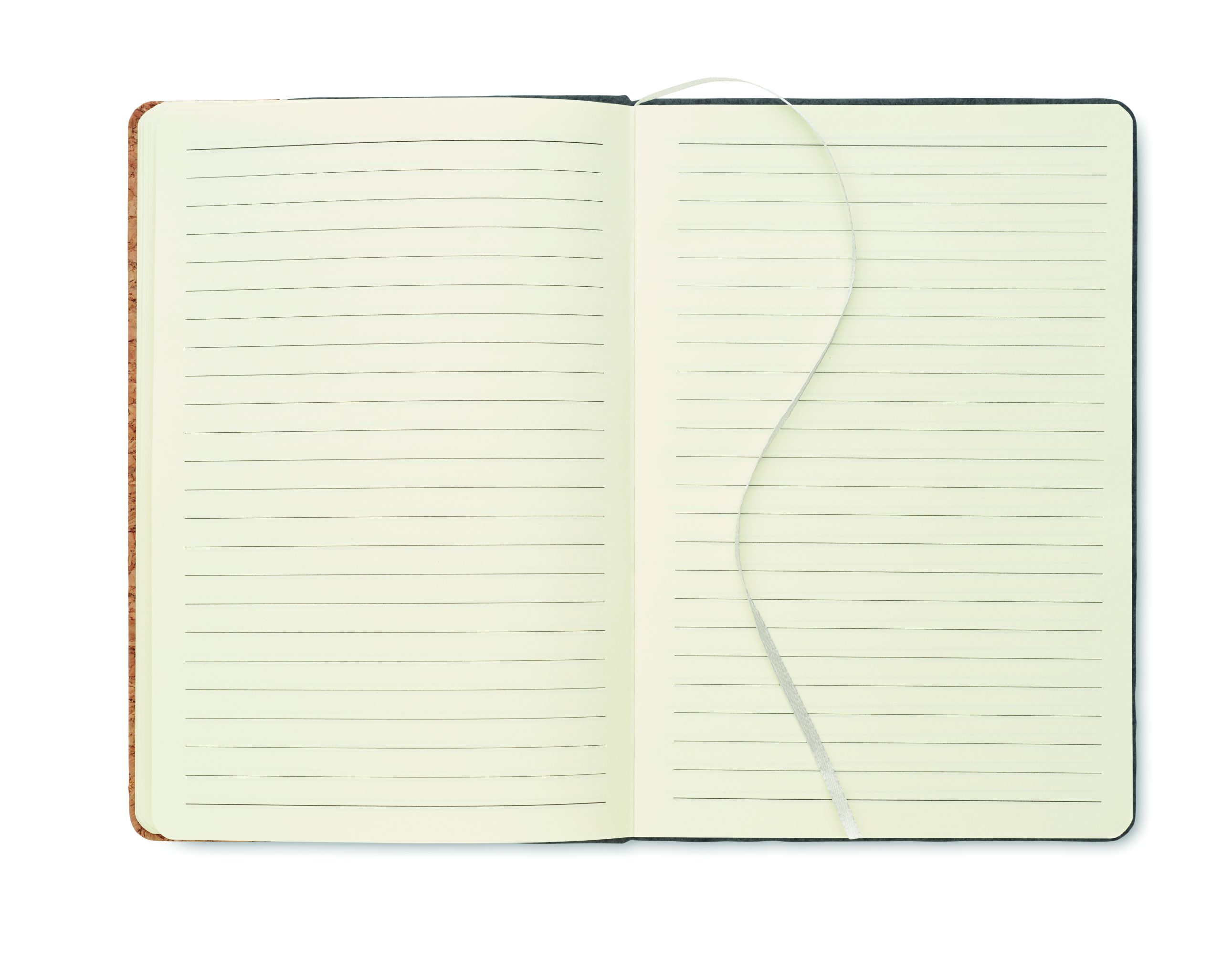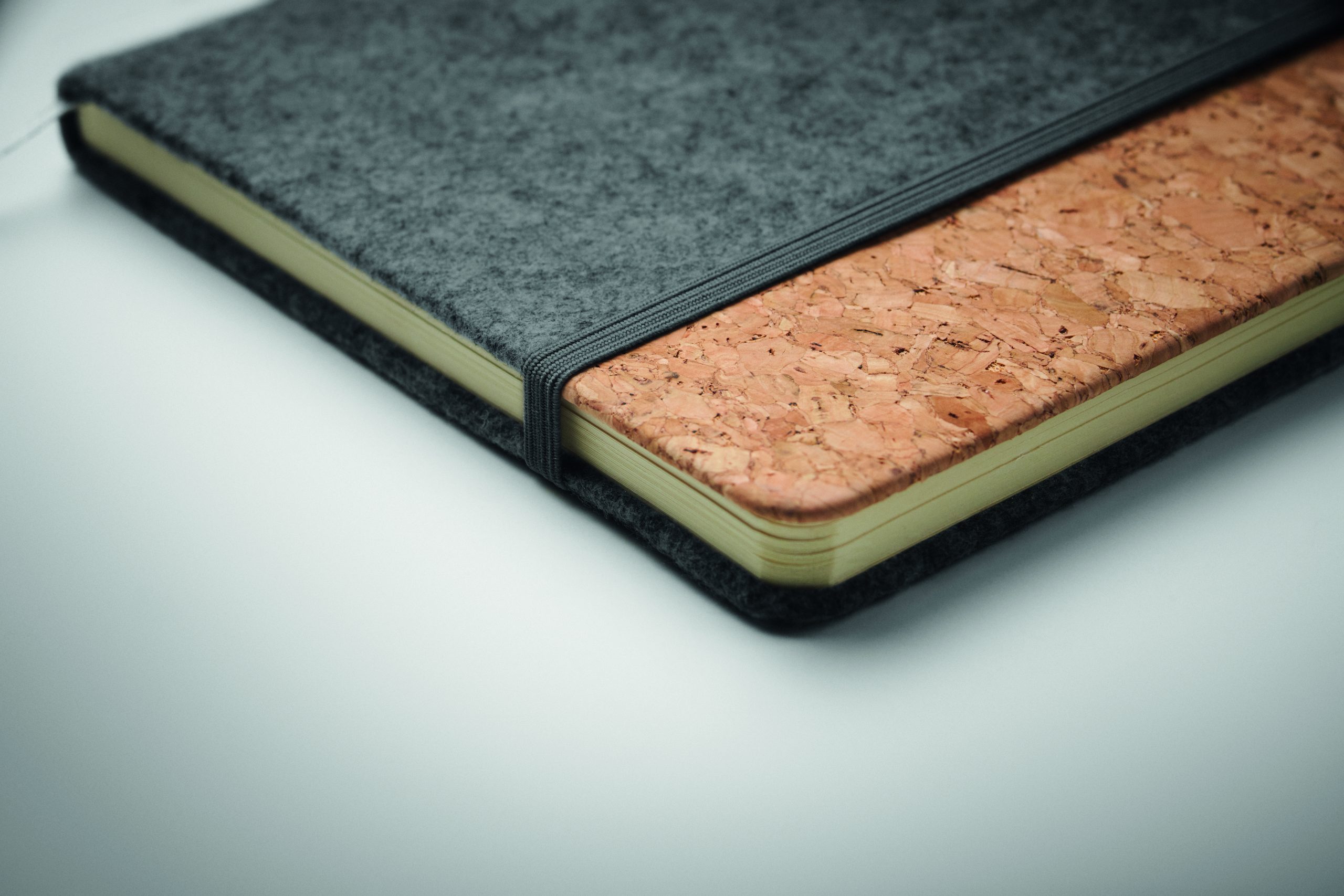 Notatnik A5 z okładką z filcu RPET i z korkiem. 160 stron w linie z papieru z recyklingu (80 arkuszy). Elastyczna pętelka na długopis z przodu, gumka zamykająca i wstążka do oznaczania stron. FSC MIX 100% | P7.1 | FSC-C213206
