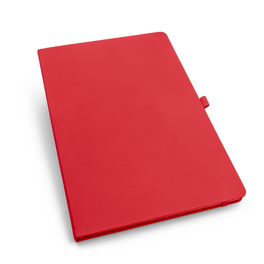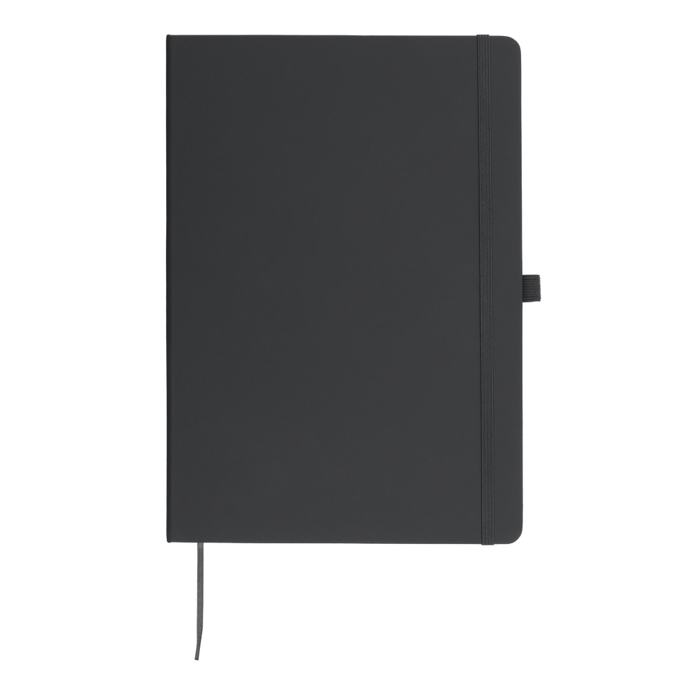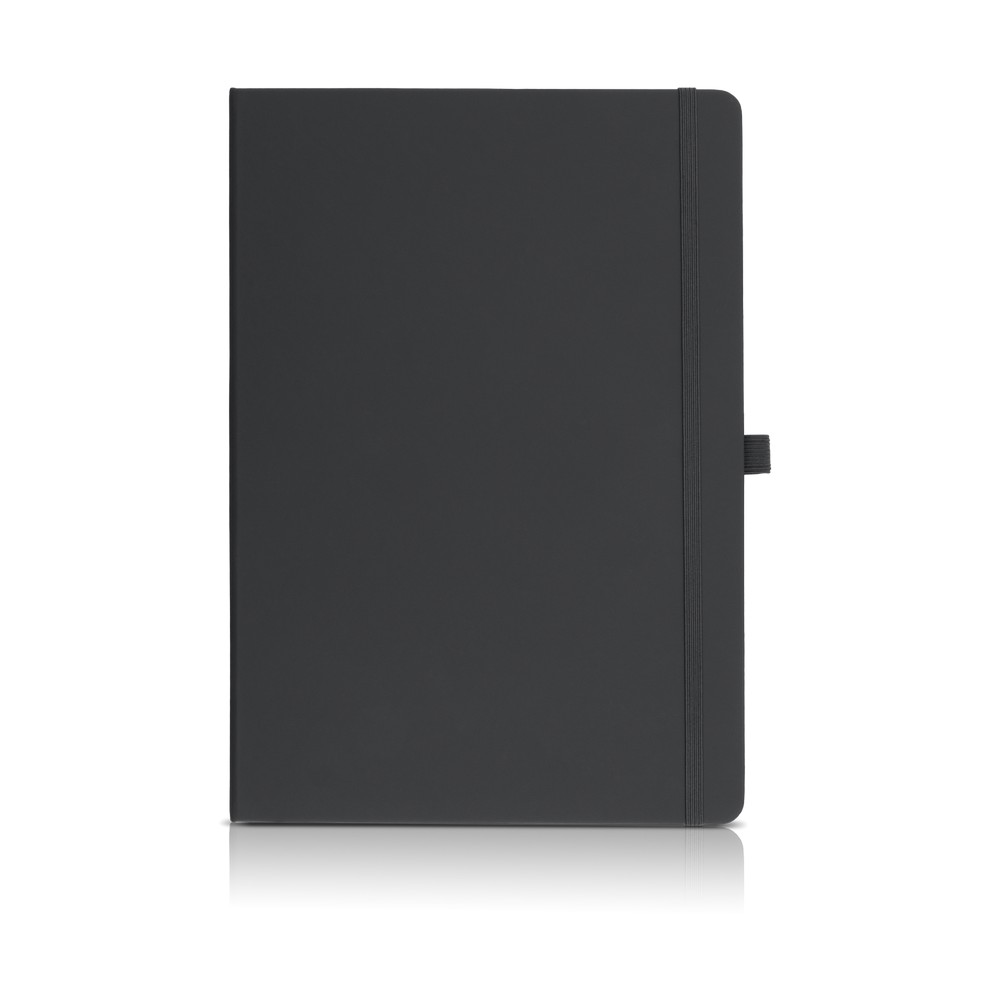Notatnik w formacie ok. A4, posiada 96 kartek w linie (70 gsm), tasiemka zakładkowa umożliwia wygodne zaznaczanie ostatniej strony lub ważniejszych notatek, dodatkowy gumowy uchwyt na długopis, twarda okładka wykonana z PU
