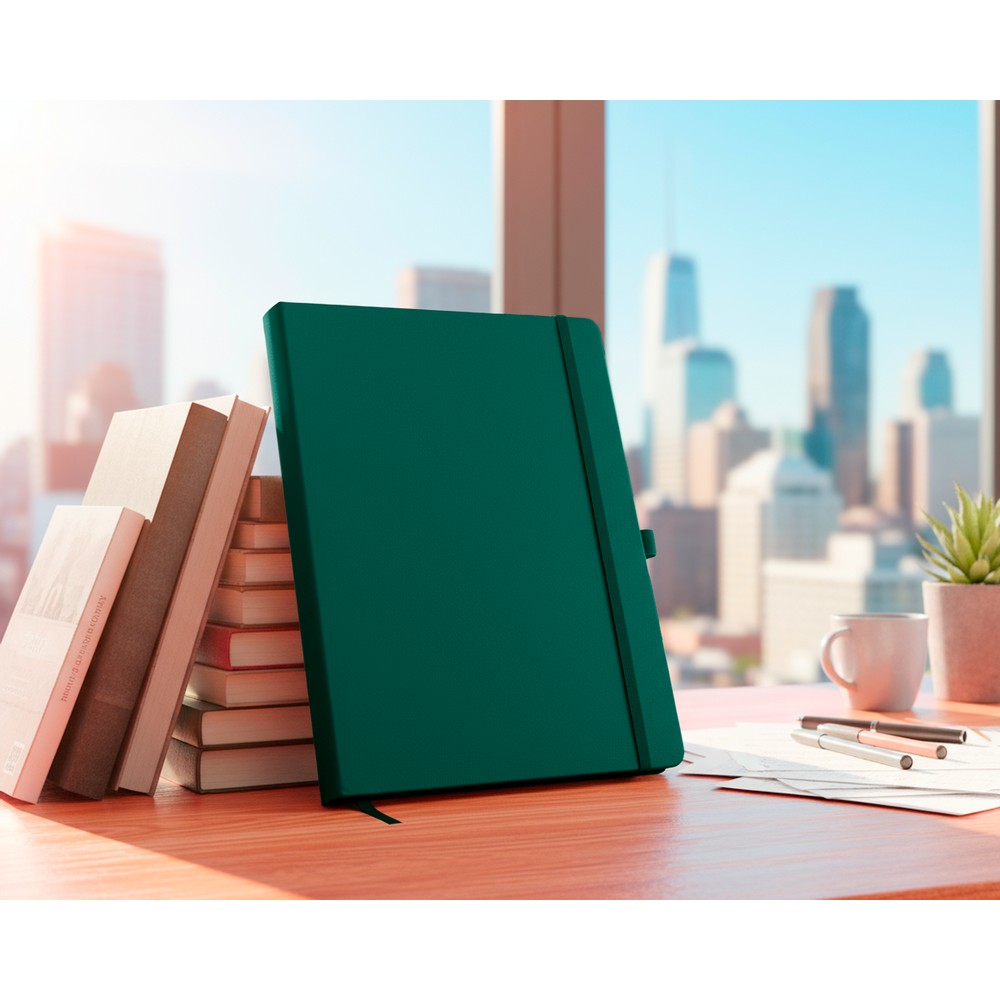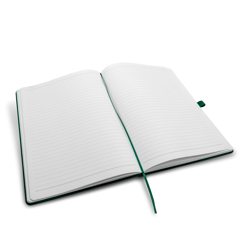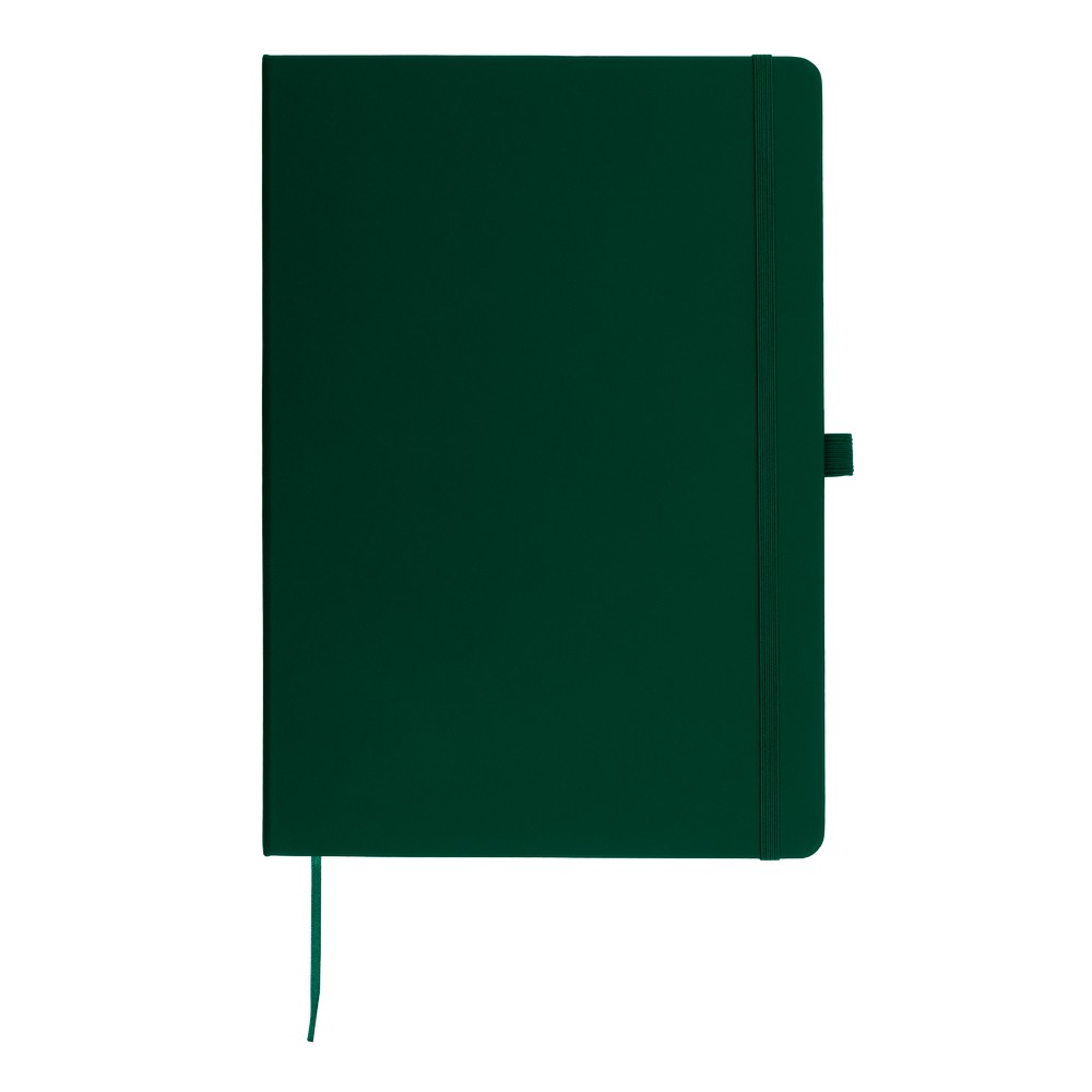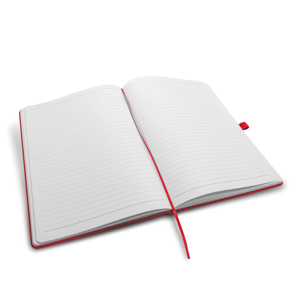 Notatnik w formacie ok. A4, posiada 96 kartek w linie (70 gsm), tasiemka zakładkowa umożliwia wygodne zaznaczanie ostatniej strony lub ważniejszych notatek, dodatkowy gumowy uchwyt na długopis, twarda okładka wykonana z PU