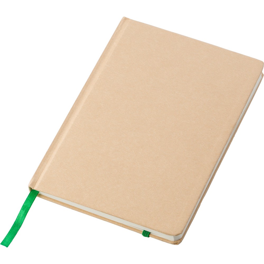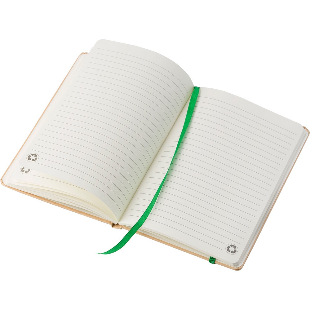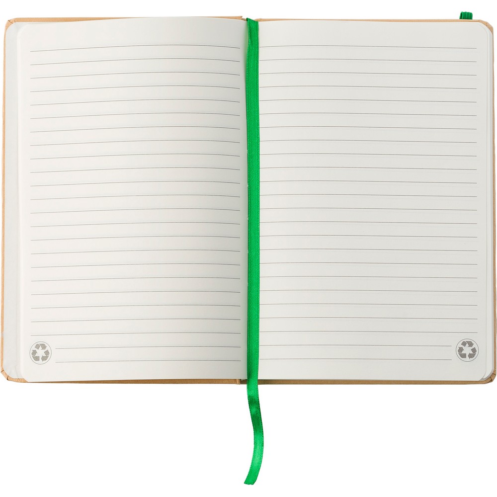 Notatnik (ok. A5, 80 kartek w linie), wykonany z kartonu z recyklingu, tasiemka zakładkowa, elastyczna opaska do zamykania