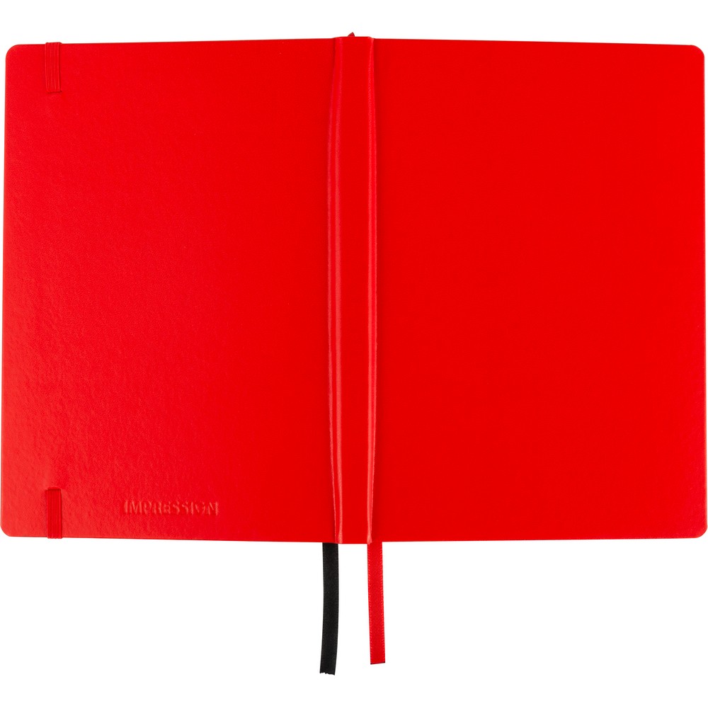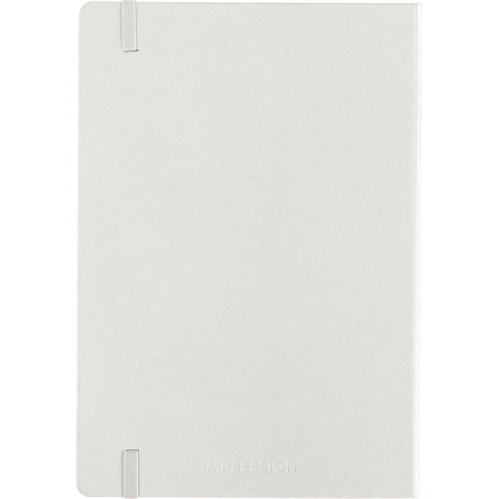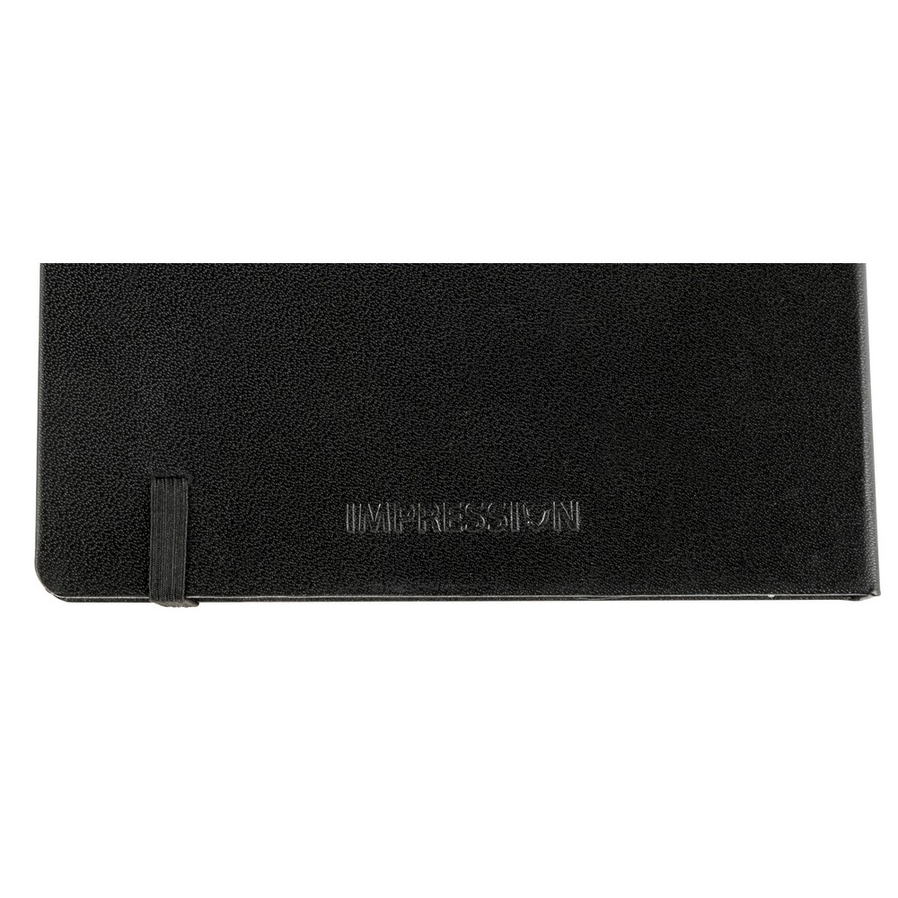 Notatnik (ok. A5, 128 kartek w linie), papierowa kieszeń na wewnętrznej stronie tylnej okładki, elastyczna opaska do zamykania i tasiemka zakładkowa, tylna okładka z logo IMPRESSION